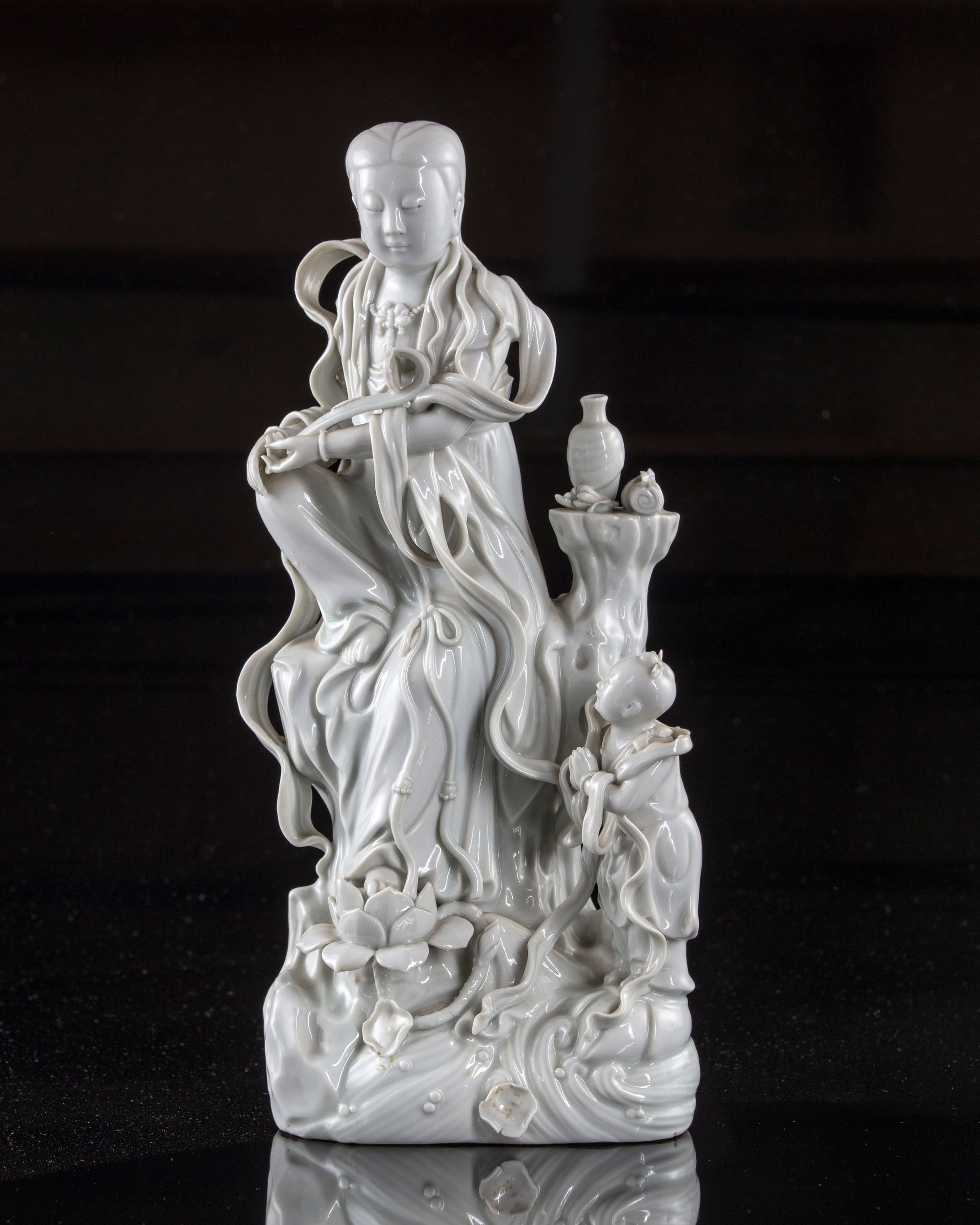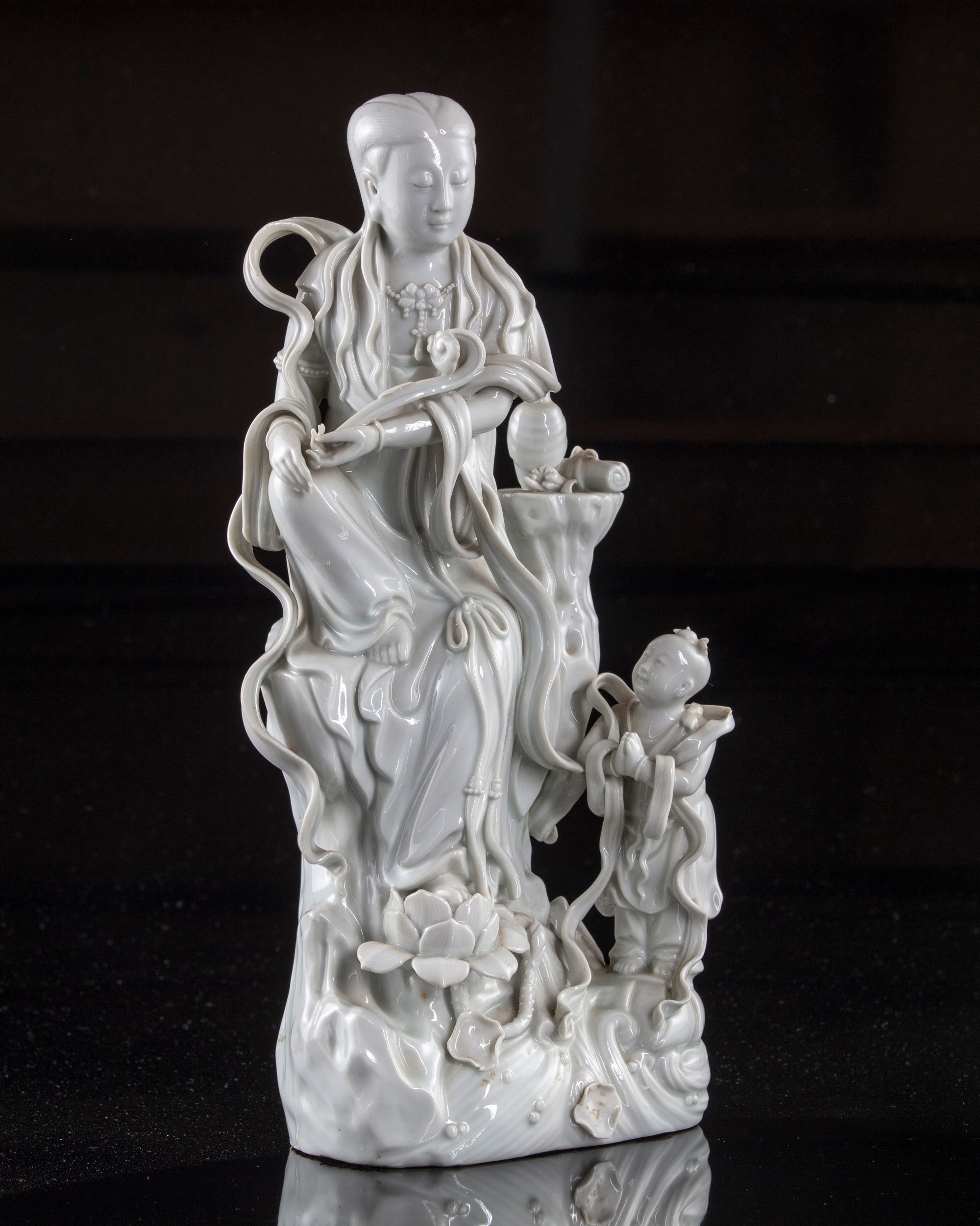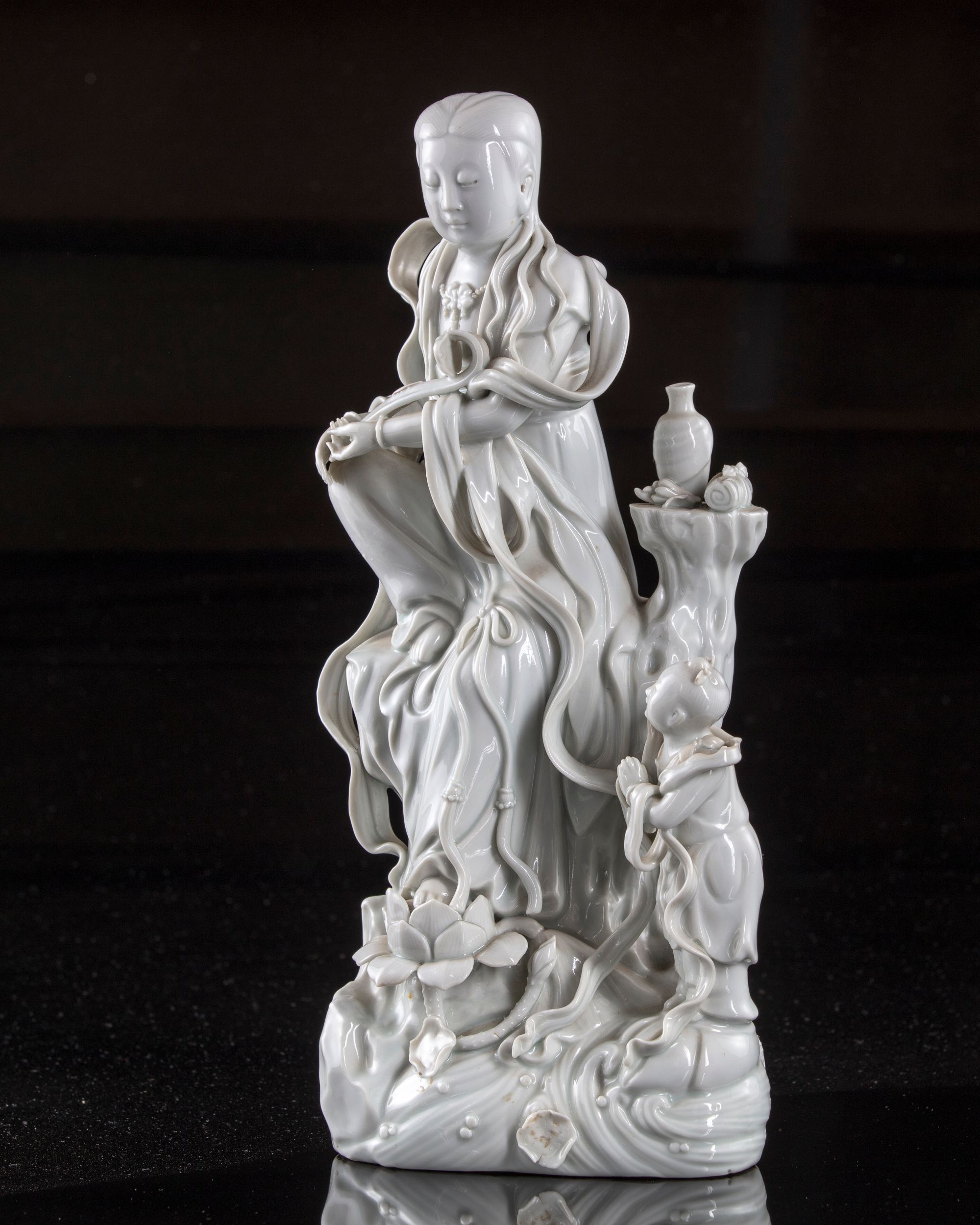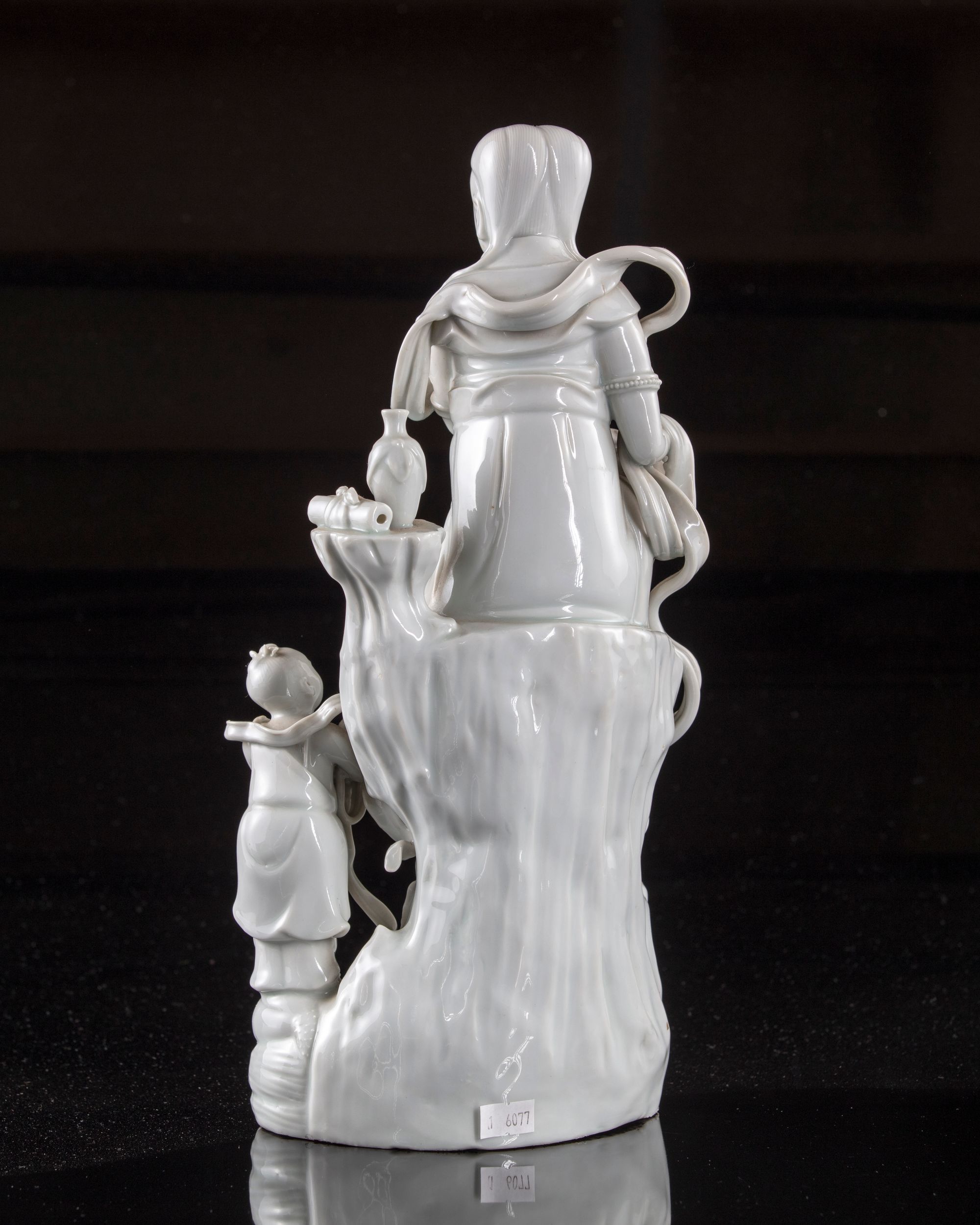 A CHINESE DEHUA GLAZED FIGURE OF GUANYIN AND A BOY, QING DYNASTY (1644-1911)