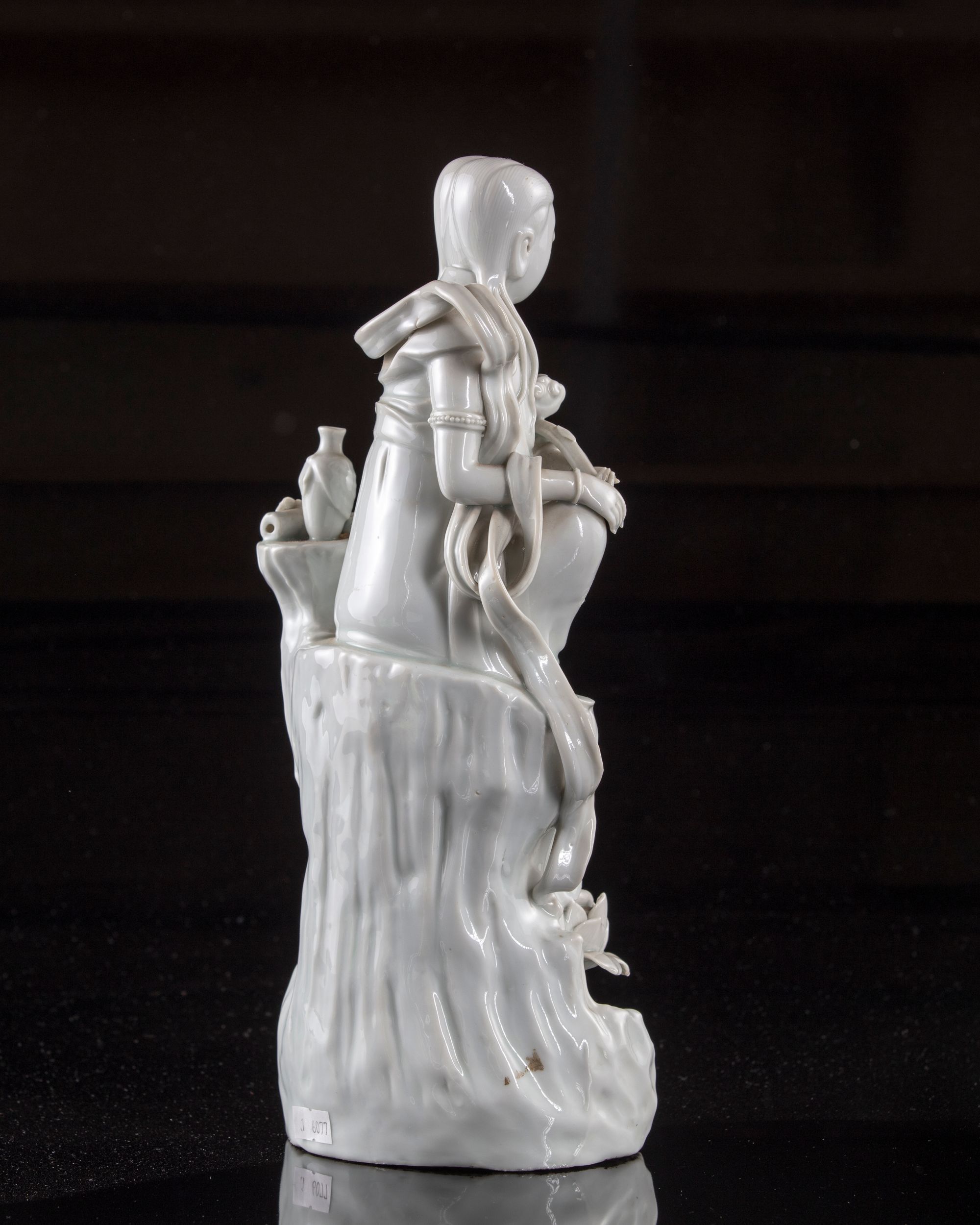 The Guanyin is seated on a rock with one leg raised, wearing long robes and, her face is rendered serene below neatly combed hair. The boy is standing to the left. The figure is covered with a cream glaze.