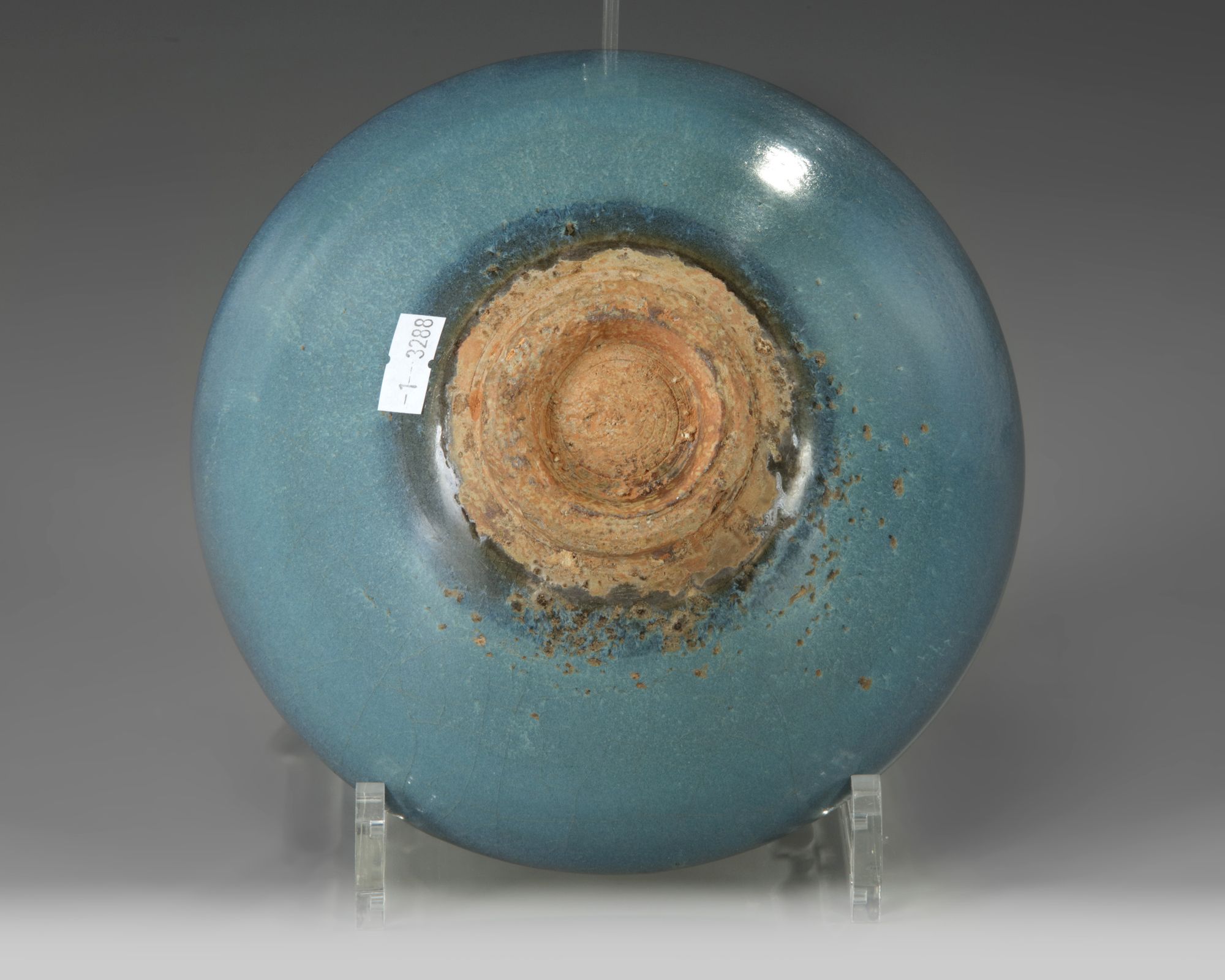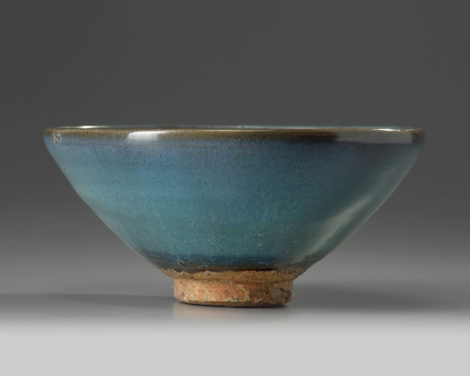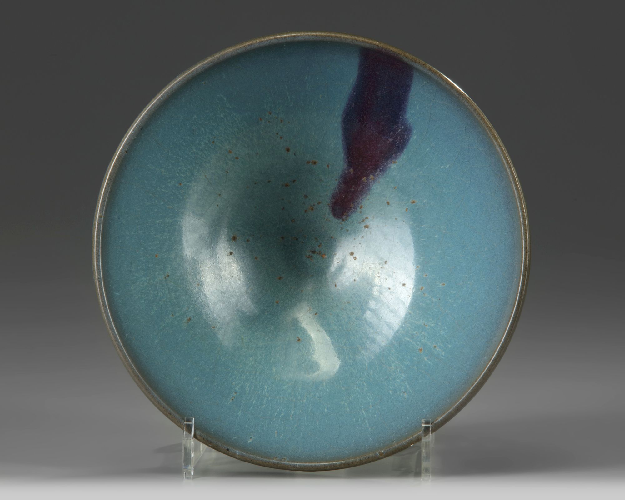 The bowl is crafted in a Junyao style, covered to the interior and exterior with a vibrant turquoise glaze which darkens to a greyish-blue at the rim. The interior is decorated with a bright purple splash. The foot and base is left unglazed.