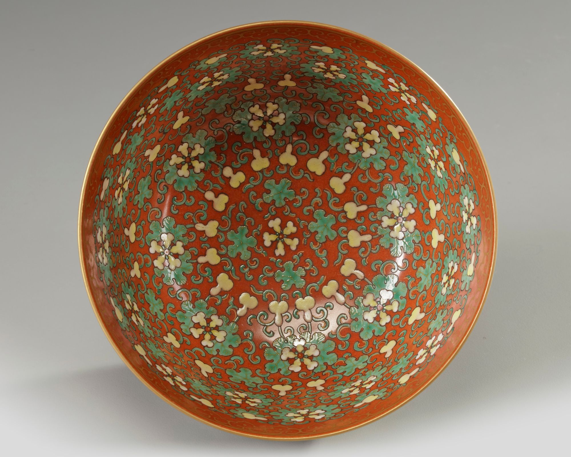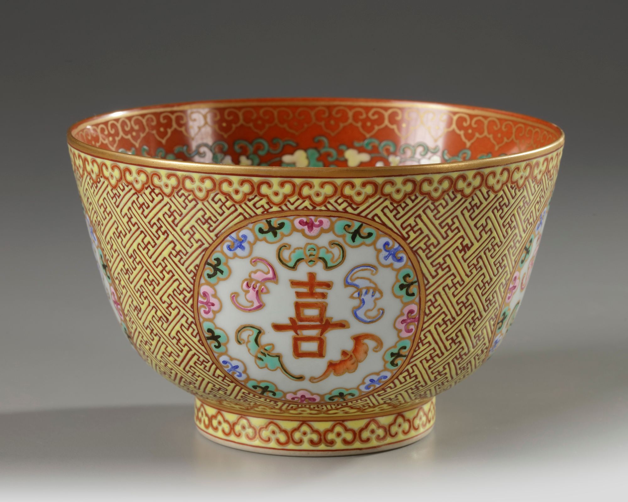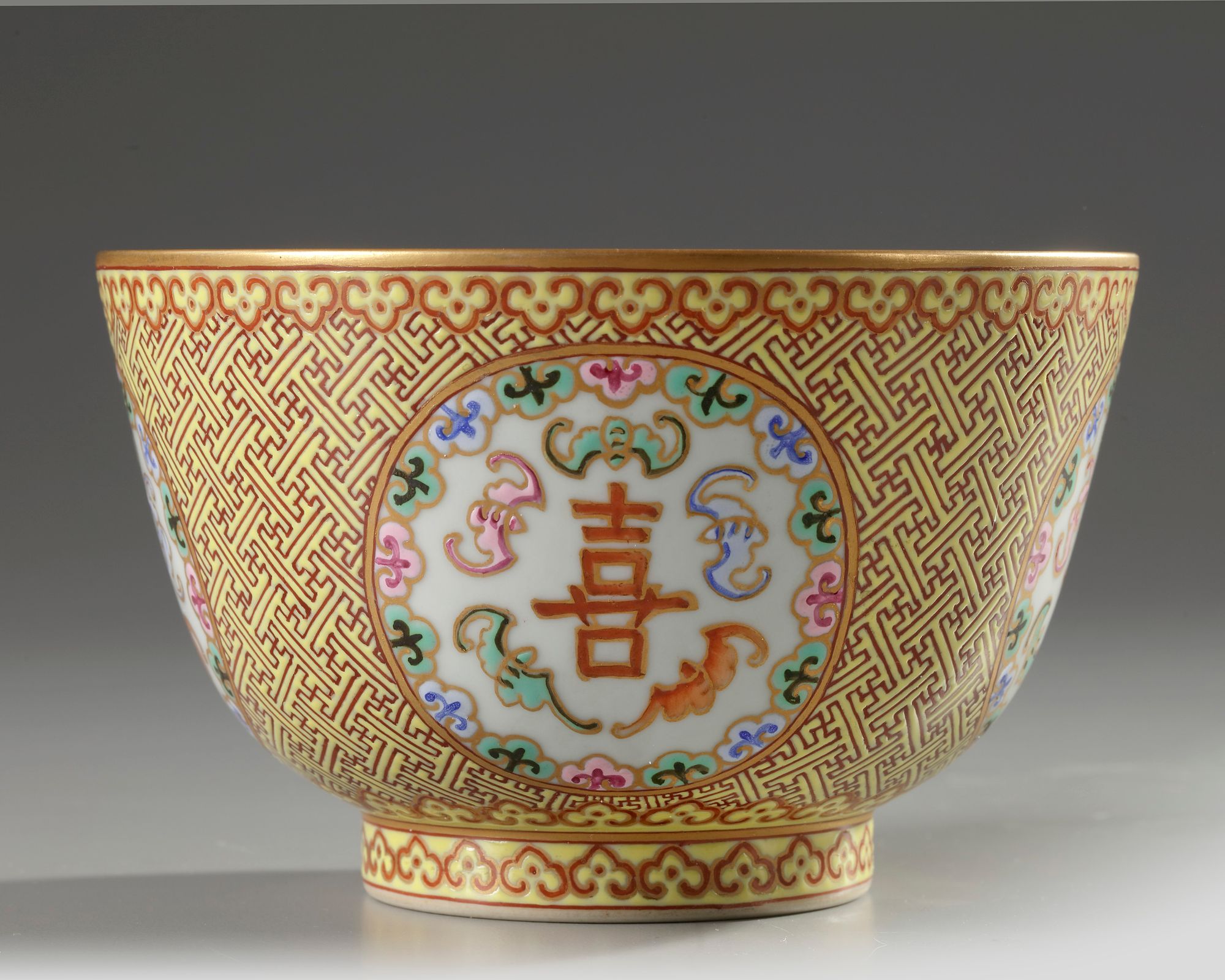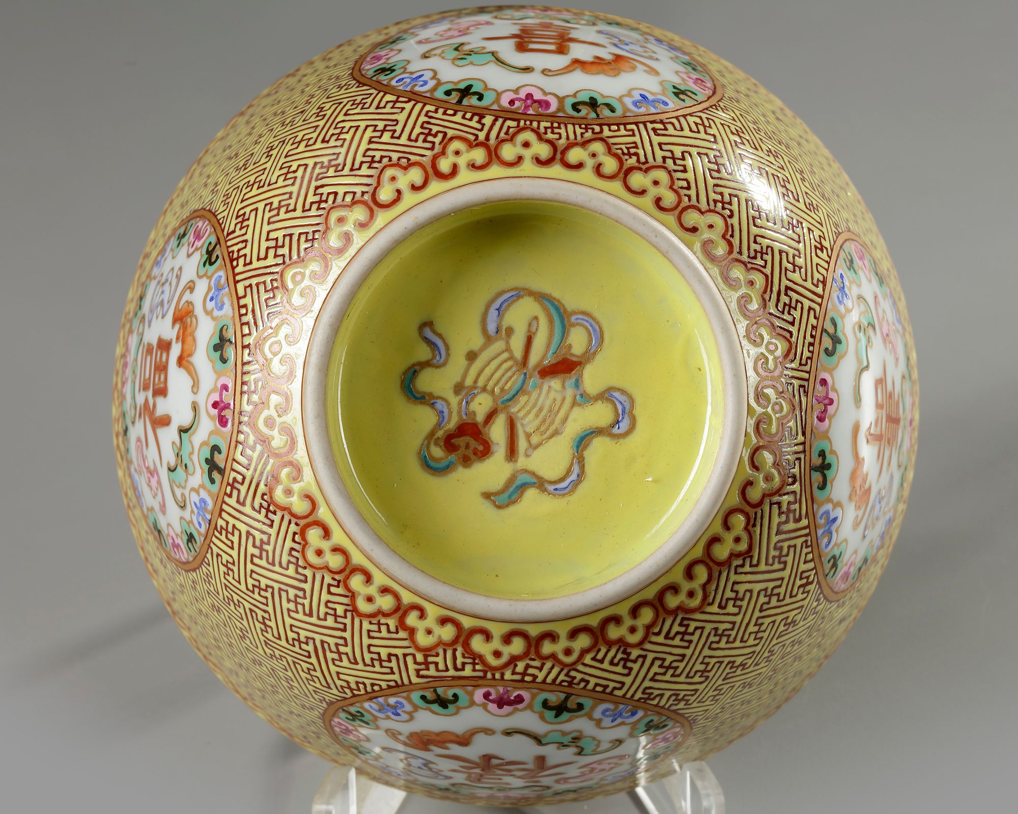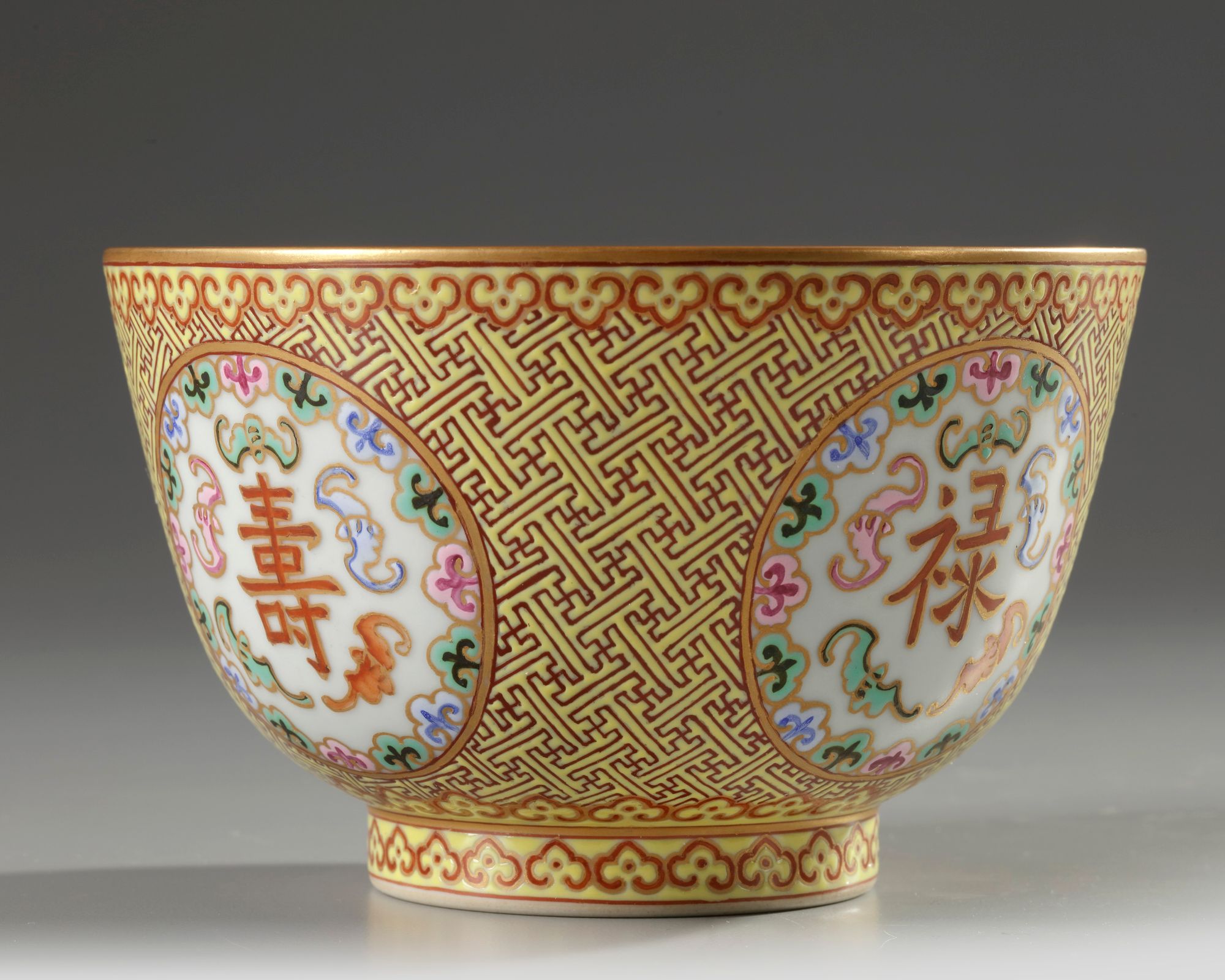 The bowl is decorated to the exterior with four roundels enclosing the characters 'fu', 'lu', 'shou', and 'xi', each surrounded by five bats and ruyi heads, all on a brocade ground between two bands of ruyi heads. The interior is decorated with a multitude of gourds on leafy vines. The yellow-enamelled base is marked with a brush, ruyi, and ingot mark.