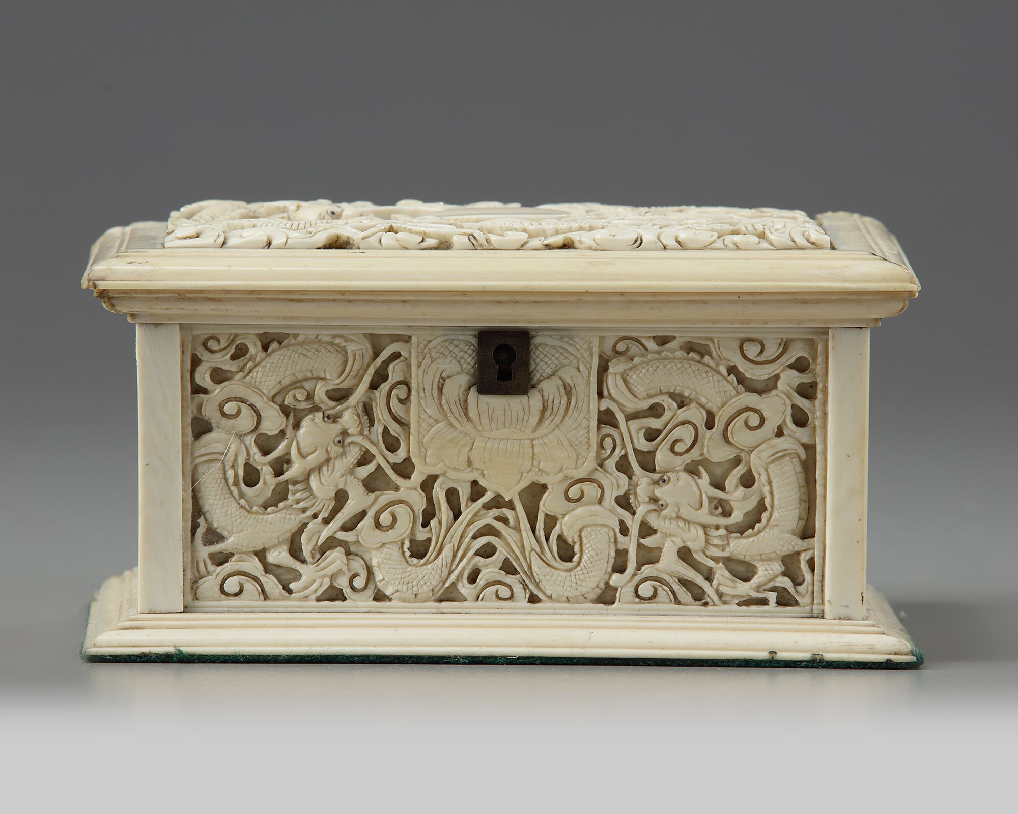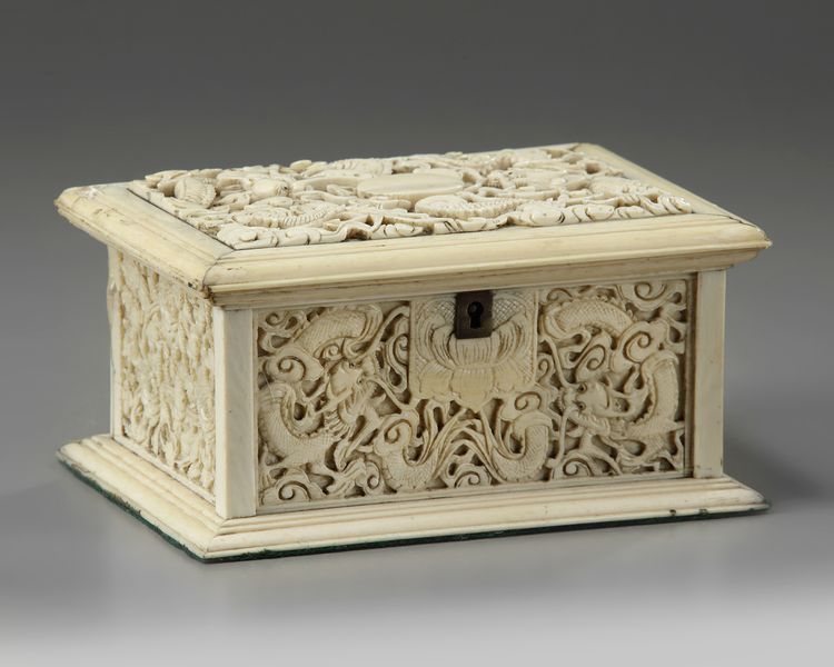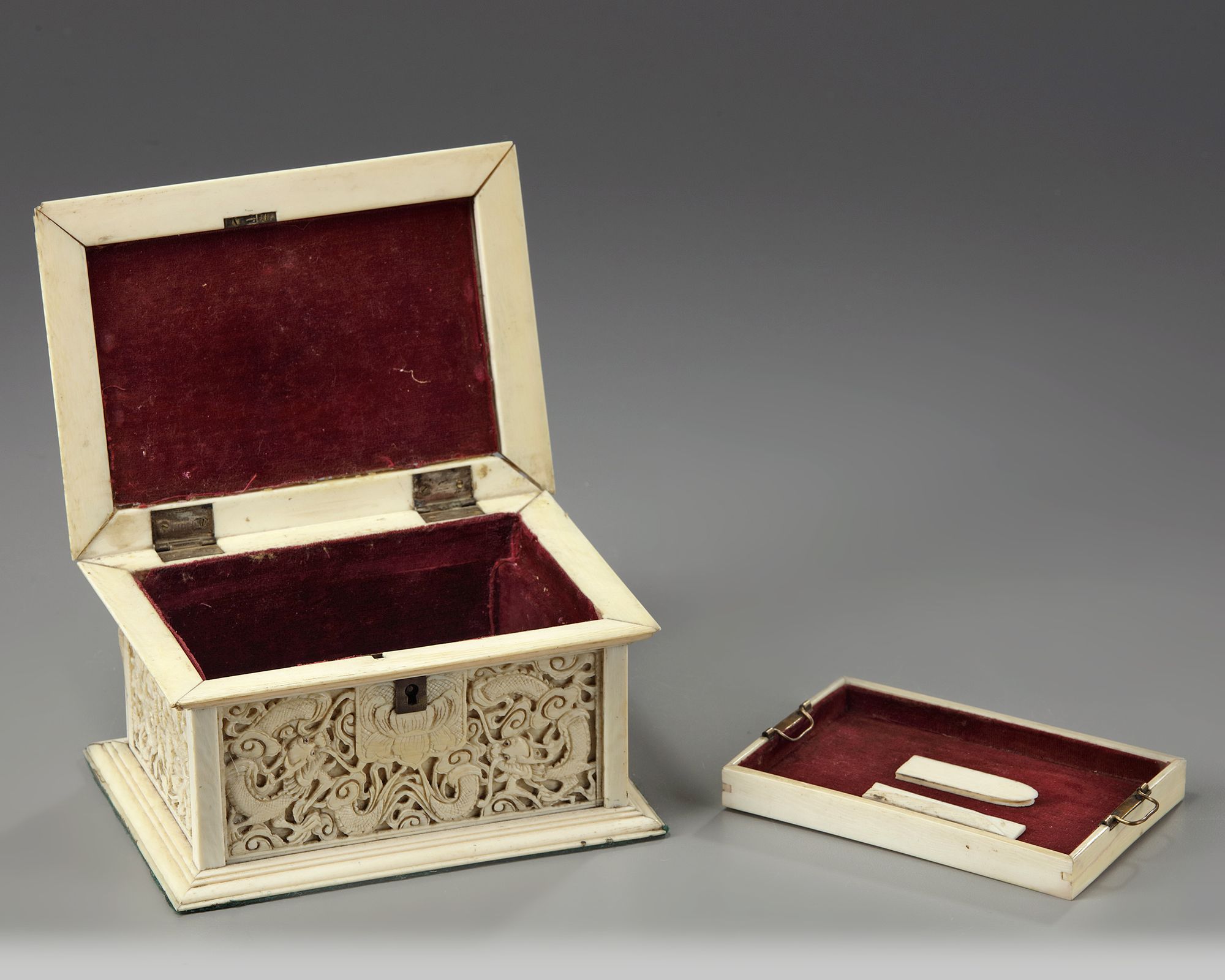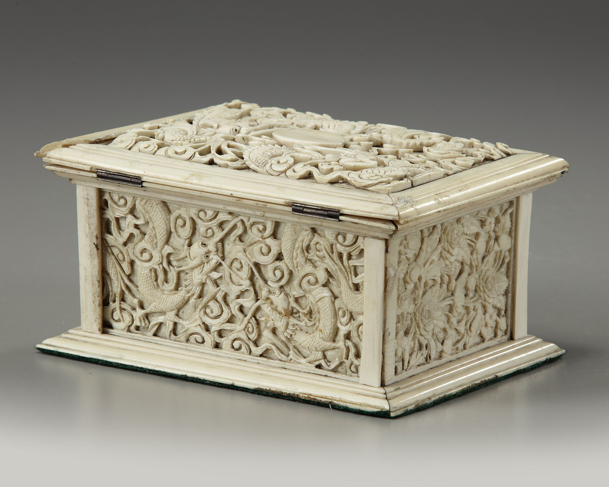 The exterior of the box is carved with dragons coiled amongst cloud scrolls and flowers, the cover with an uncarved cartouche. The interior is fitted with a tray.