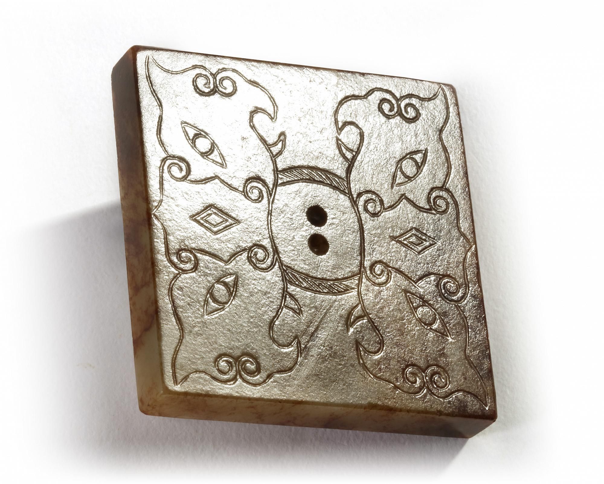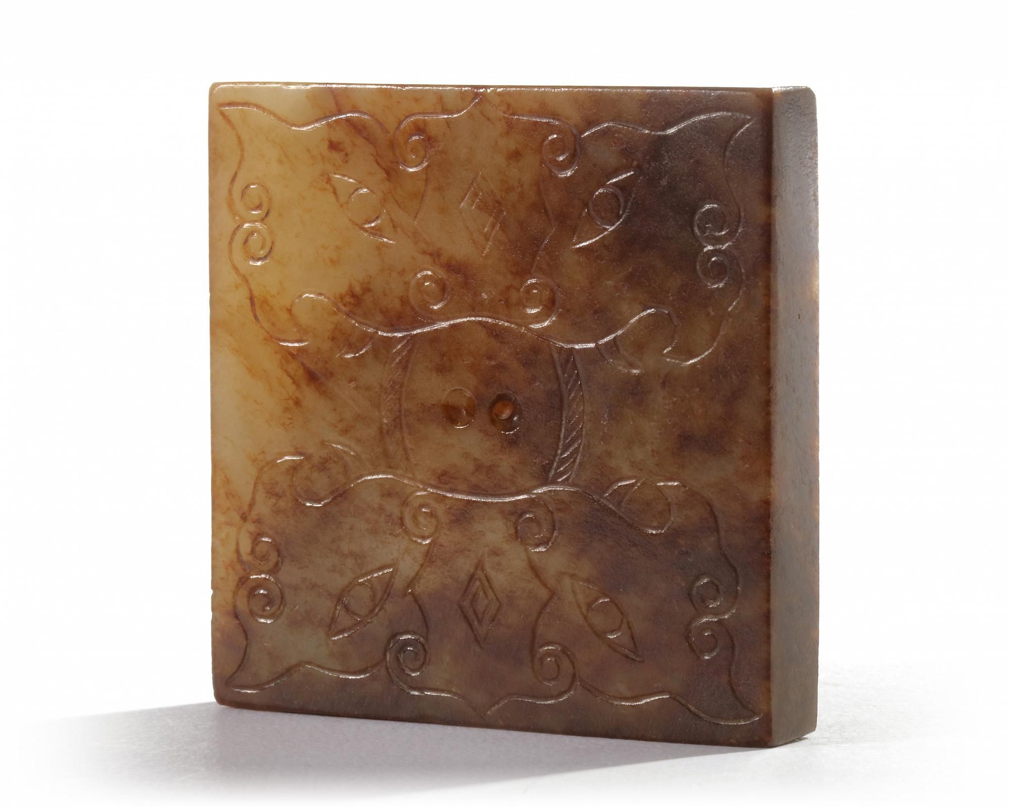 The plaque is carved to one side in low relief with a figure walking towards a pavilion in a mountainous landscape with an accompanying inscription. The reverse is carved with a hole for suspension surrounded by two incised taotie masks.