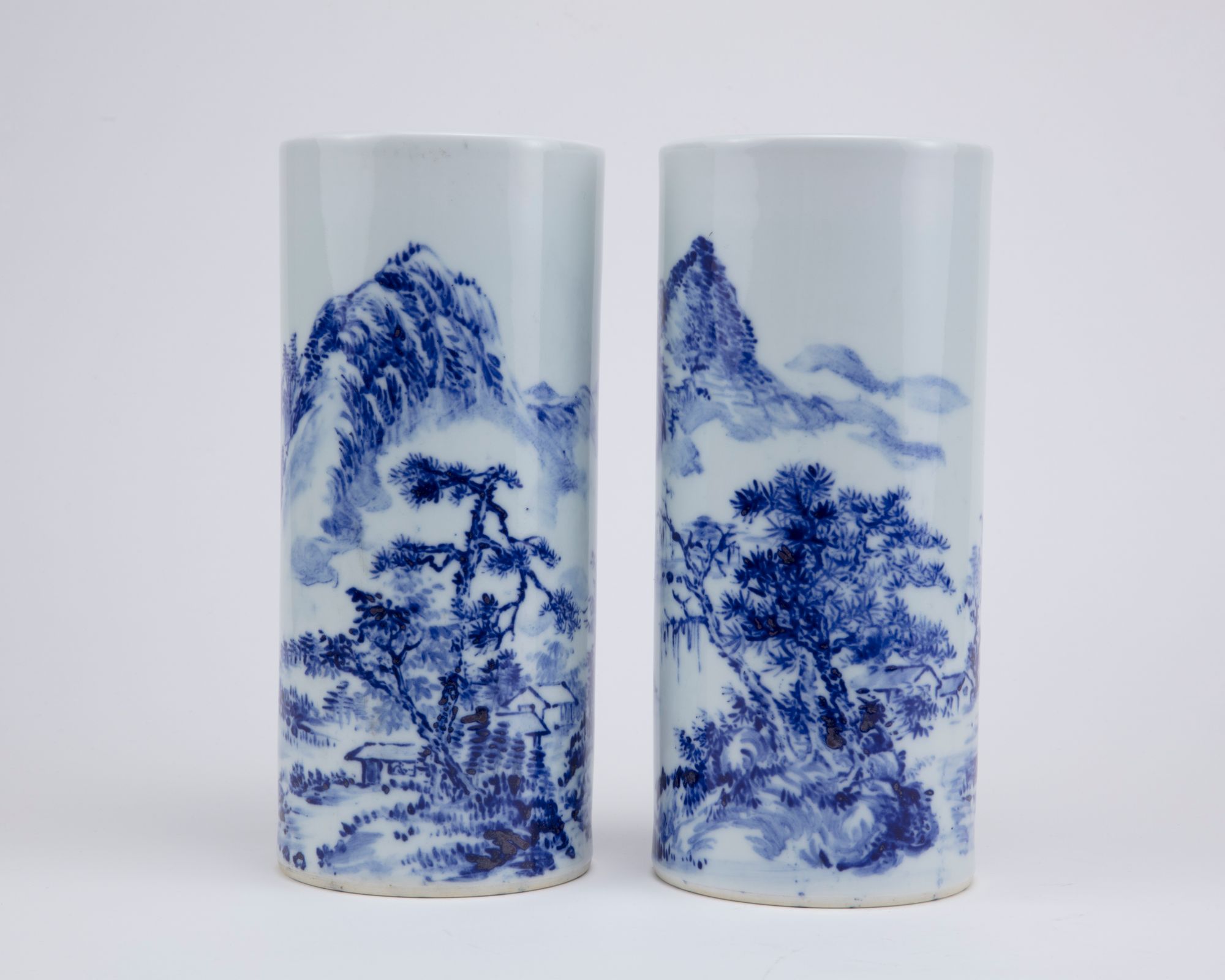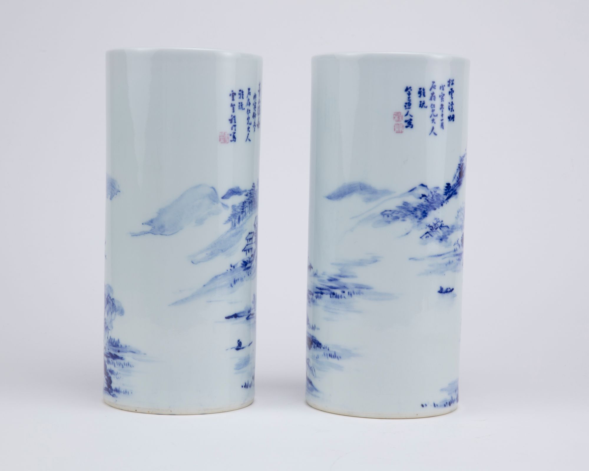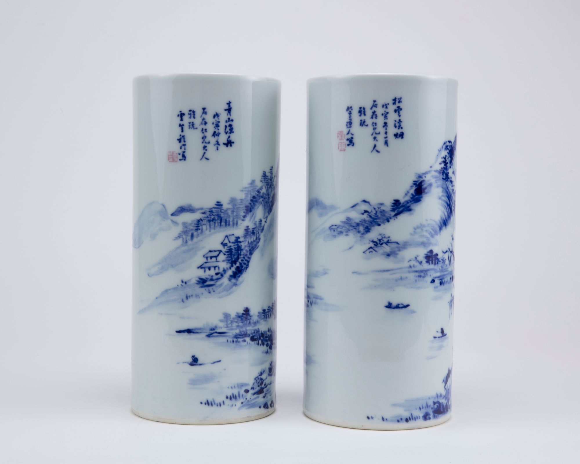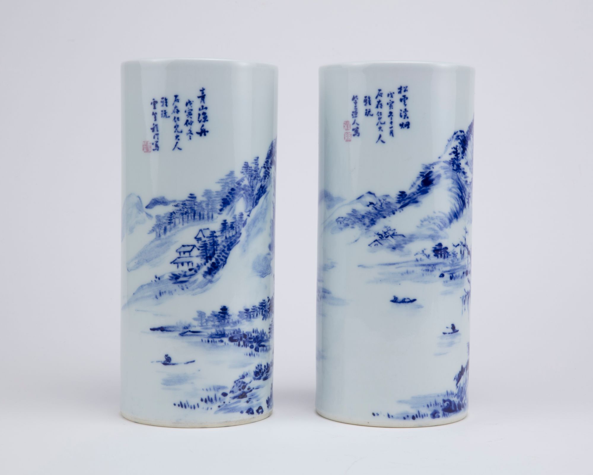 Each vase is decorated with pavilions and pine trees in a mountainous river landscape and entitled, dated wuyin year, dedicated, and one signed Cheng Men with a seal in underglaze copper red.