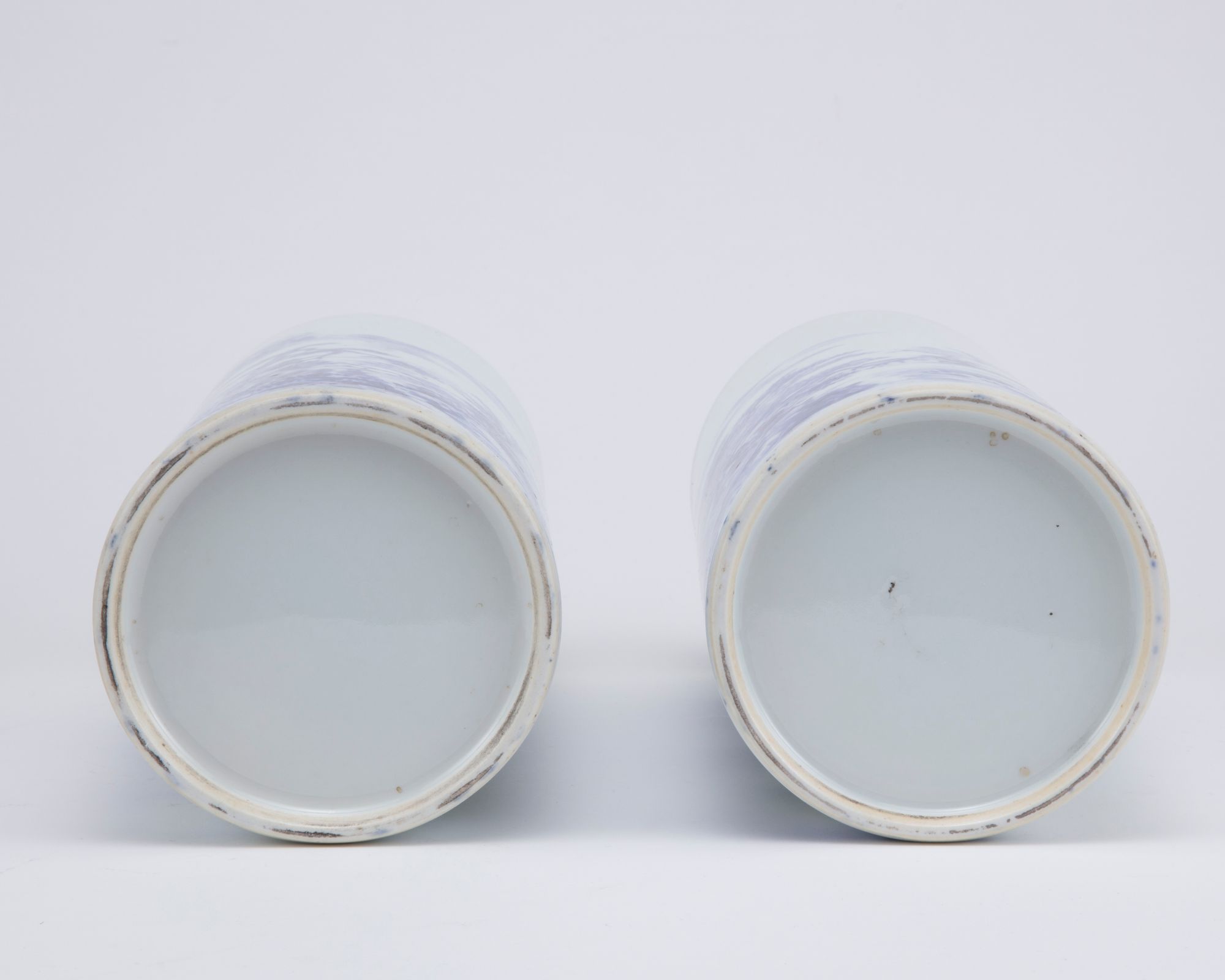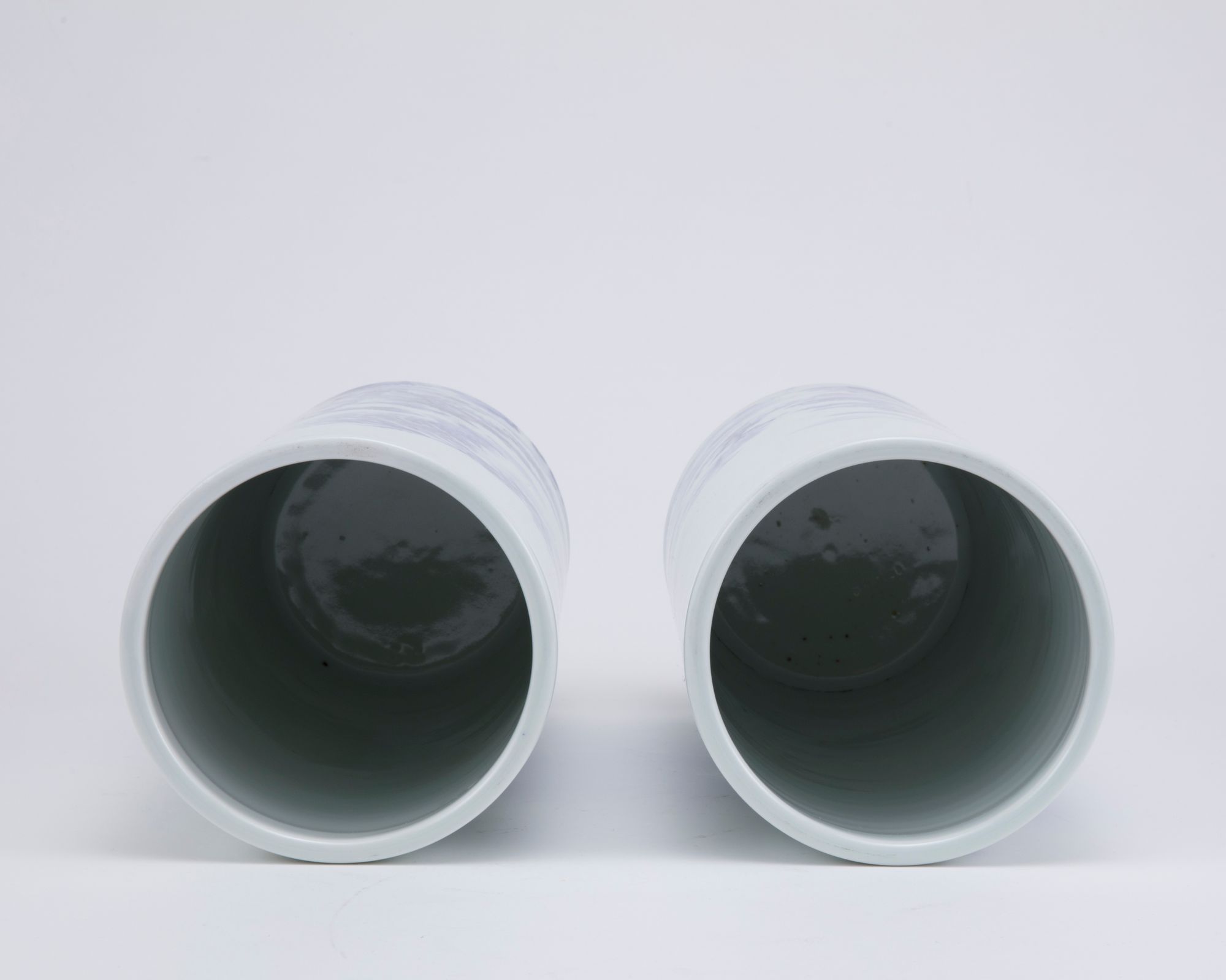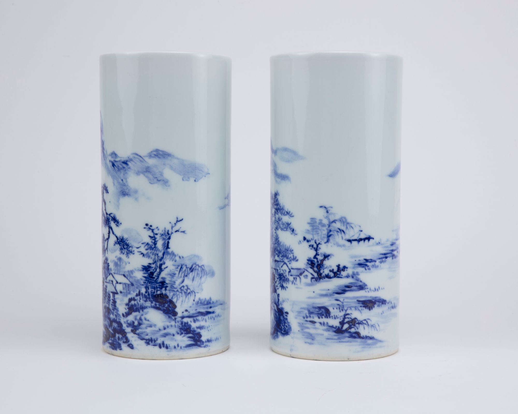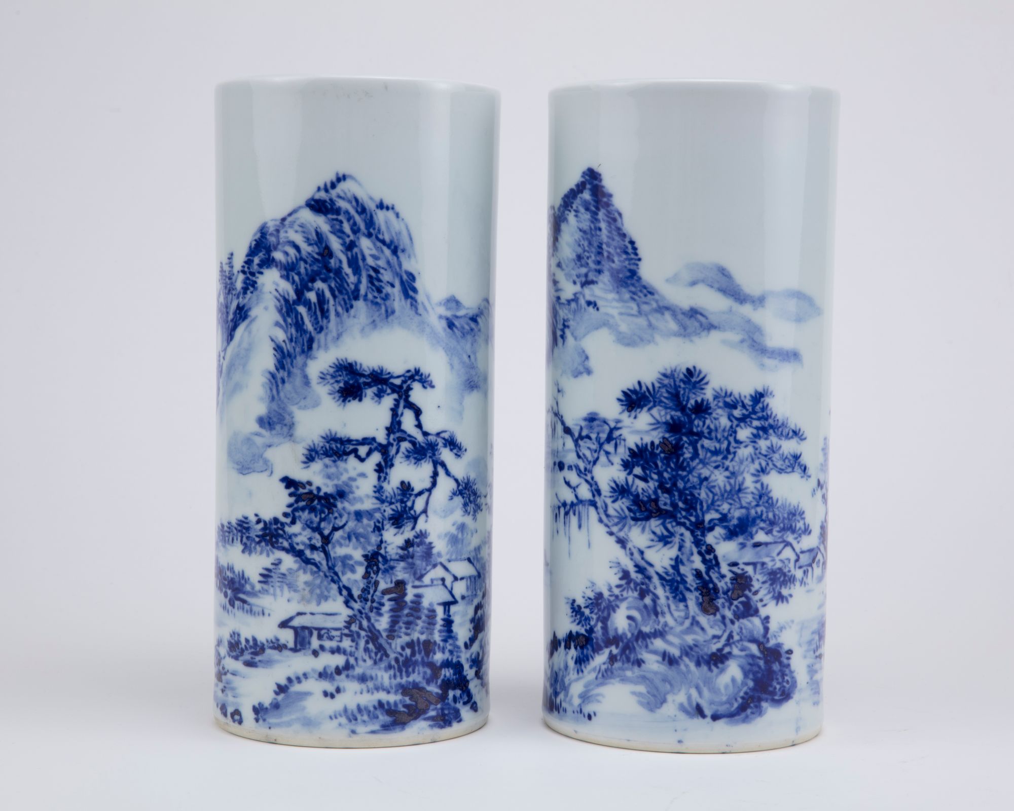 Each vase is decorated with pavilions and pine trees in a mountainous river landscape and entitled, dated wuyin year, dedicated, and one signed Cheng Men with a seal in underglaze copper red.