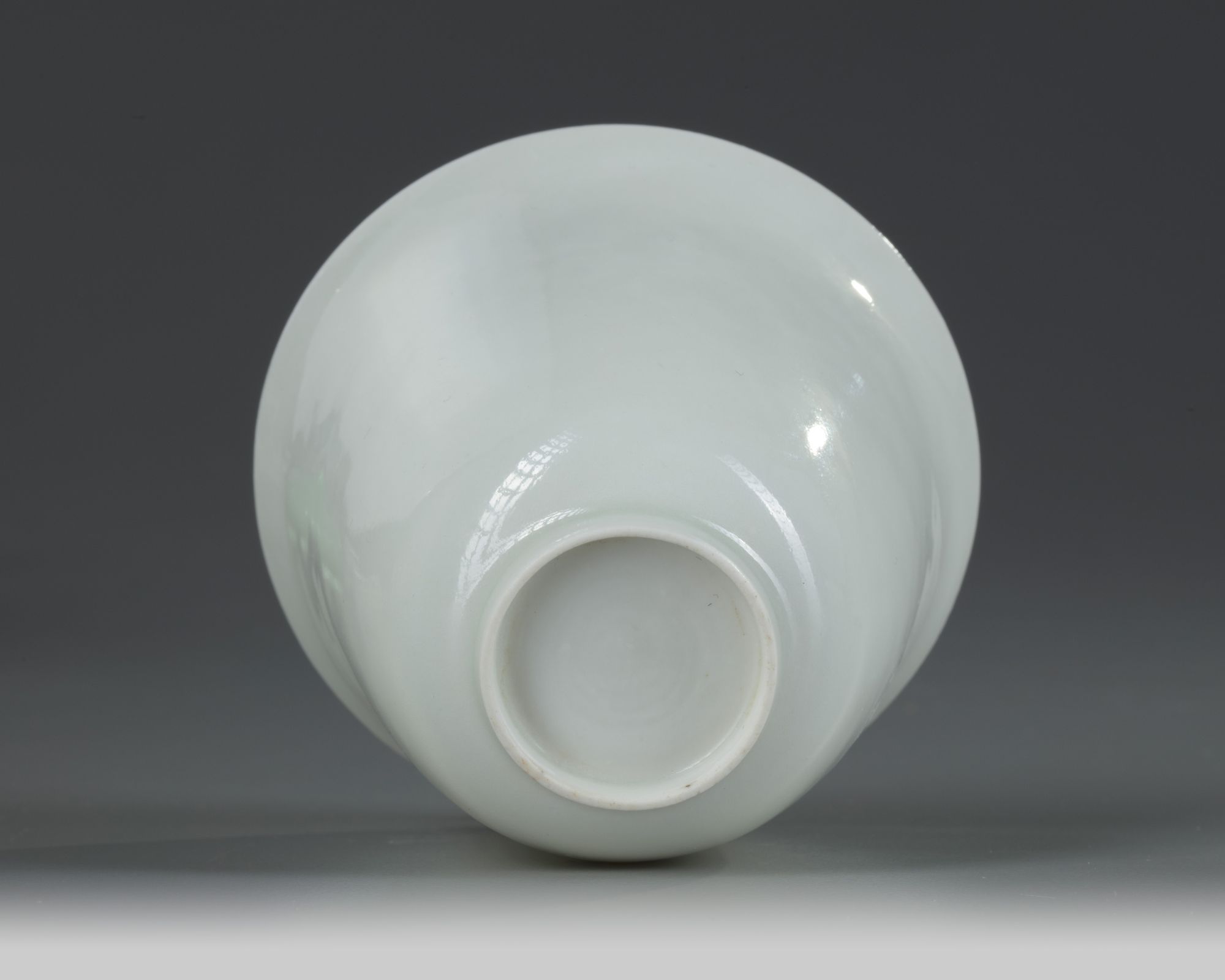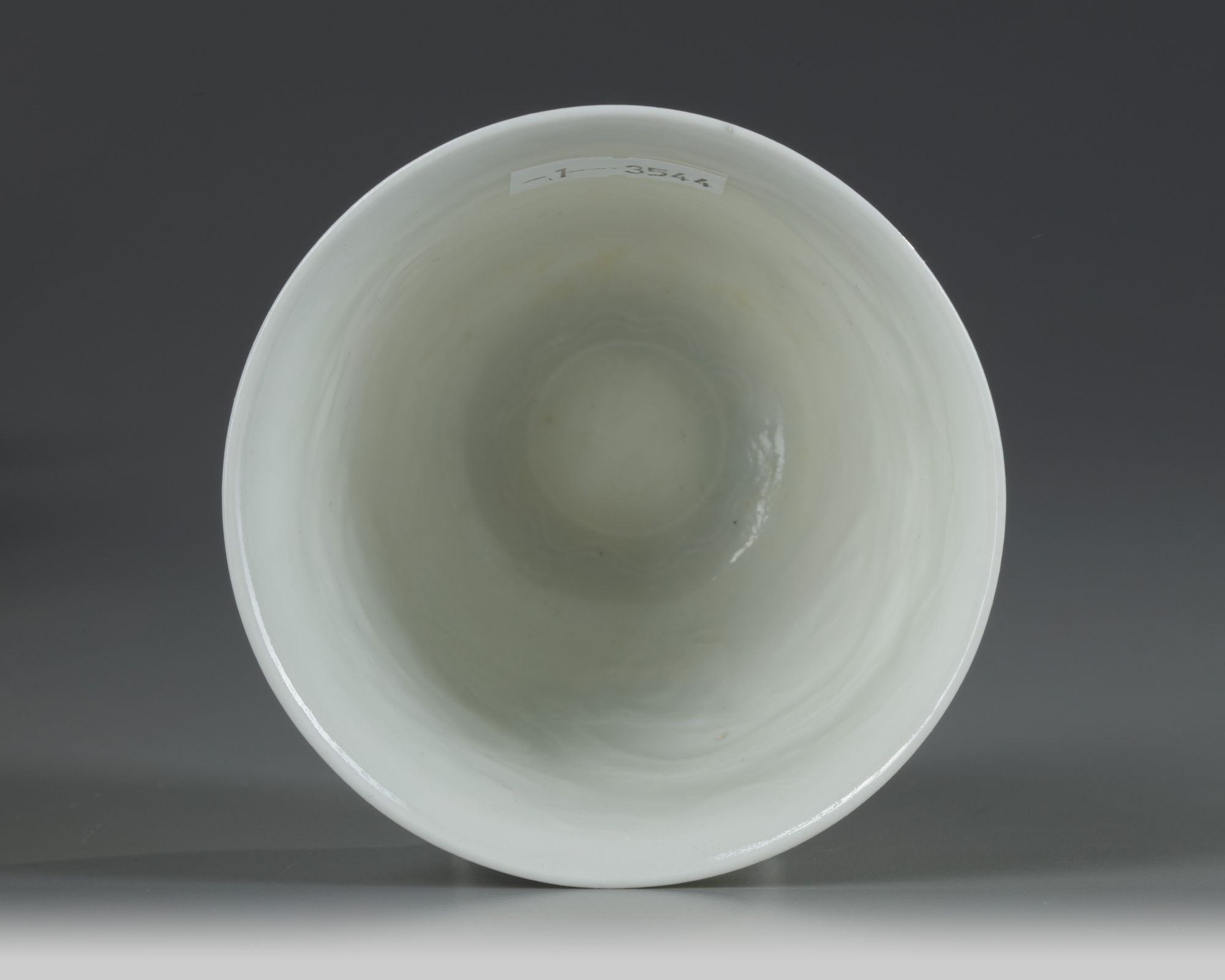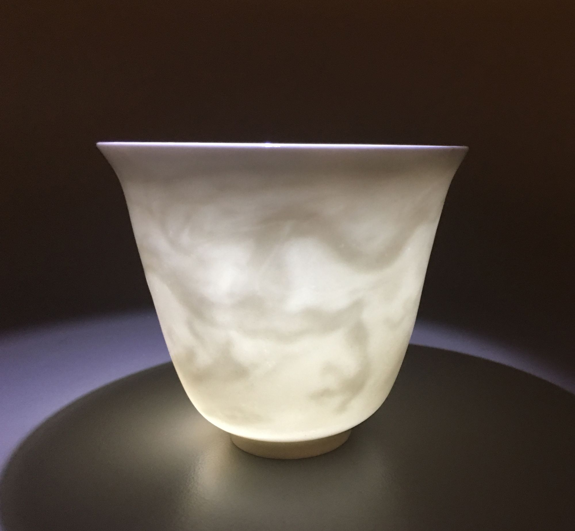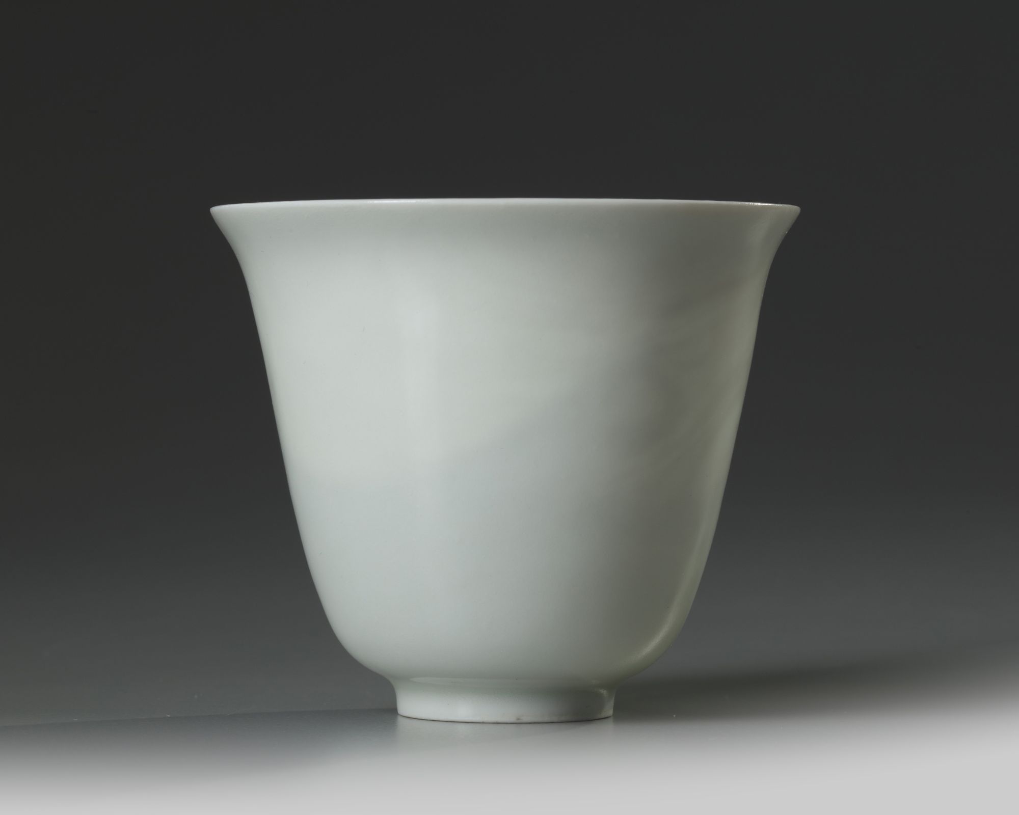 The eggshell-thin cup is moulded to the interior with a striding dragon amongst flame scrolls, encircling an apocryphal Yongle mark in archaic script.