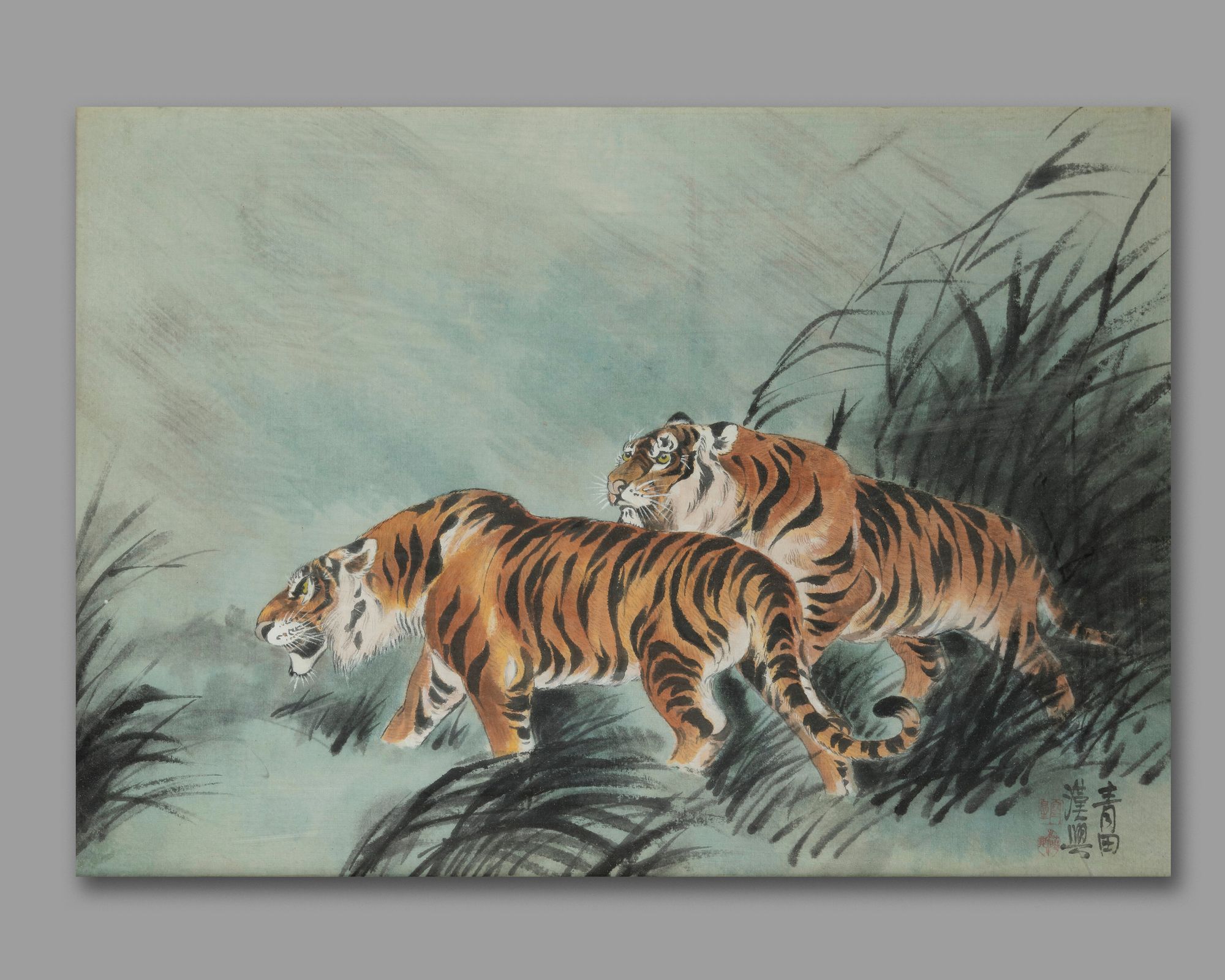 Ink and colour on silk. Depicting two tigers amongst grass. Inscribed reading 'Qing Tian Han xing' with two seals in iron red. 69 by 49.5 cm