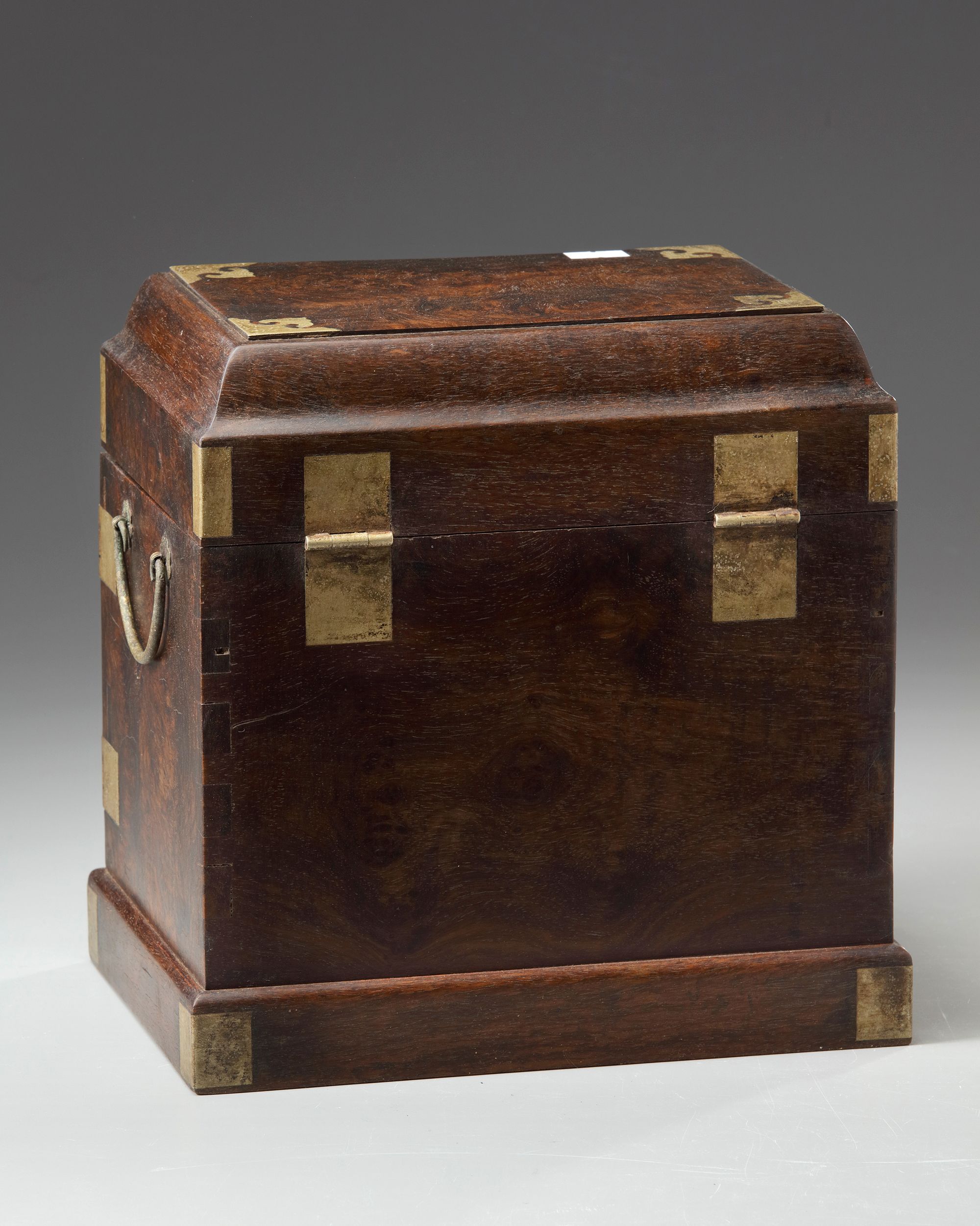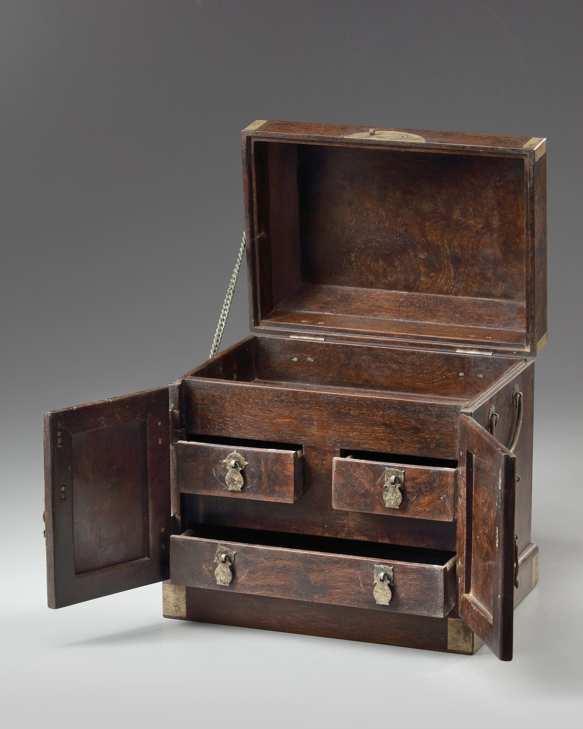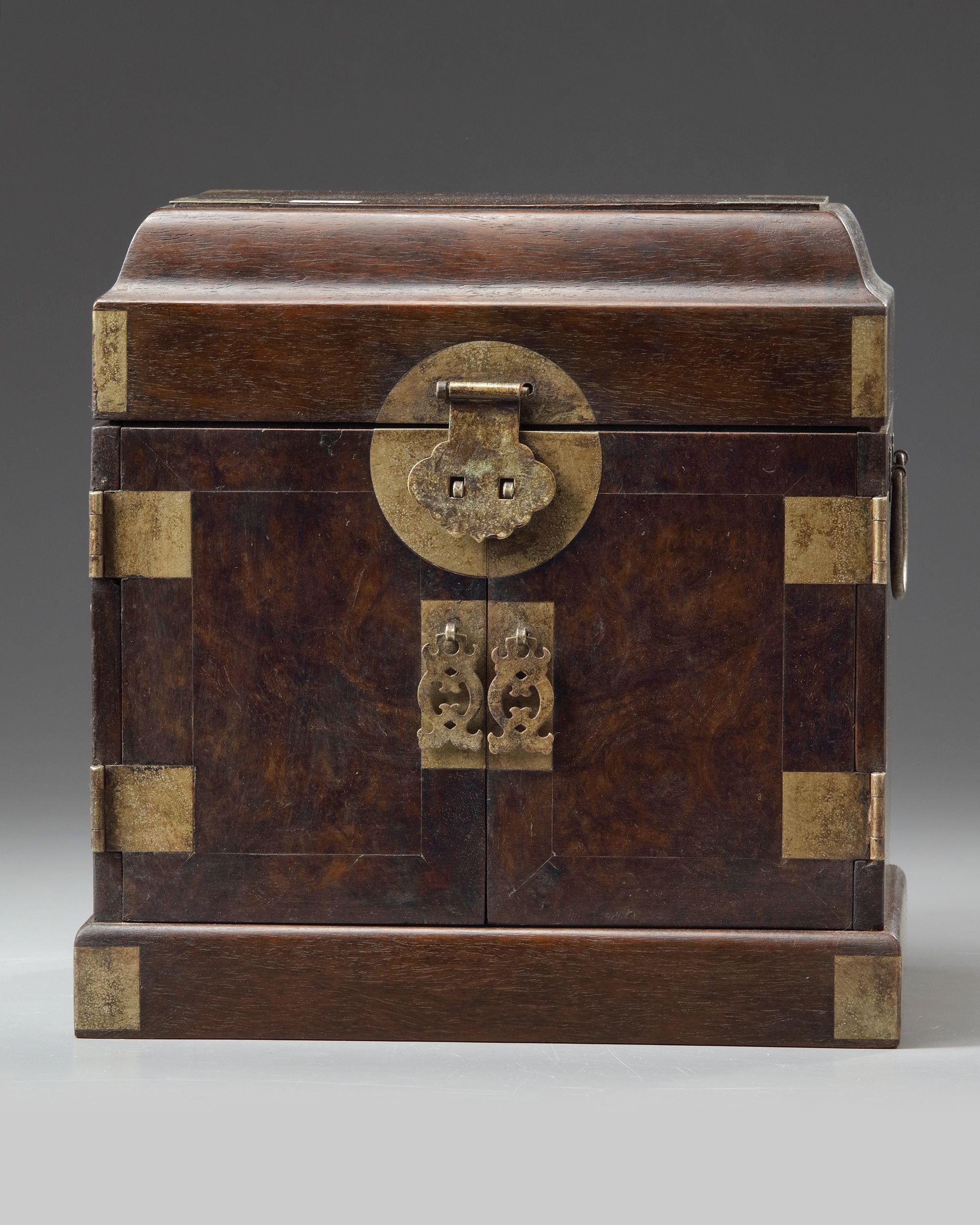 The box is composed of a top compartment with a hinged cover, and doors at the front that open to reveal four drawers. The cabinet is fixed with brass hardware and handles. 25.5 x 25 x 18 cm. Please note: this lot contains hongmu and is therefore subject to the relevant trade restrictions in correspondence with CITES regulations. Customers should familiarize themselves with the relevant CITES regulations before bidding. More information can be obtained through the saleroom.