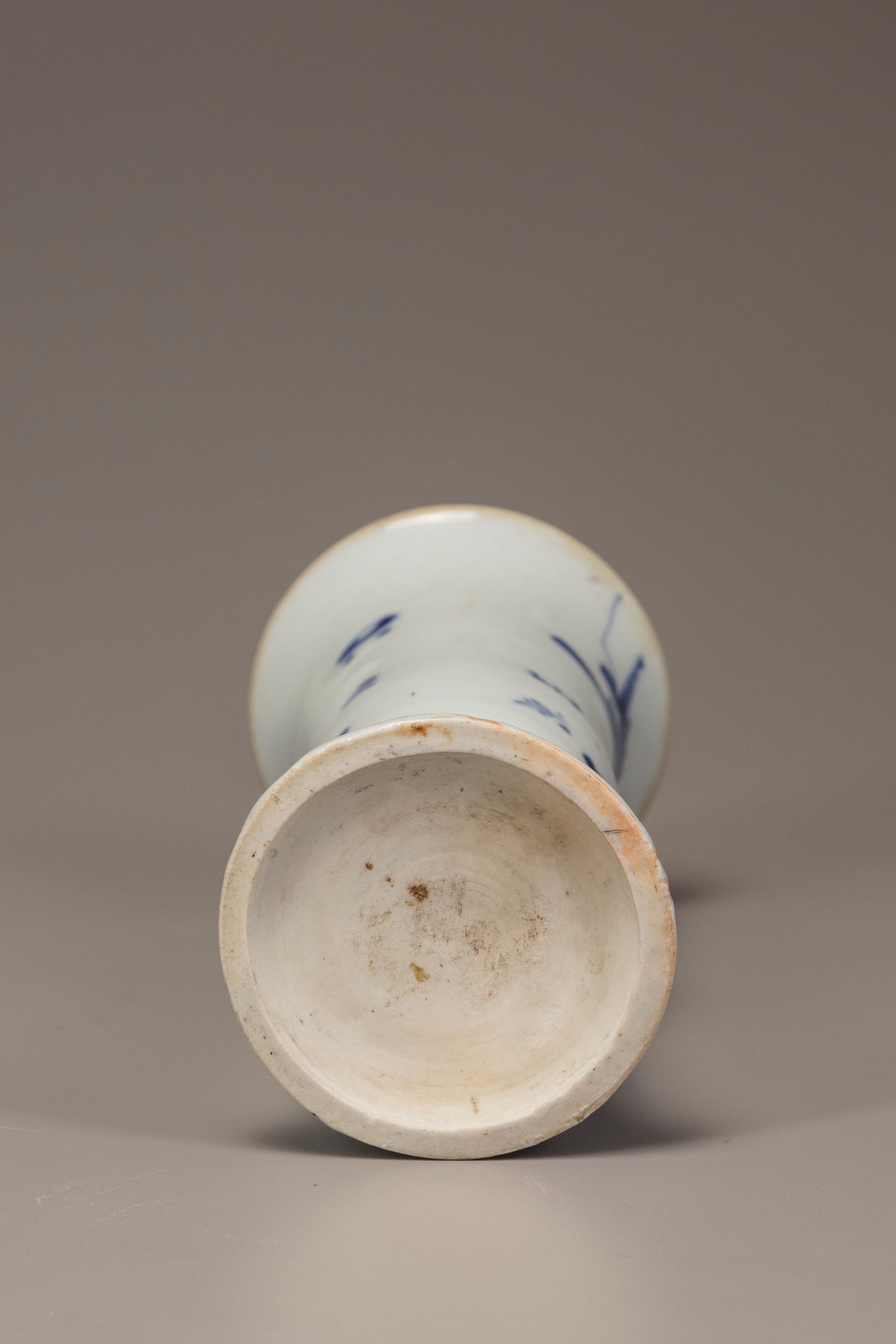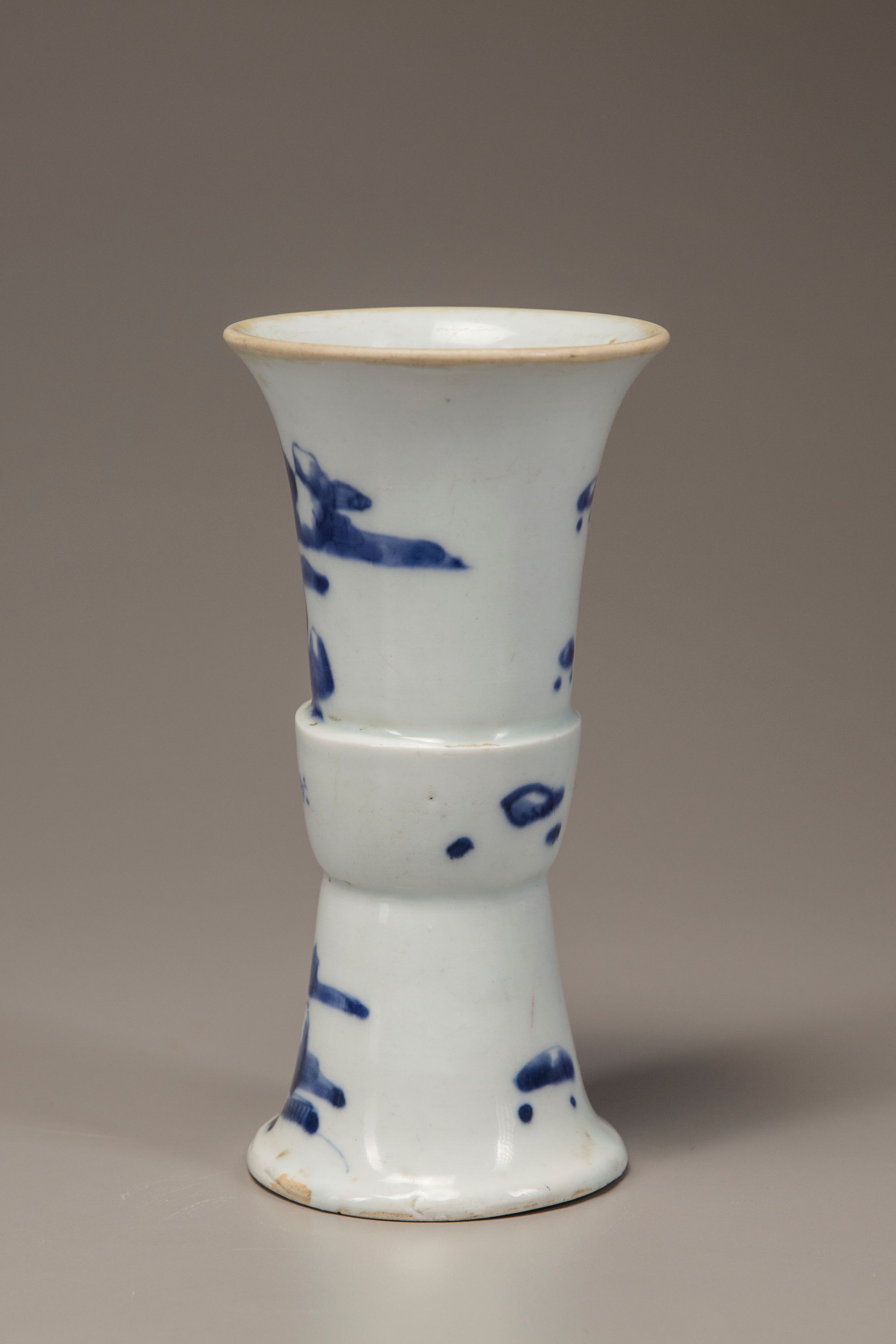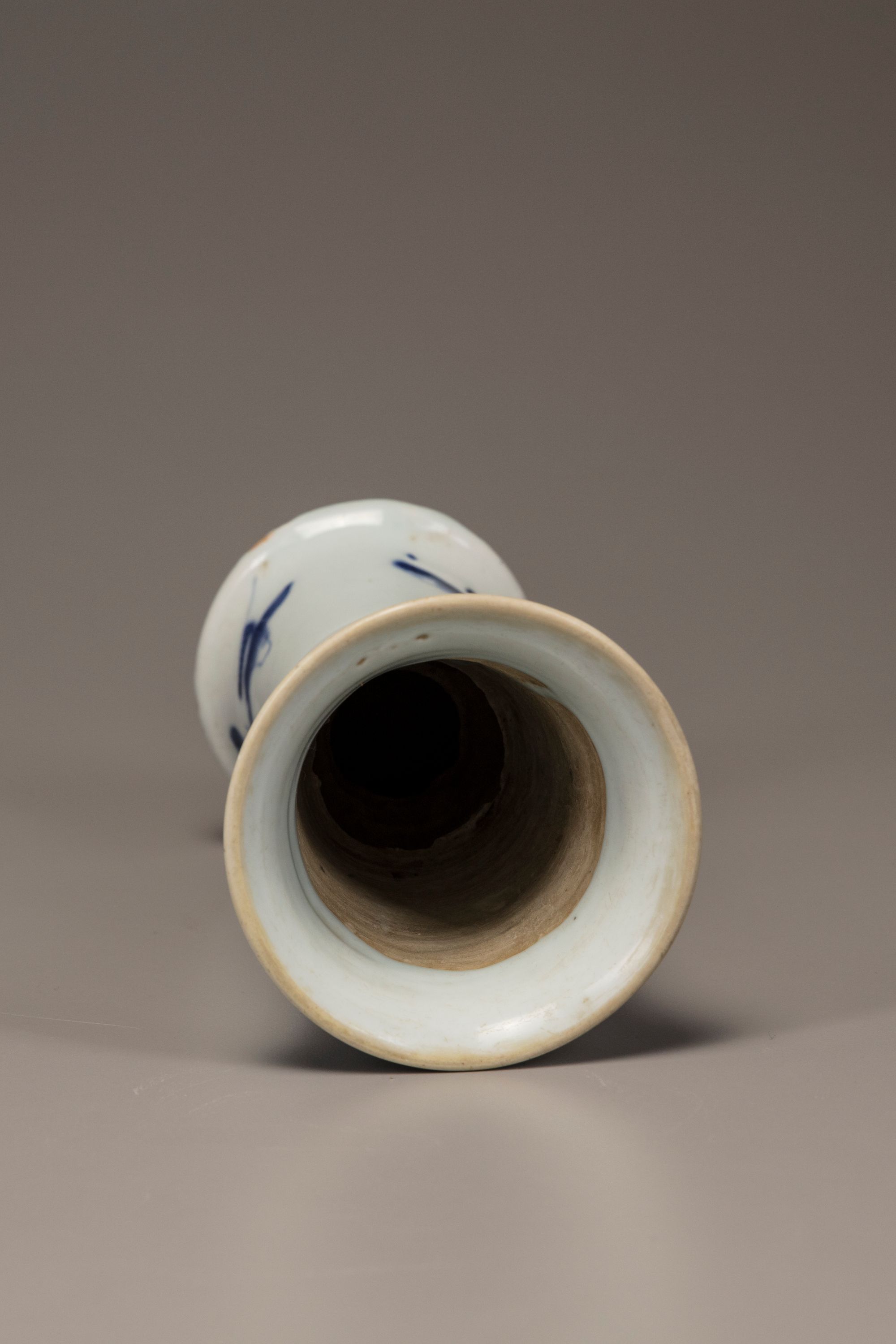 The vase is decorated in various shades of cobalt blue to the upper section with scholars in a rocky landscape, the middle section with precious symbols, and the lower section with precious objects amongst rocks.