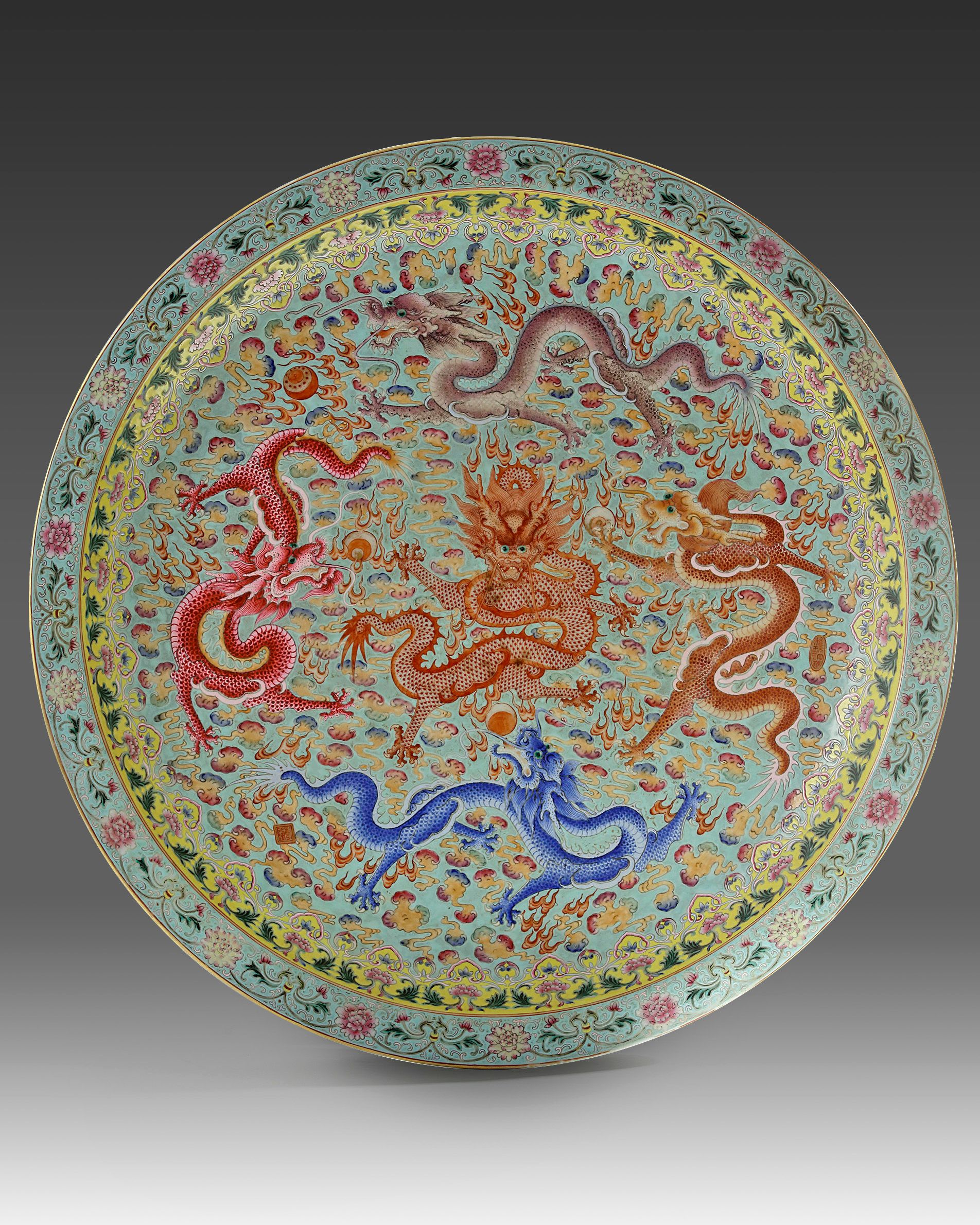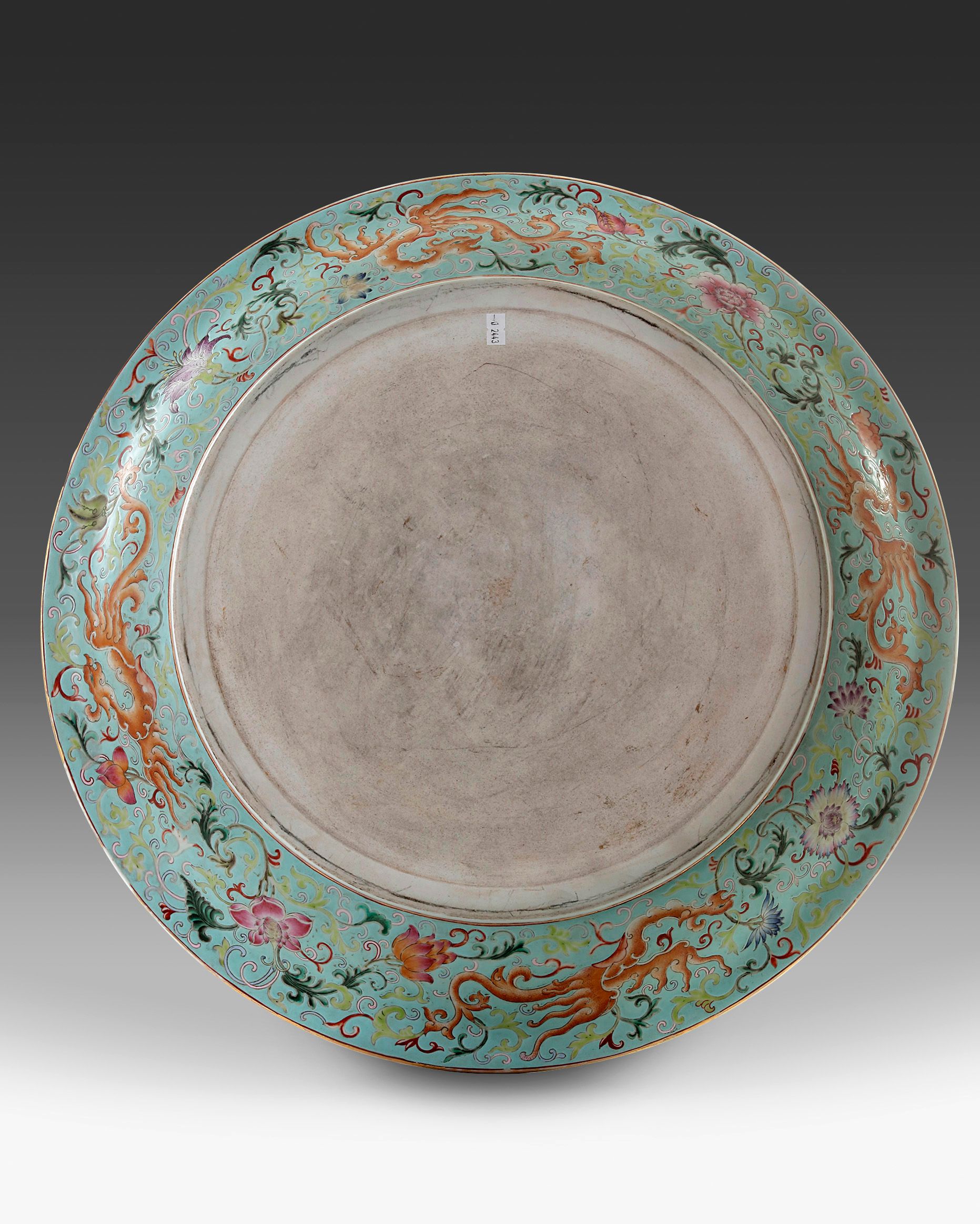 The charger is decorated to the interior with a front-facing dragons in iron red surrounded by four striding dragons all amongst cloud and flame scrolls enclosed by a ruyi head band. The flat everted rim is decorated with a flower scroll. The reverse is decorated with phoenix in flight amongst flower scrolls. One edge of the interior with an apocryphal Qianlong seal.