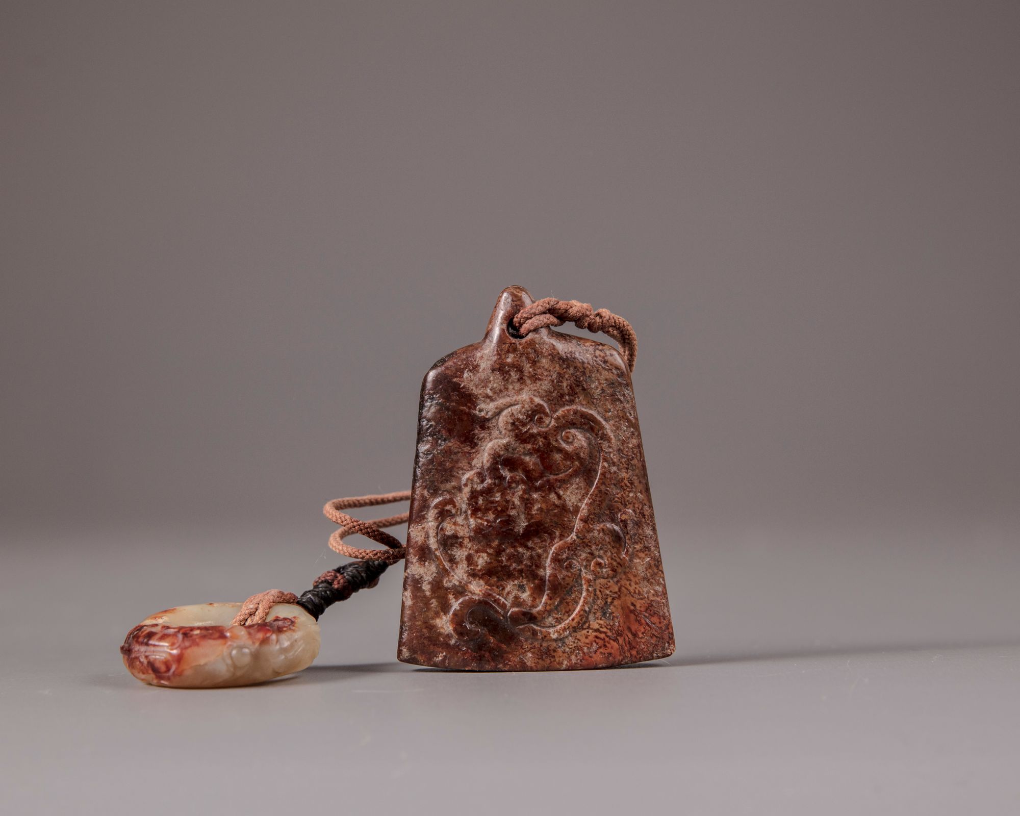 The first is a celadon hoop carved as a coiled dragon. The second is a brown bell-shaped pendant with each side incised with coiled chilong, the other side with an archaic mask and a two-character inscription. Provenance: From the collection of mr. J.E. Vaandrager