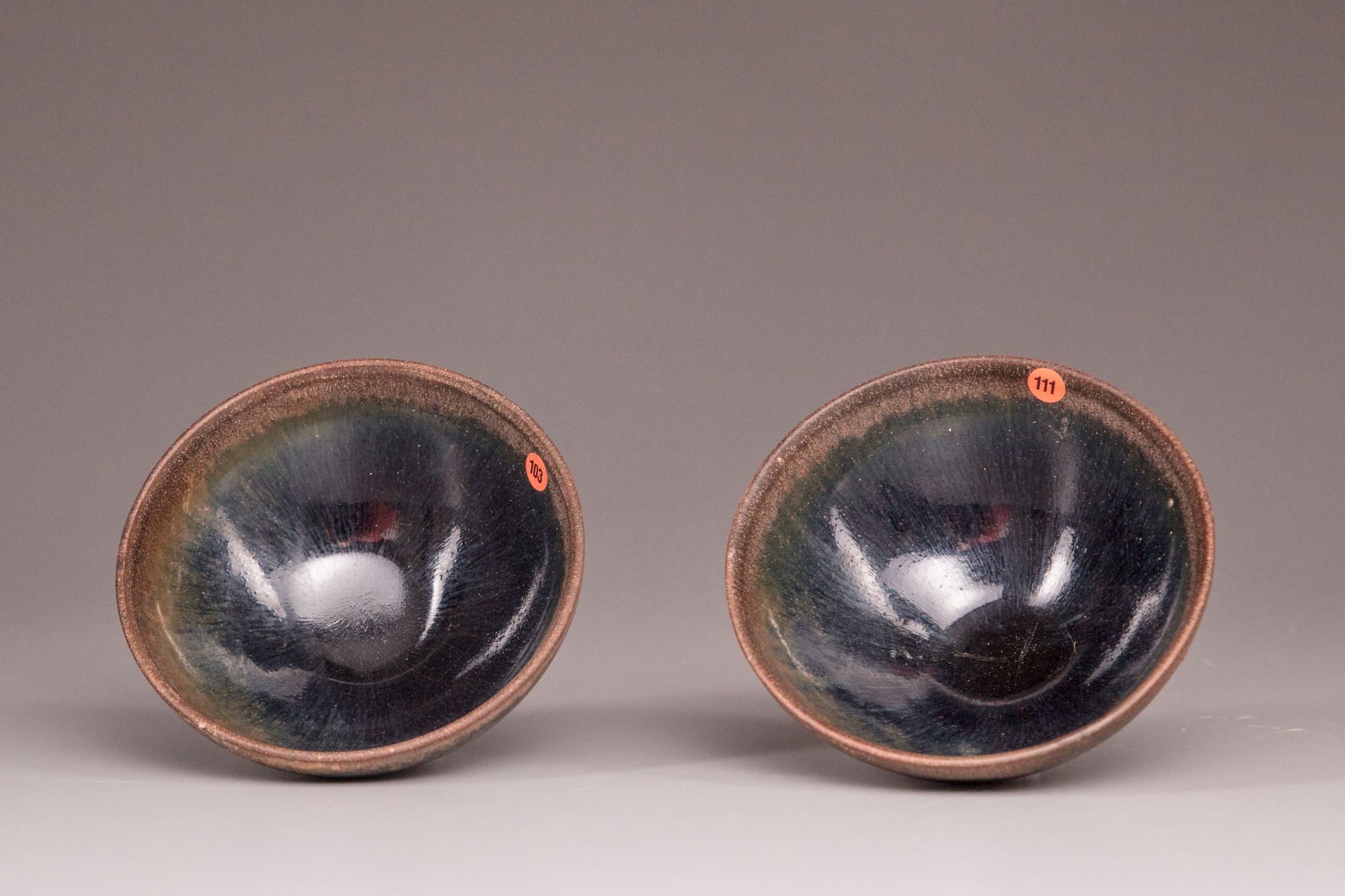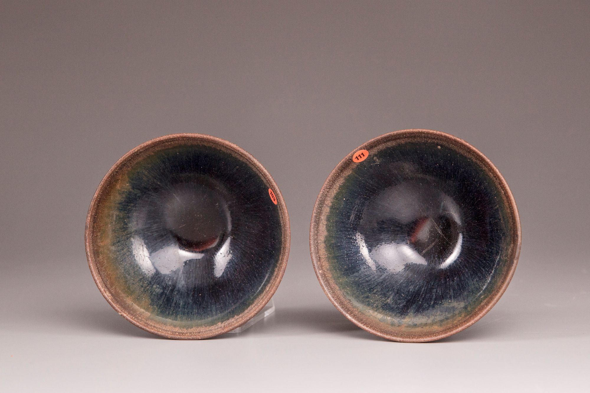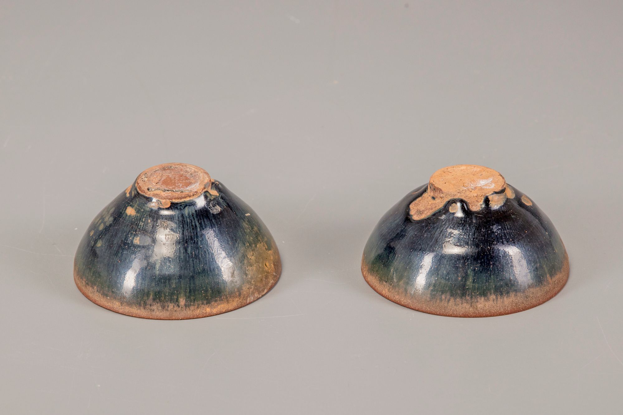 The bowls with rounded sides rising to a finger groove below the mouth rims, covered inside and out with a black glaze streaked with 'hare's fur' markings.