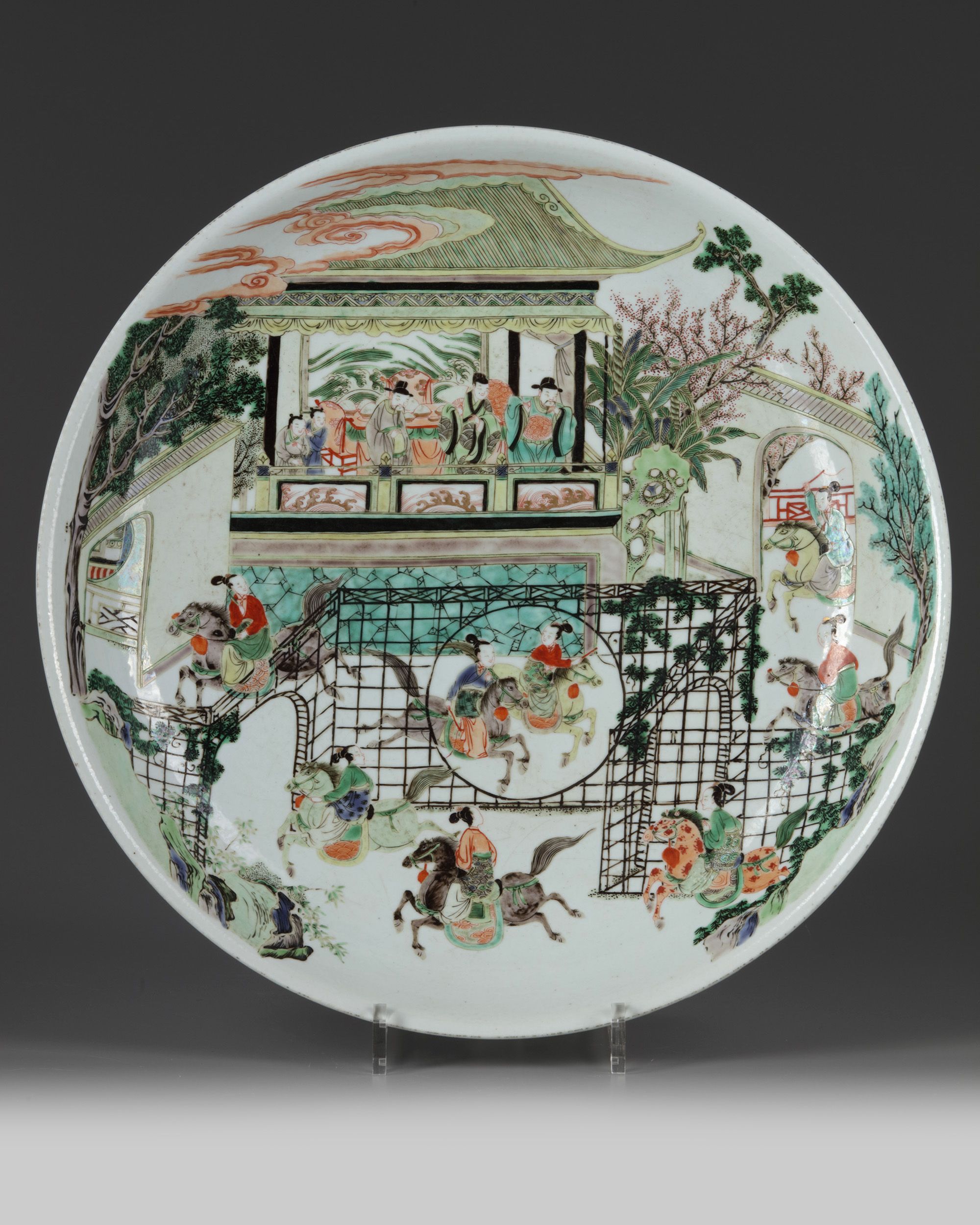 The interior is finely decorated with a narrative scene depicting six female riders amongst trees and plants in a fenced courtyard, all below officials looking on from a raised pavilion.