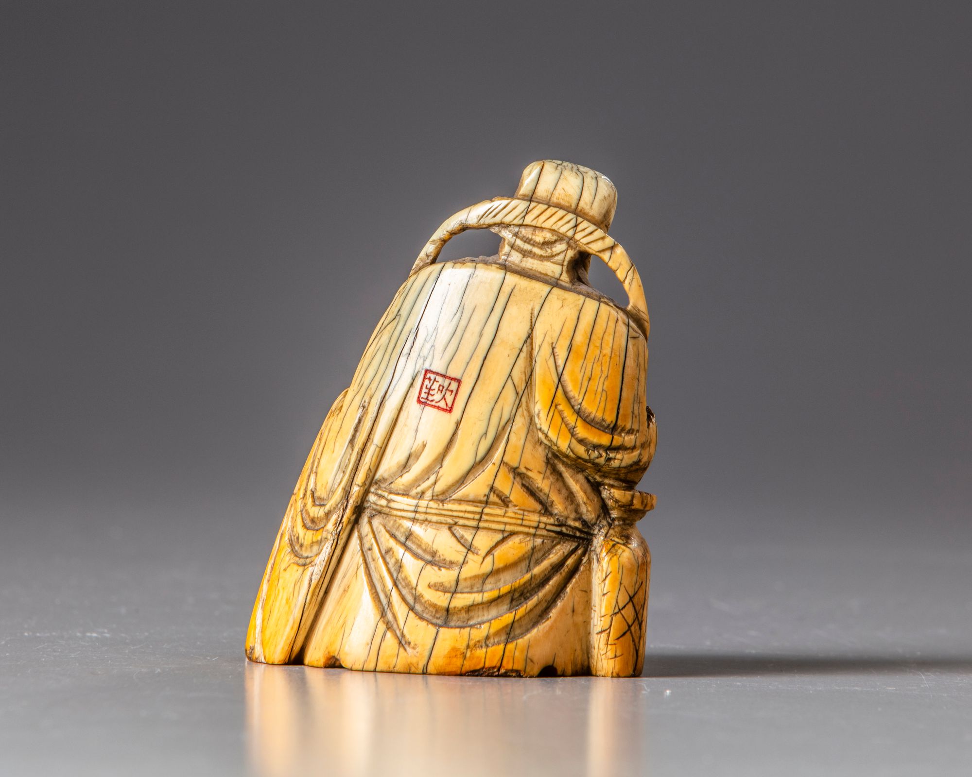 A seated carving of the drunken poet Li Bai, the reverse with a seal mark.