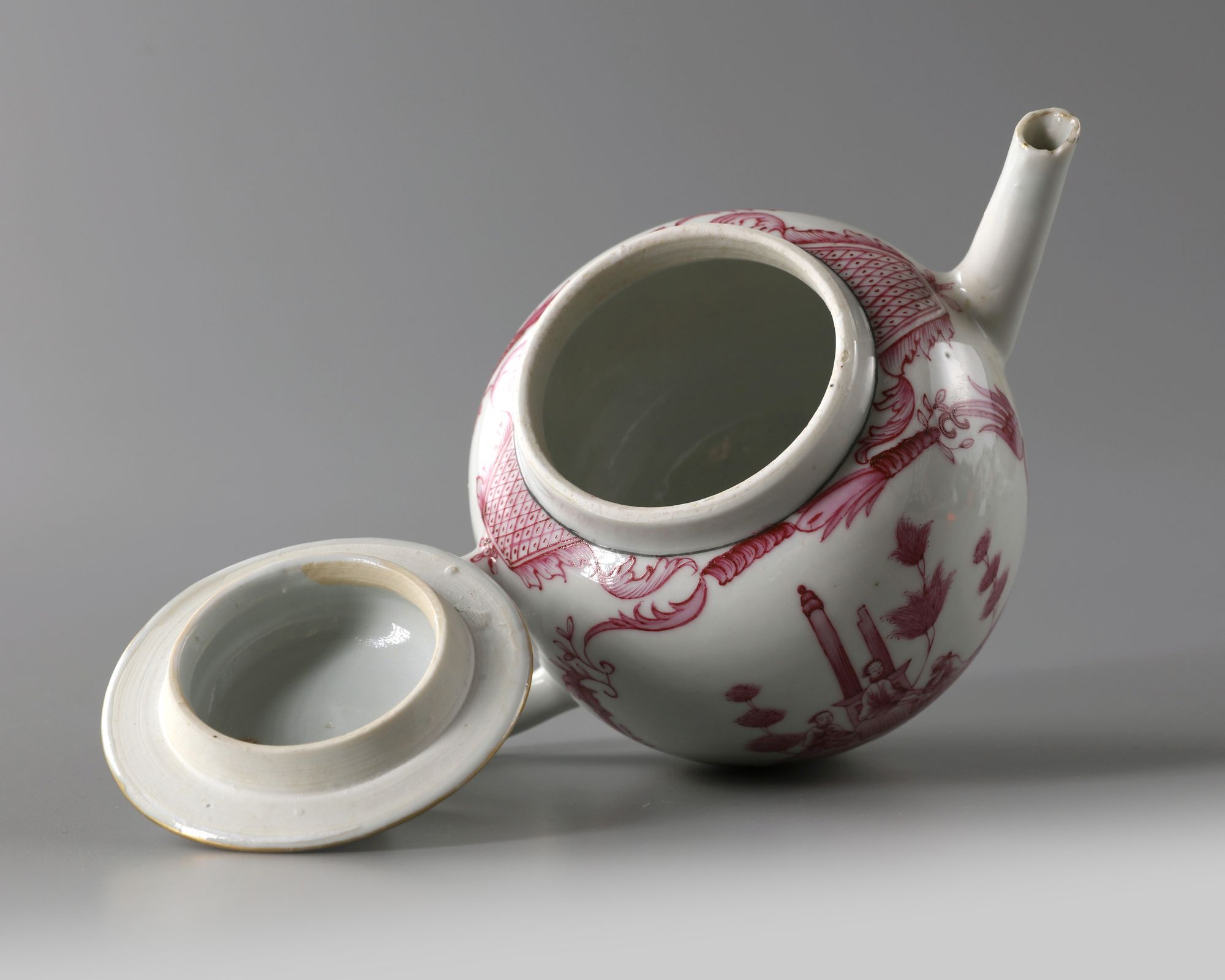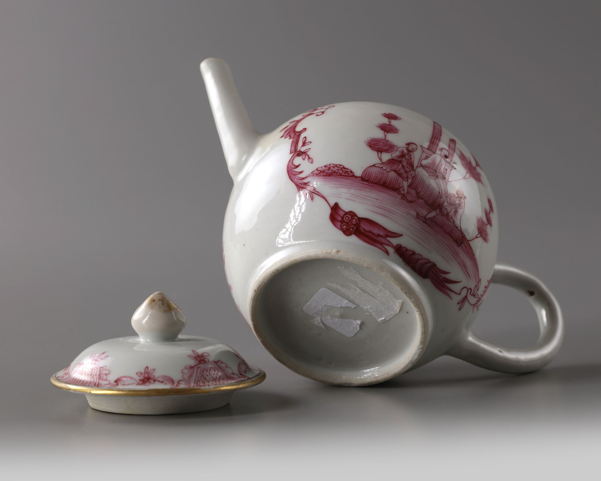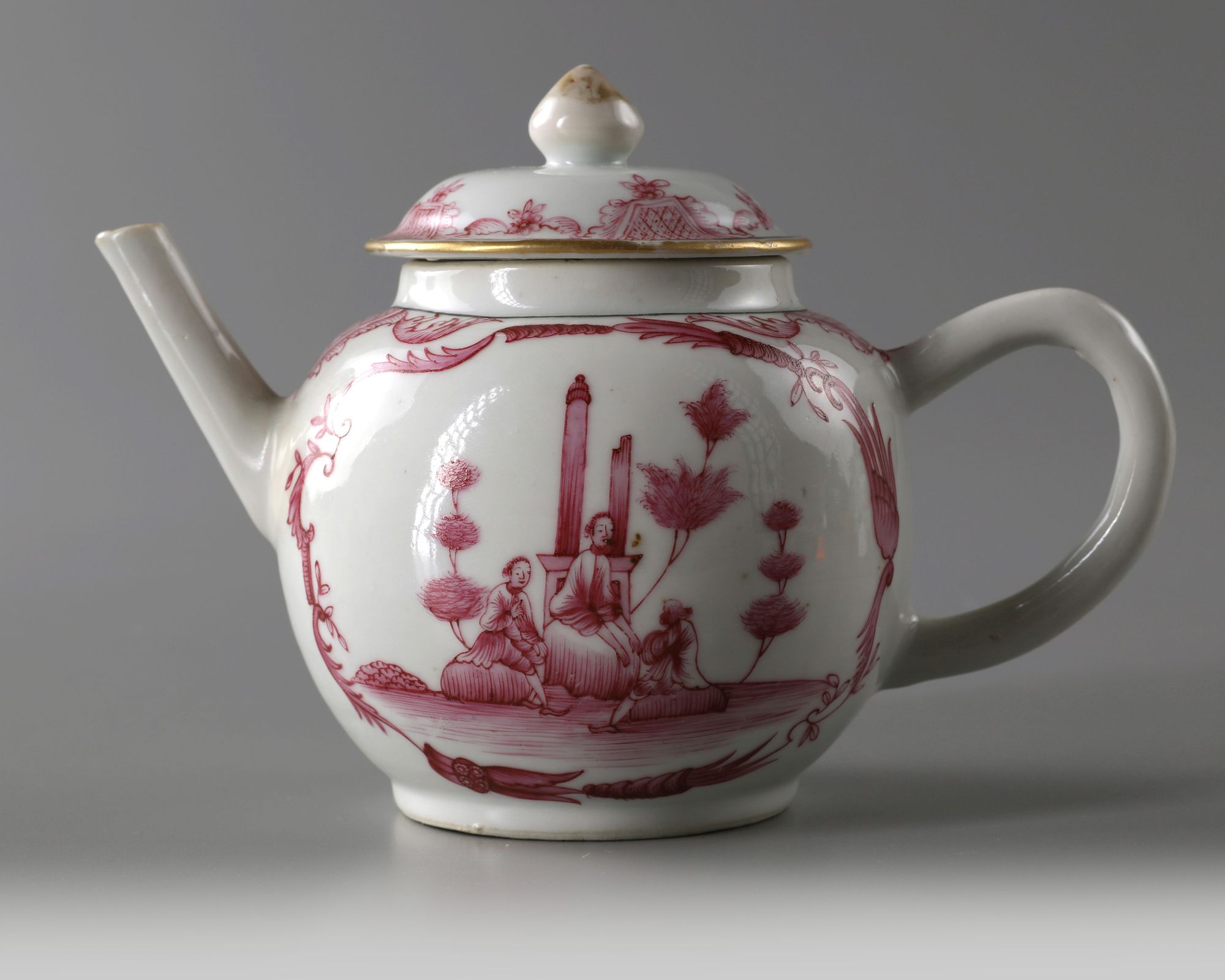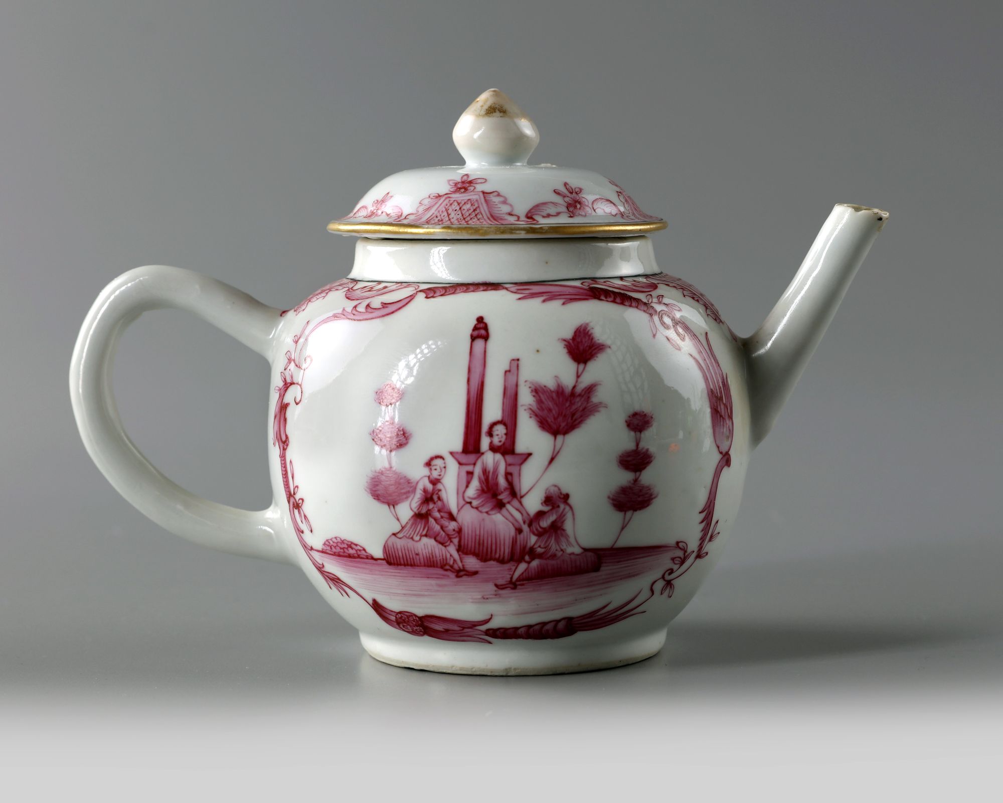 Teapot is of globular shape, it is decorated in puce enamels with gilt highlights to each side with panels enclosing three European figures in landscape. The domed cover is surmounted by a gilt finial.