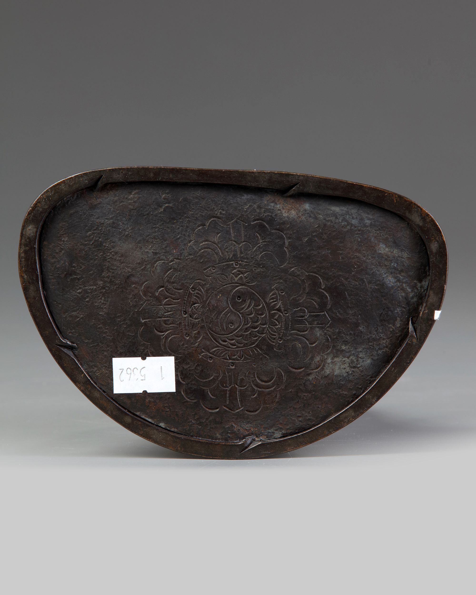 The figure is cast seated in padmasana and holding her hands in Dharmachakra Mudra, with a serene expression with downcast eyes and elongated earlobes with rings. Her finely detailed hair is upswept into a top knot. The robe is tied in a sash at the waist and tasselled jewelled necklace. All on a double lotus stand partially glided.