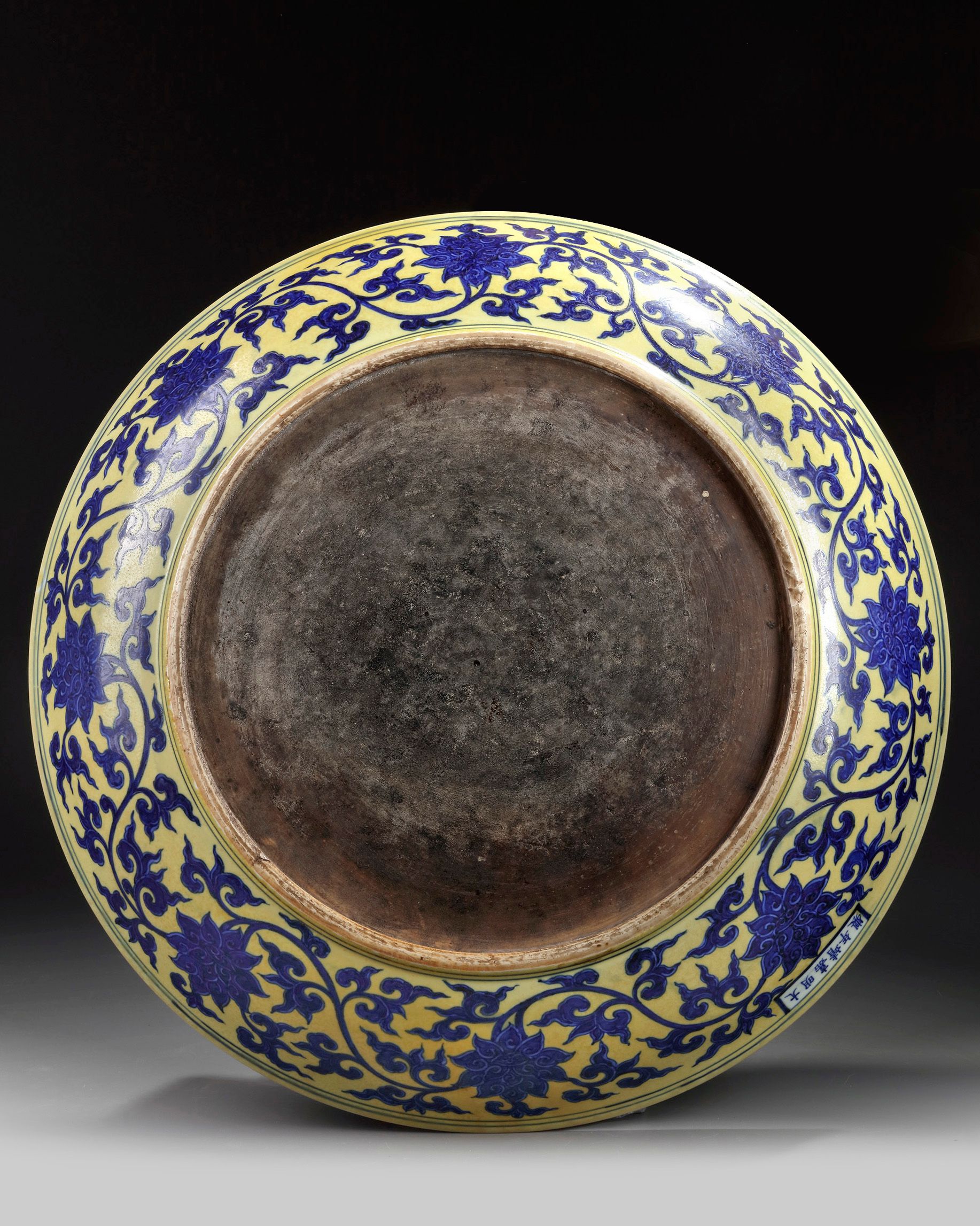 The dish is decorated in a Ming style with a large five-clawed dragon to the centre amongst scrolling lotus, the cavetto decorated with four striding dragons amongst lotus. The exterior is decorated with a large scrolling lotus and an apocryphal Jiajing mark. All reserved on a yellow enamelled ground. The base unglazed and the foot interior is covered with a brown wash.