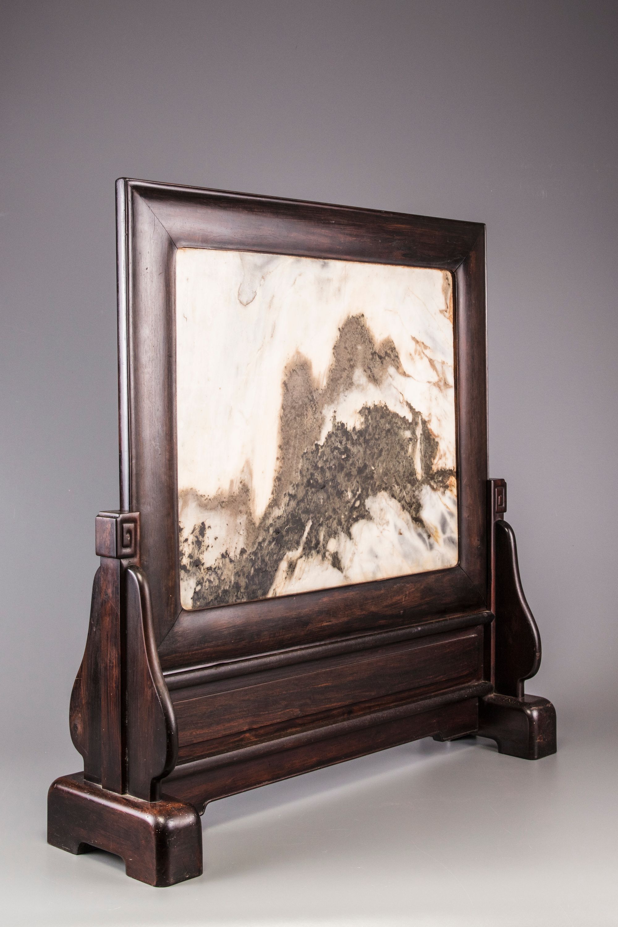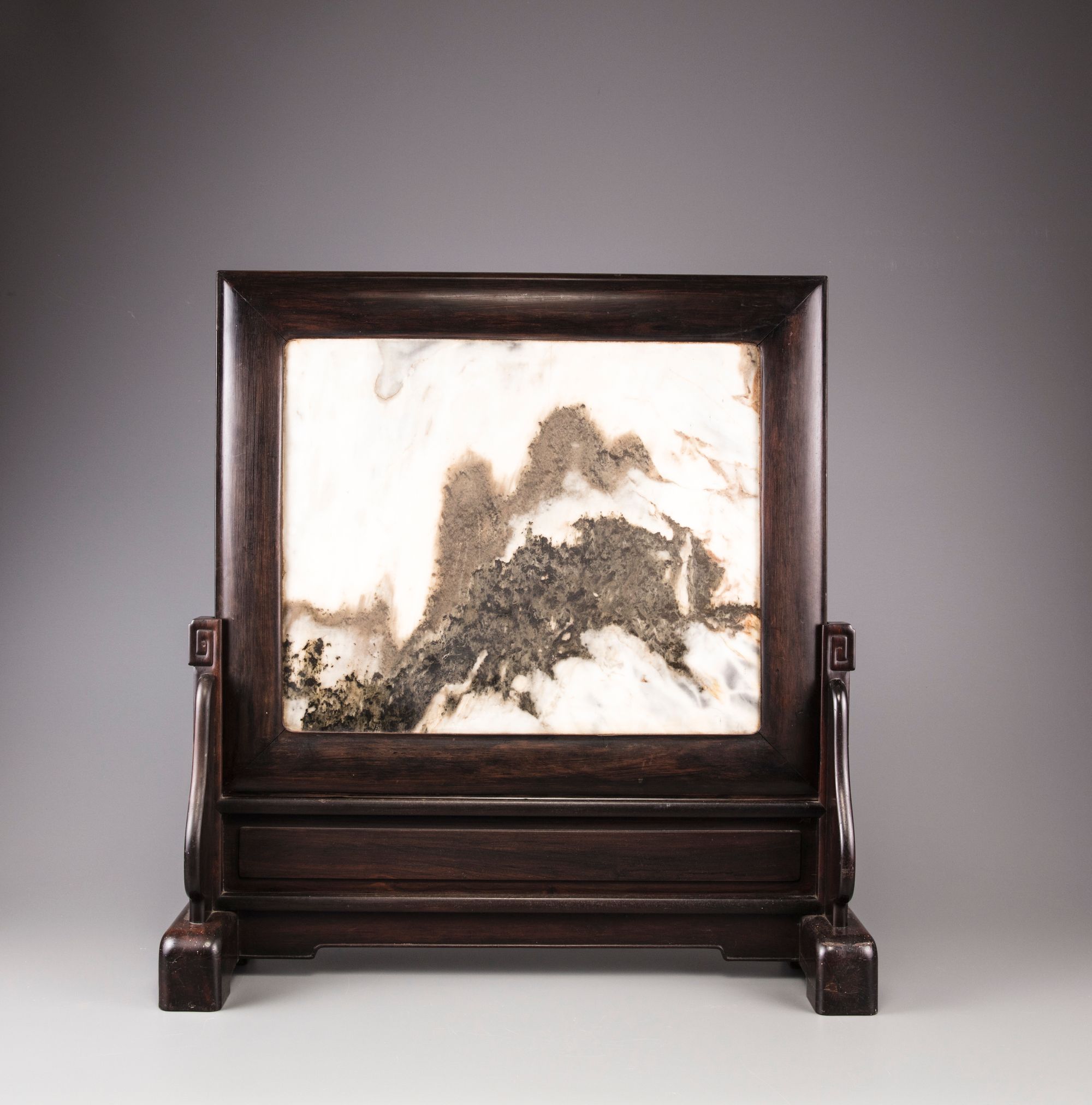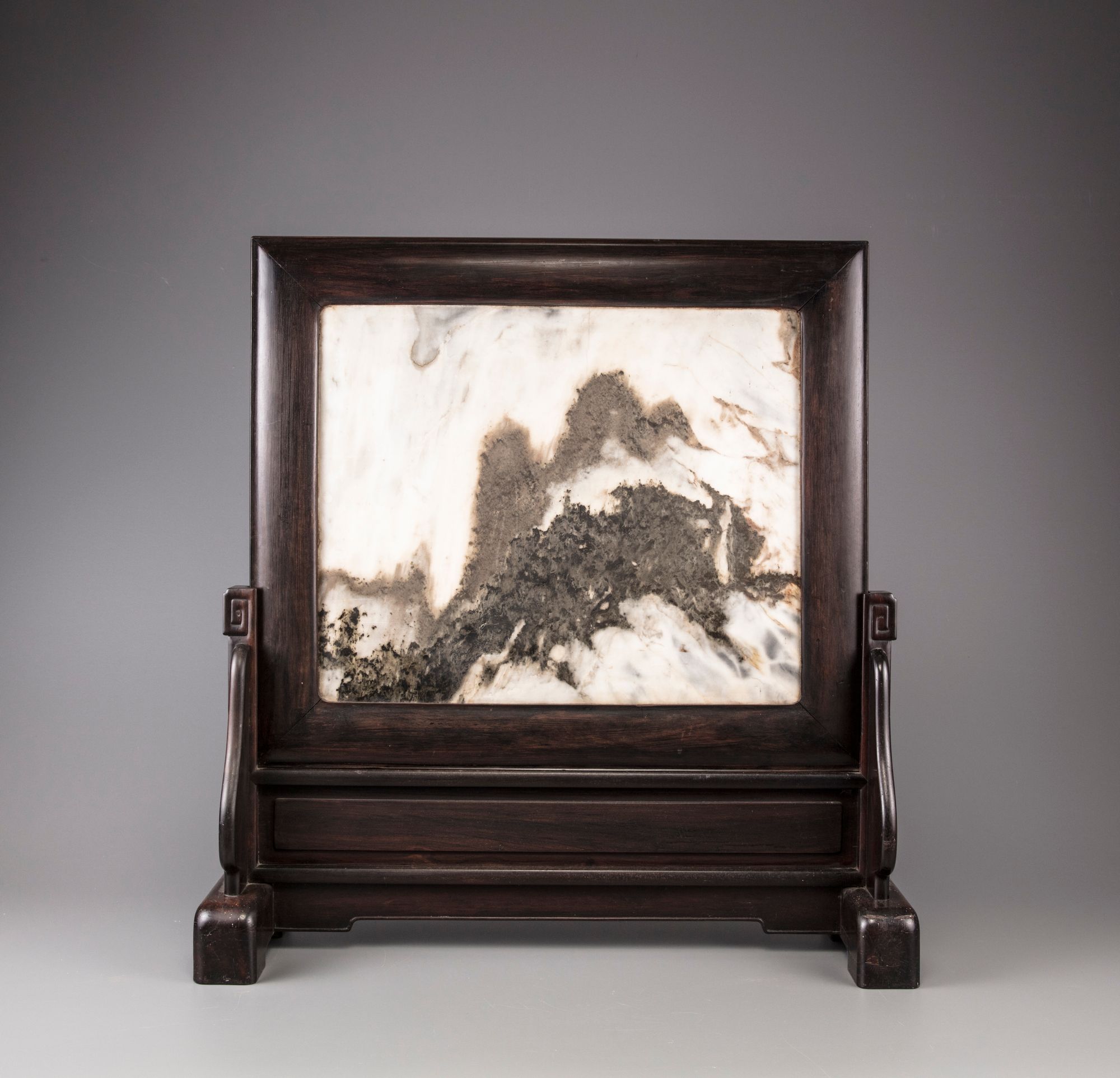 The panel is crafted from cream and grey-streaked stone implying a rocky mountain landscape. It is enclosed in a hardwood frame and stand.