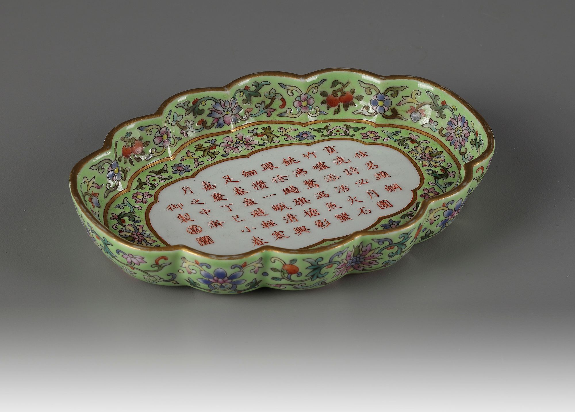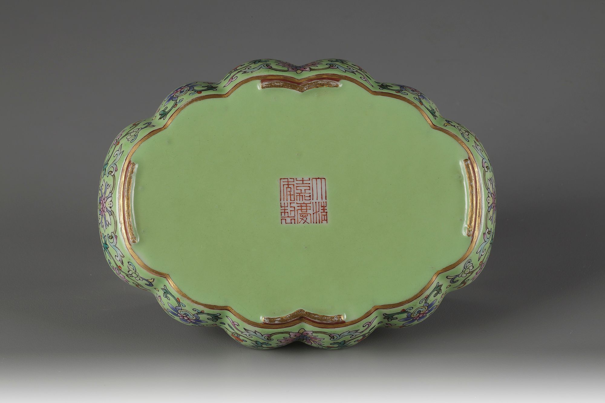 The lobed body supported on four ridged feet picked out in gilt, the centre inscribed in iron-red with an imperial poem dated to dingsi year of Jiaqing’s reign (corresponding to 1797), all within a gilt border and enclosed by a meander of lotus sprays and florets in bright enamels, the decoration repeated in the well and the exterior, all reserved on a lime-green ground continuing over the base save for a six-character seal mark in iron-red.