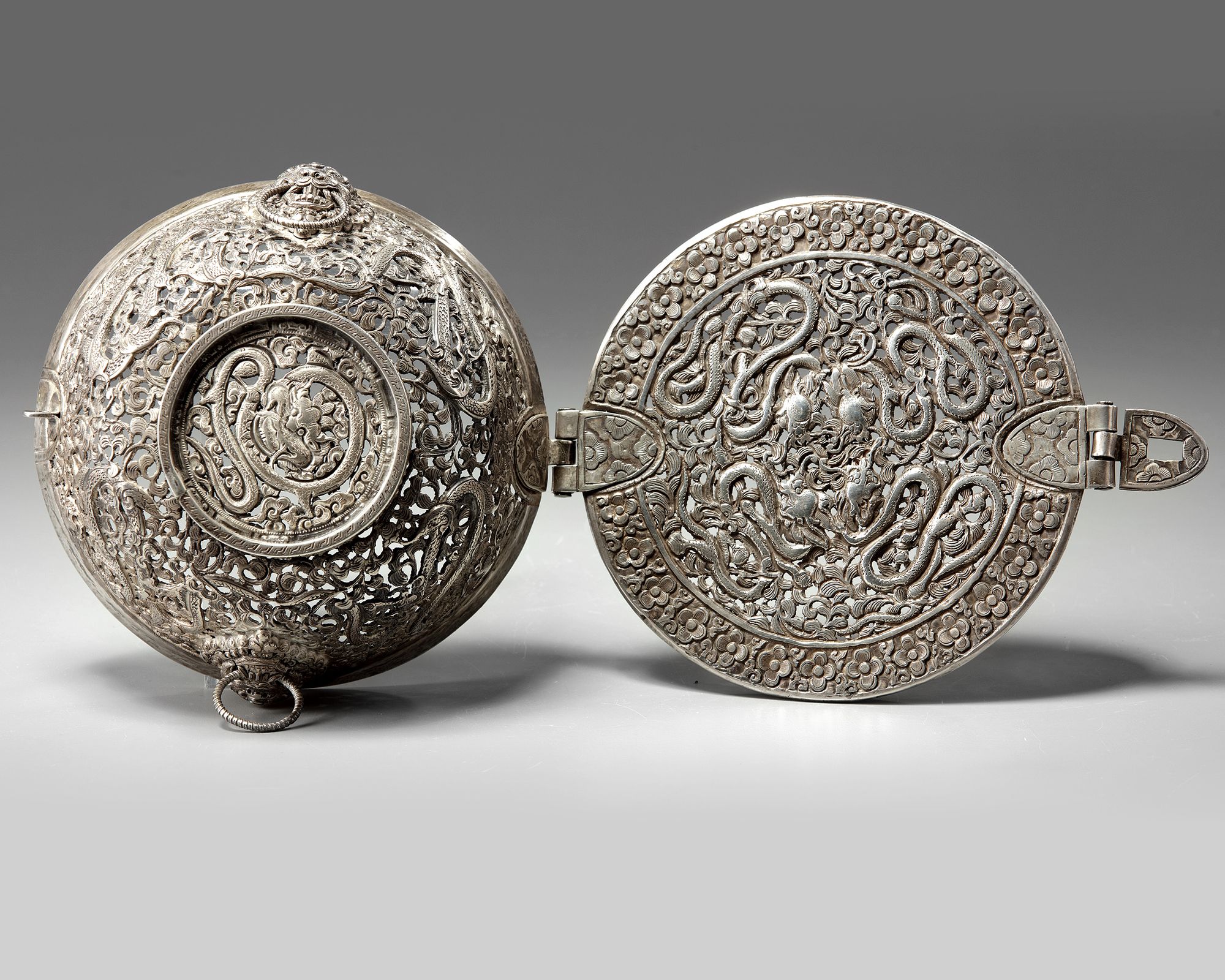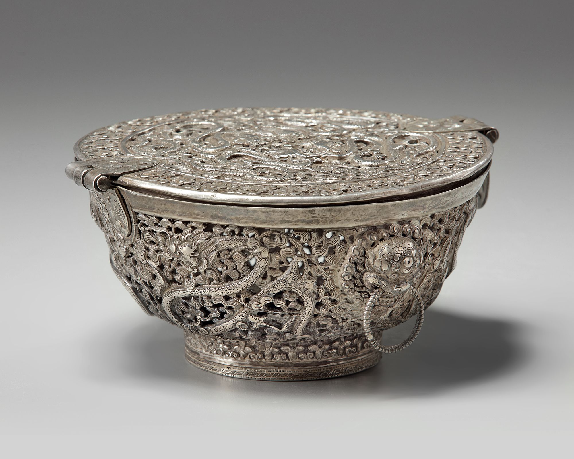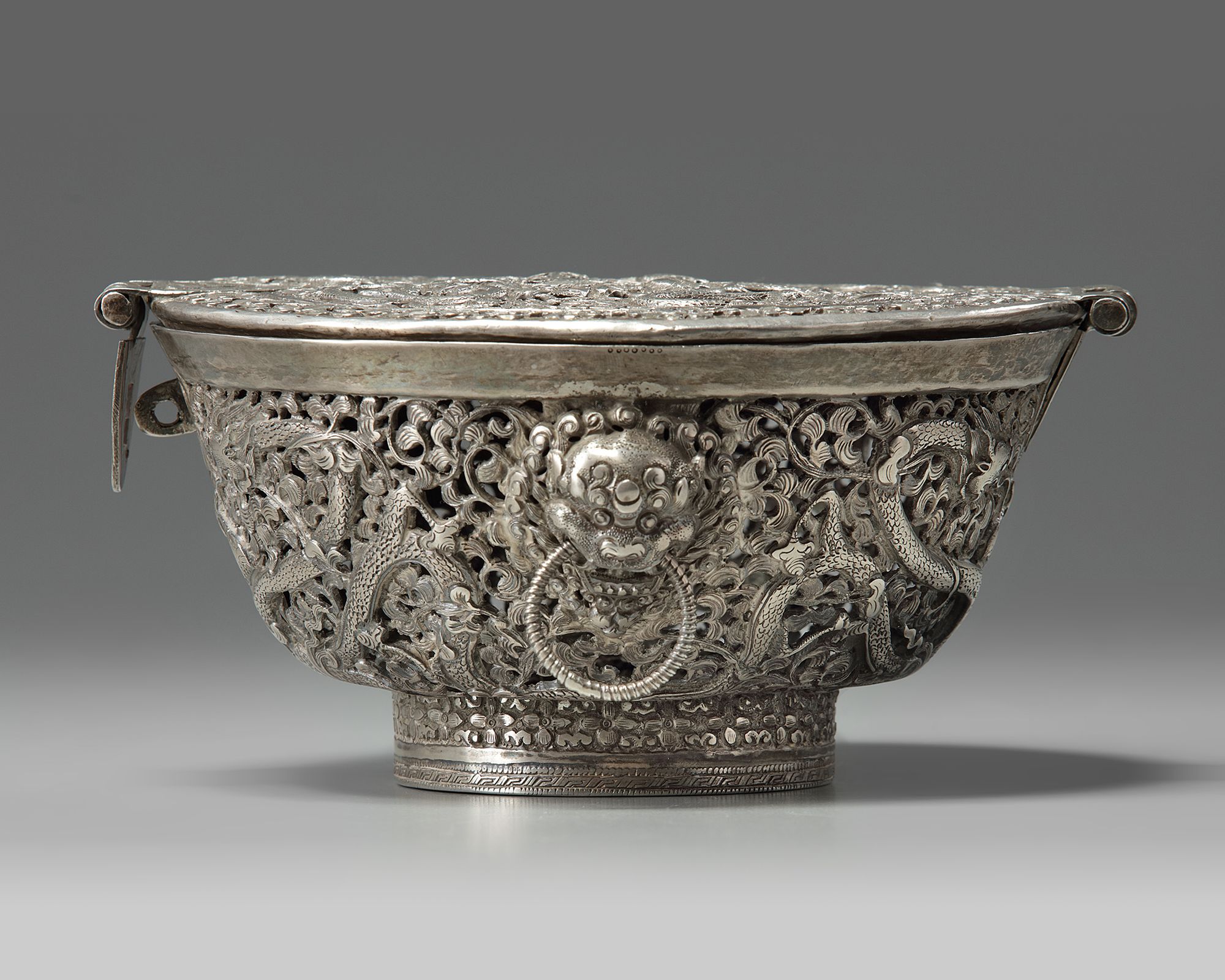 The openwork cover is decorated in repousse with four dragons amongst foliate scrolls, all surrounded by a flower head border, the body of the bowl is decorated with further dragons and openwork foliate scrolls, the sides are fashioned with two loose-ring Buddhist lion head handles. The base with a front-facing openwork dragon.