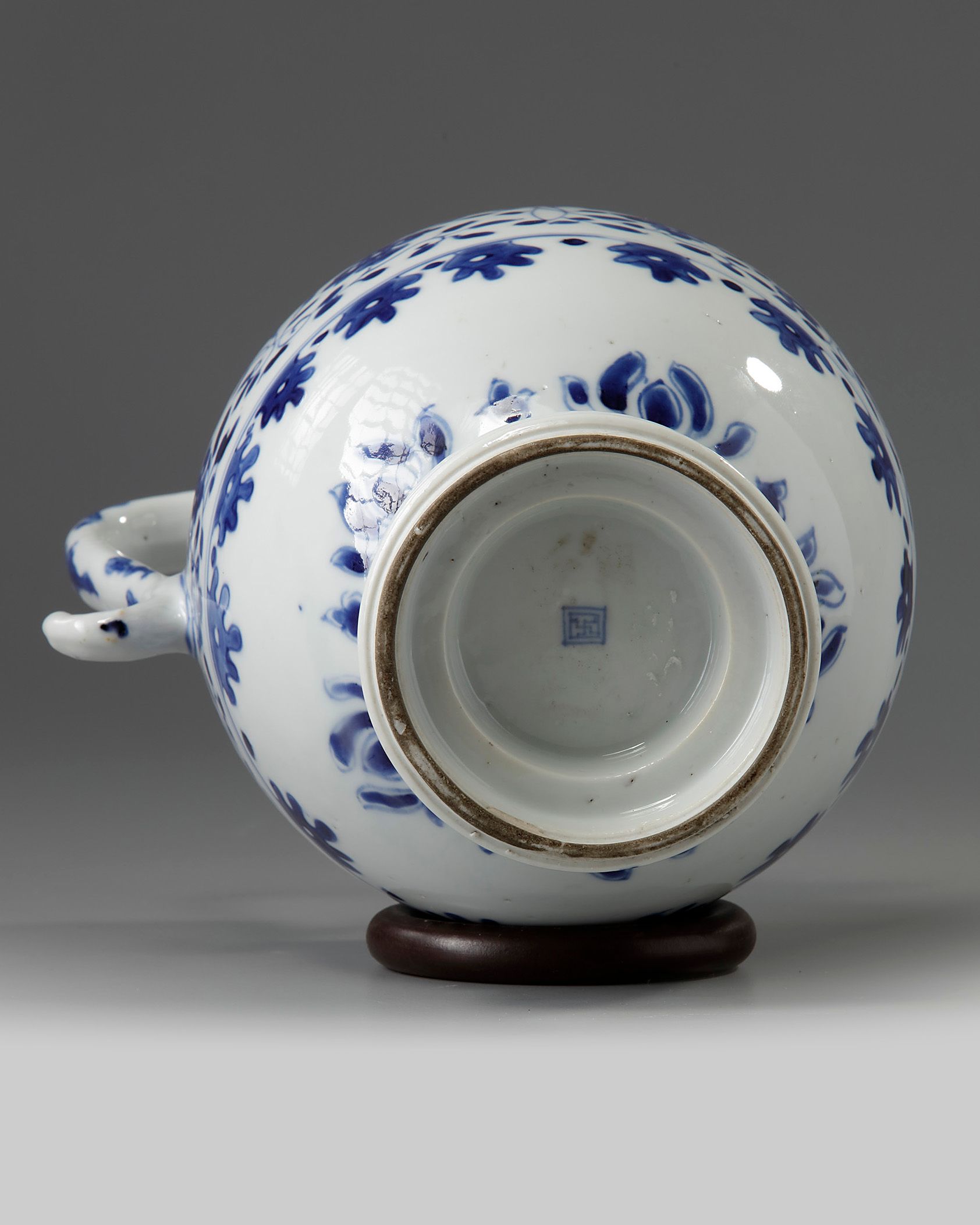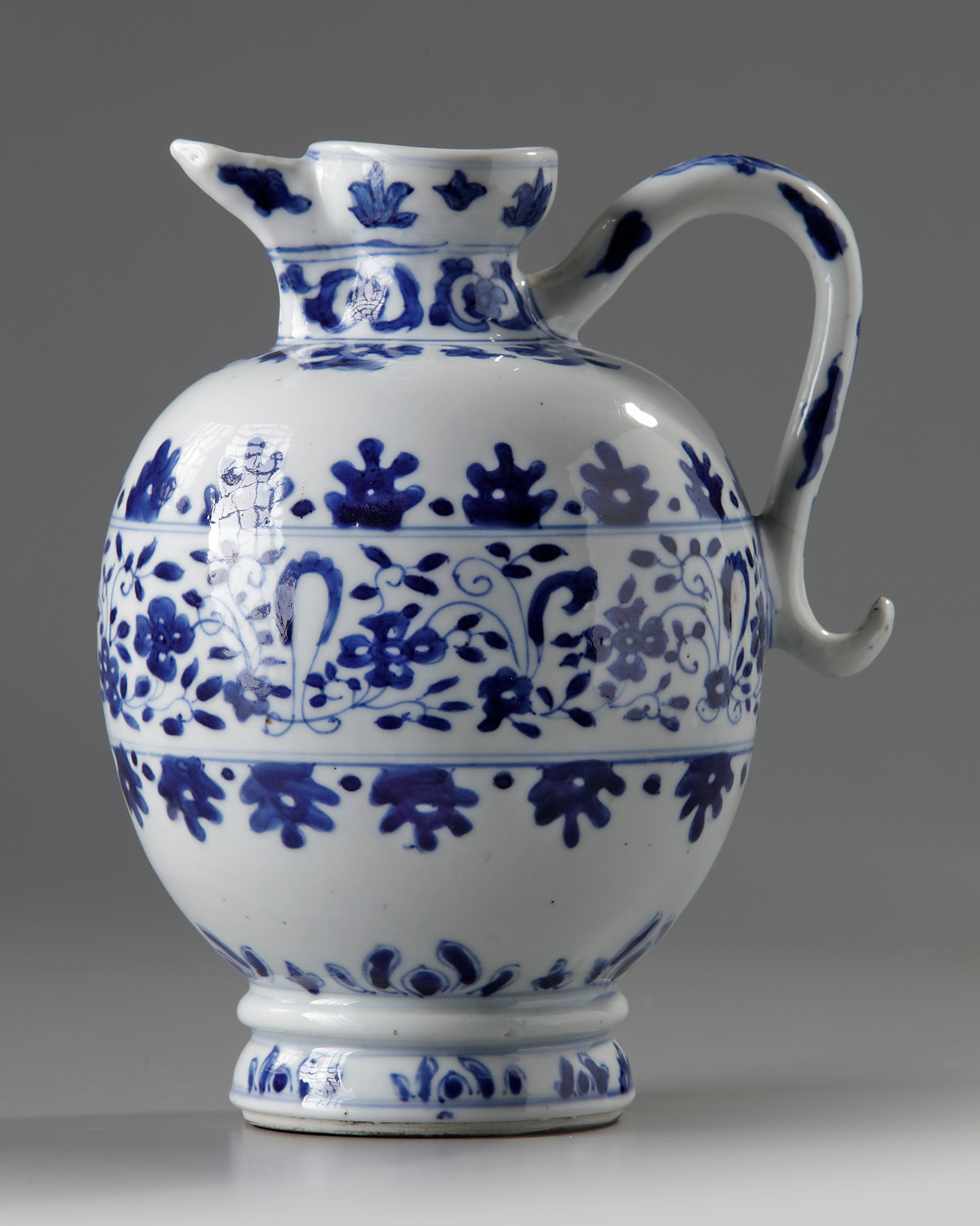 The ewer is modelled with a slender s-shaped handle and a short triangular spout. The body is decorated with a wide band of scrolling flowers with a petal band on either side. The neck is encircle with further floral bands. The base with a 'wan' seal mark.