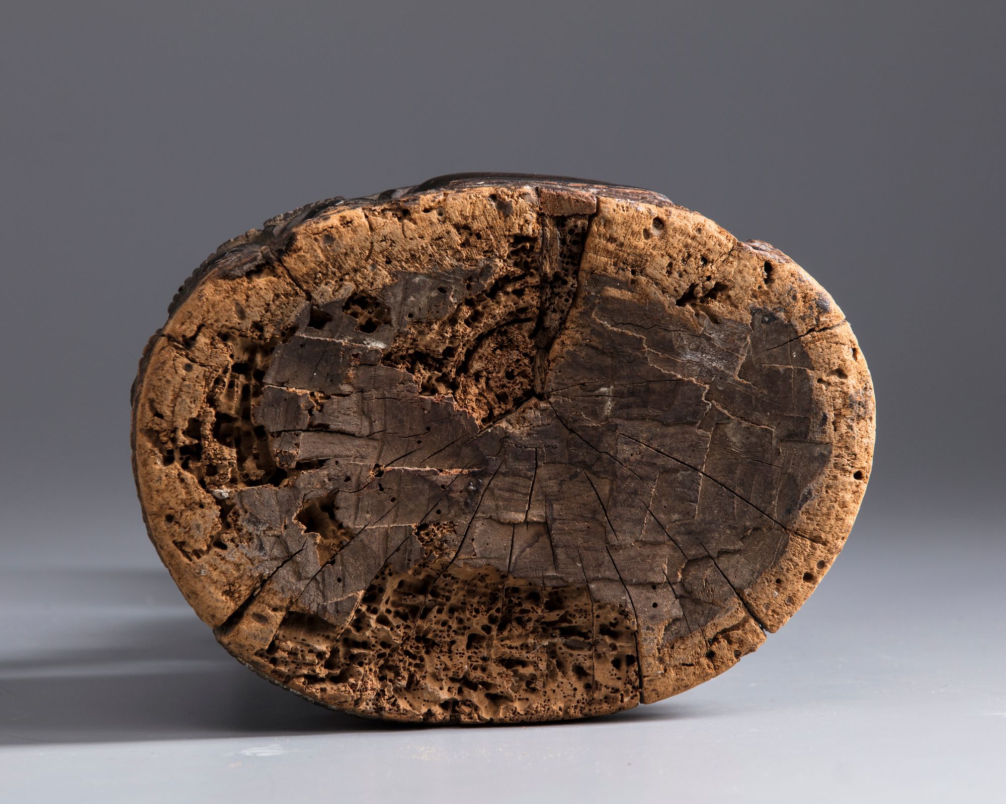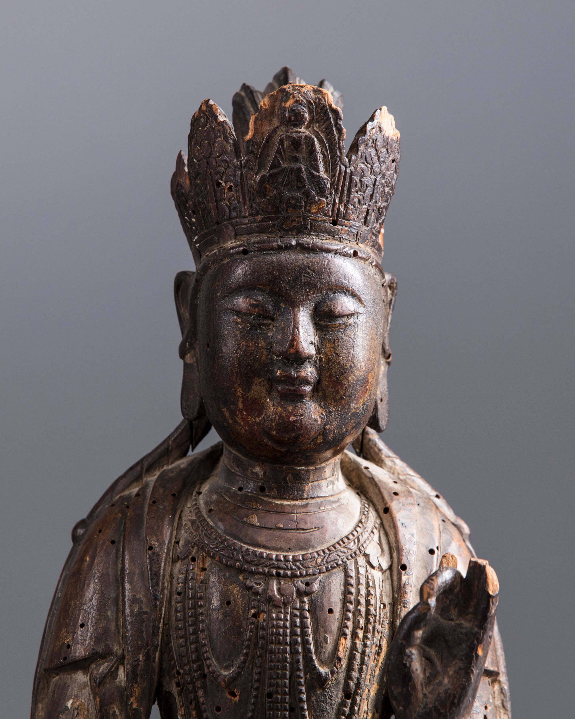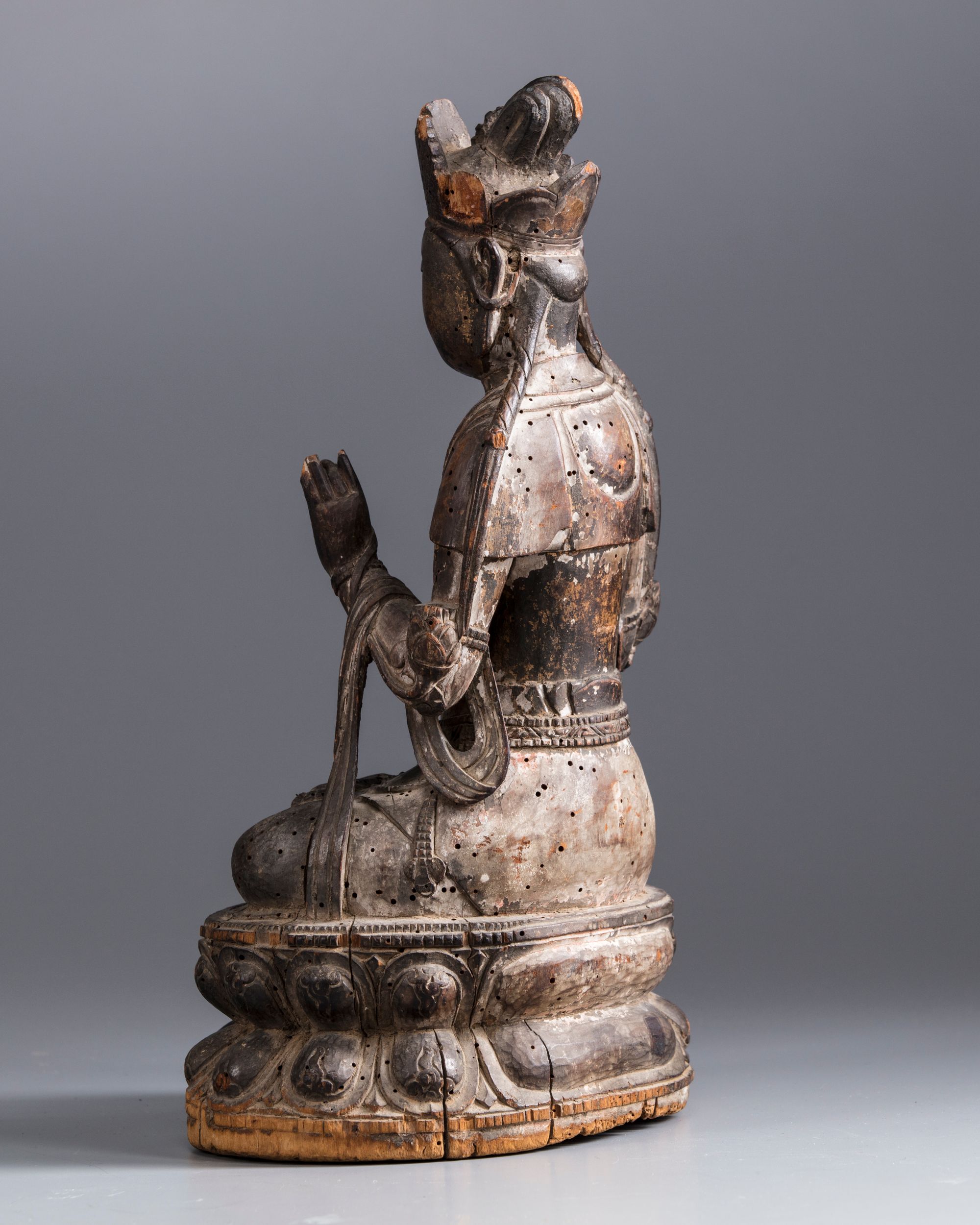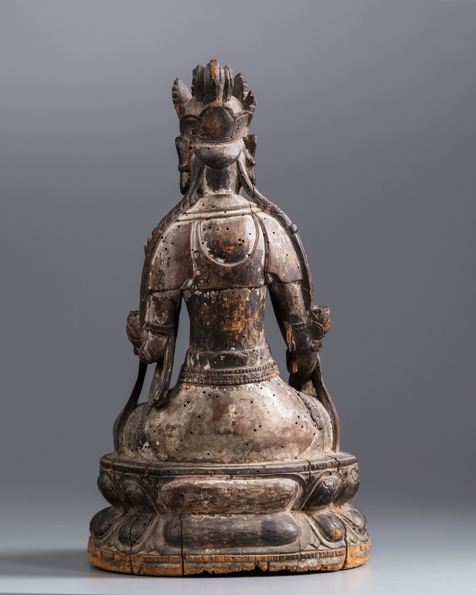 The bodhisattva is carved with a smiling face below a diadem centred by Amitabha buddha, she wears a shawl and a draped celestial scarf, as well as elaborate jewellery. She is seated in padmasana on a double lotus base with a large uncarved panel to the front.