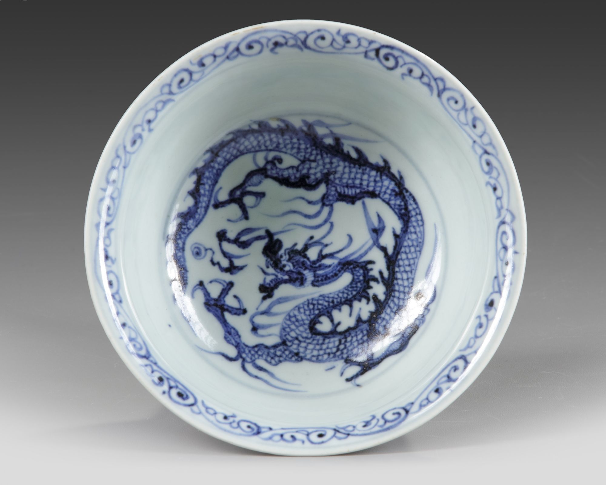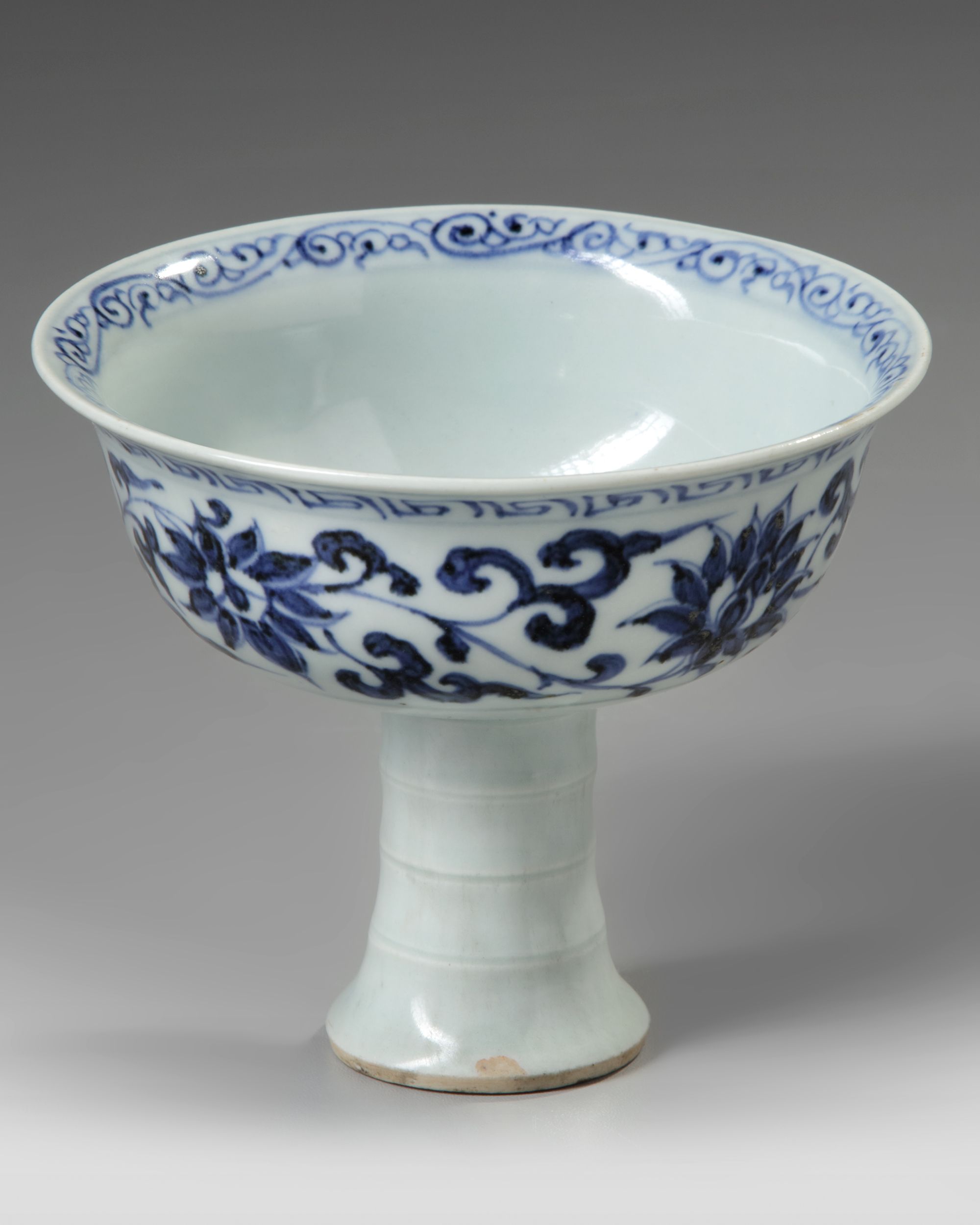 The stem-bowl is decorated with a scrolling lotus pattern underneath a key-fret border.