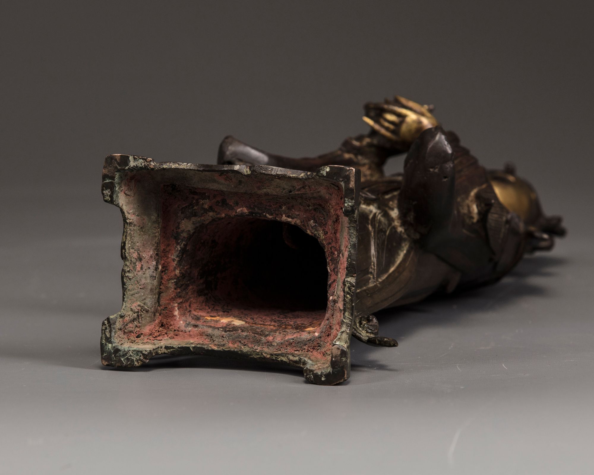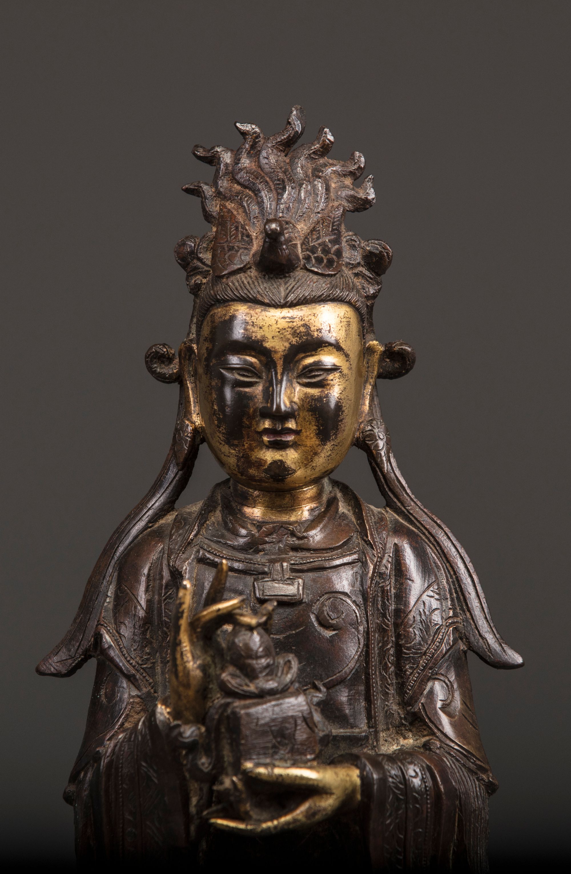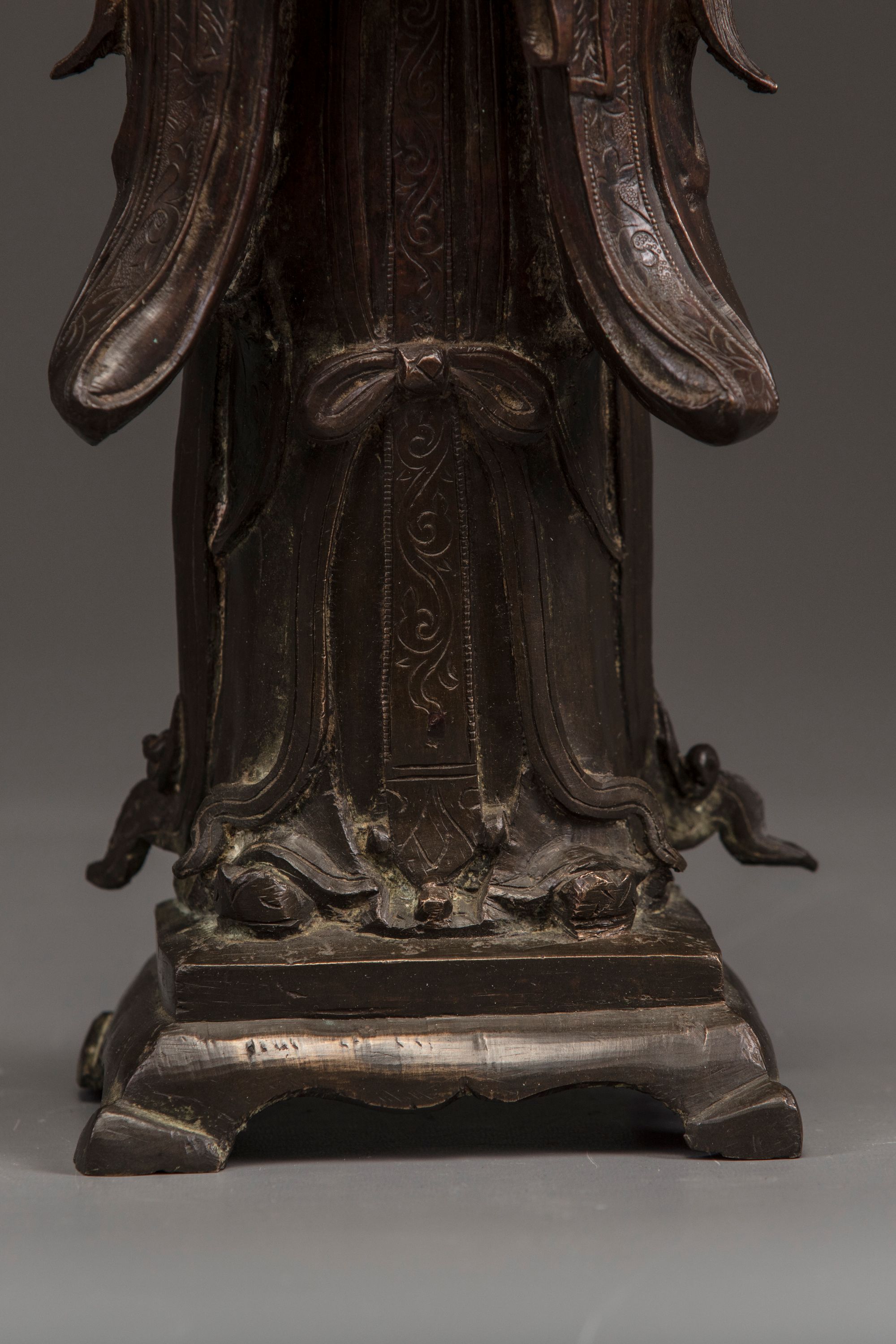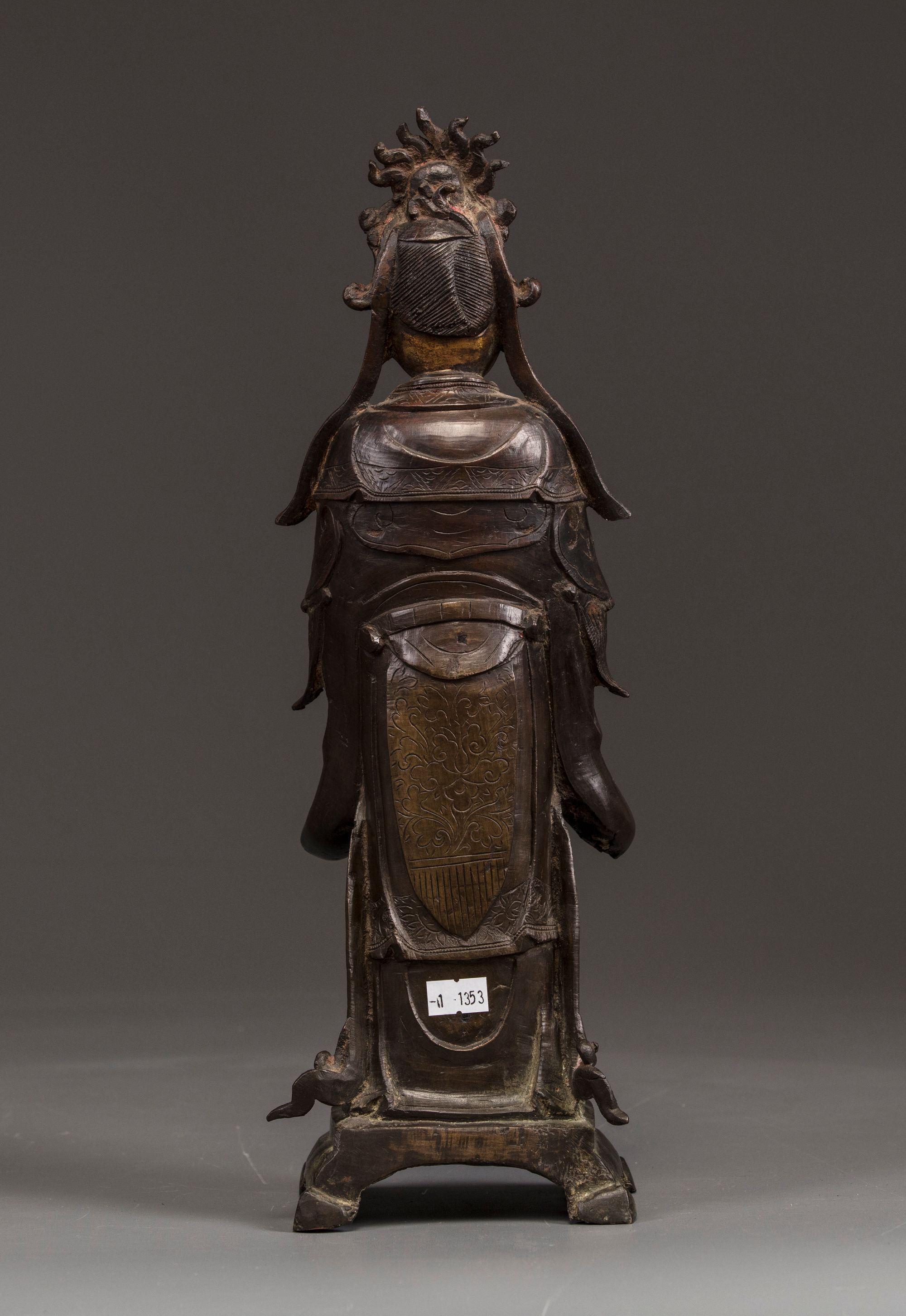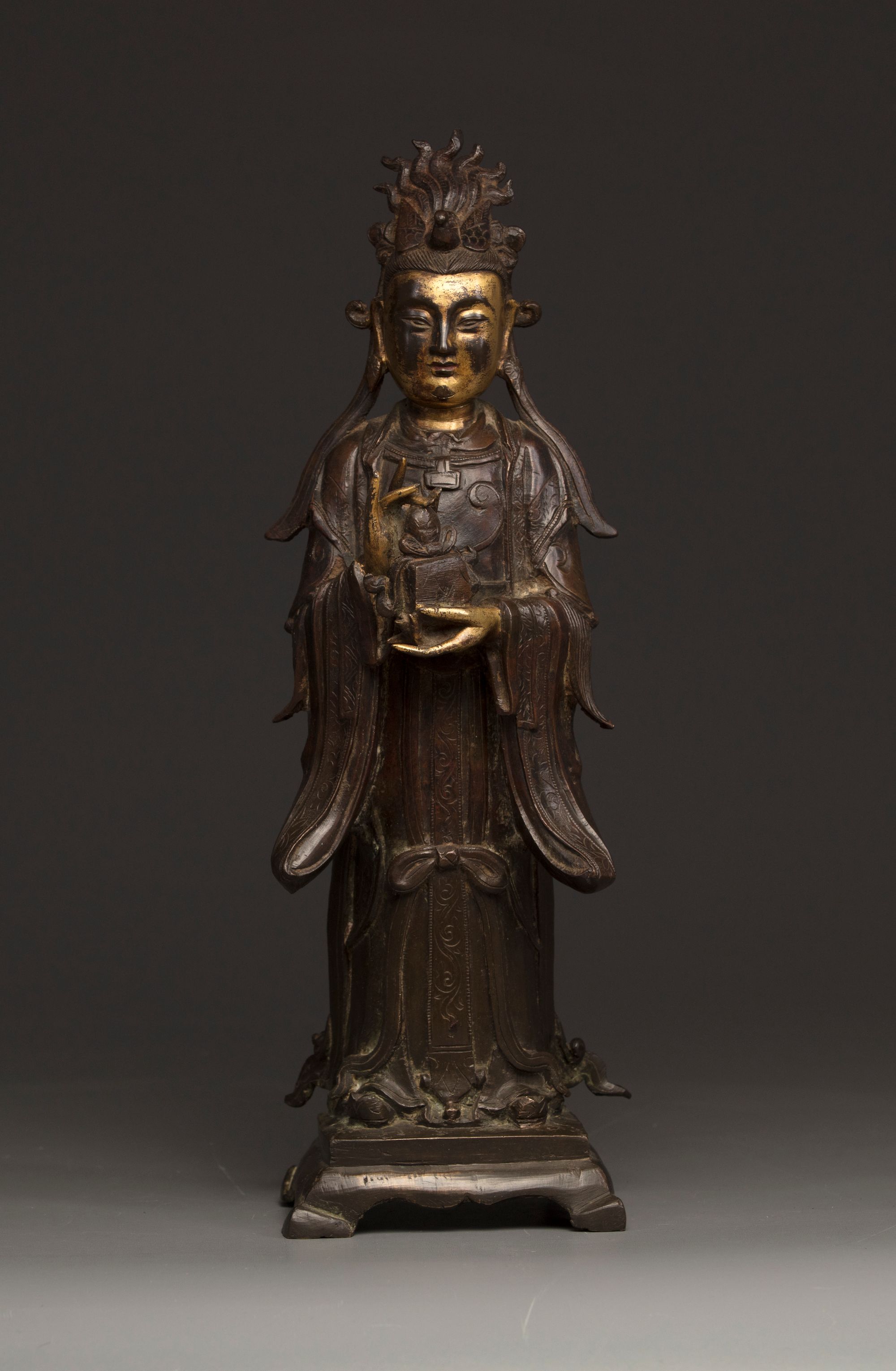 The Queen Mother of the West is modelled wearing an elaborate headdress shaped as a bird, she stands wearing long robes decorated with floral designs. She is cast with her hands in front of her holding an auspicious attribute standing on a four-legged base.