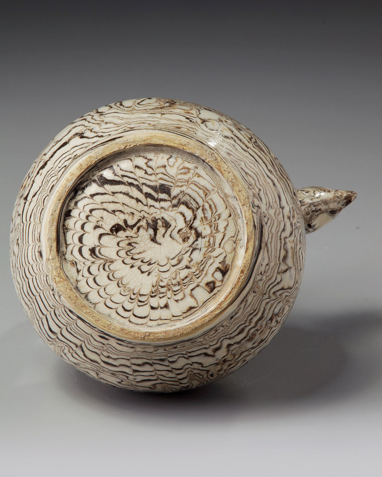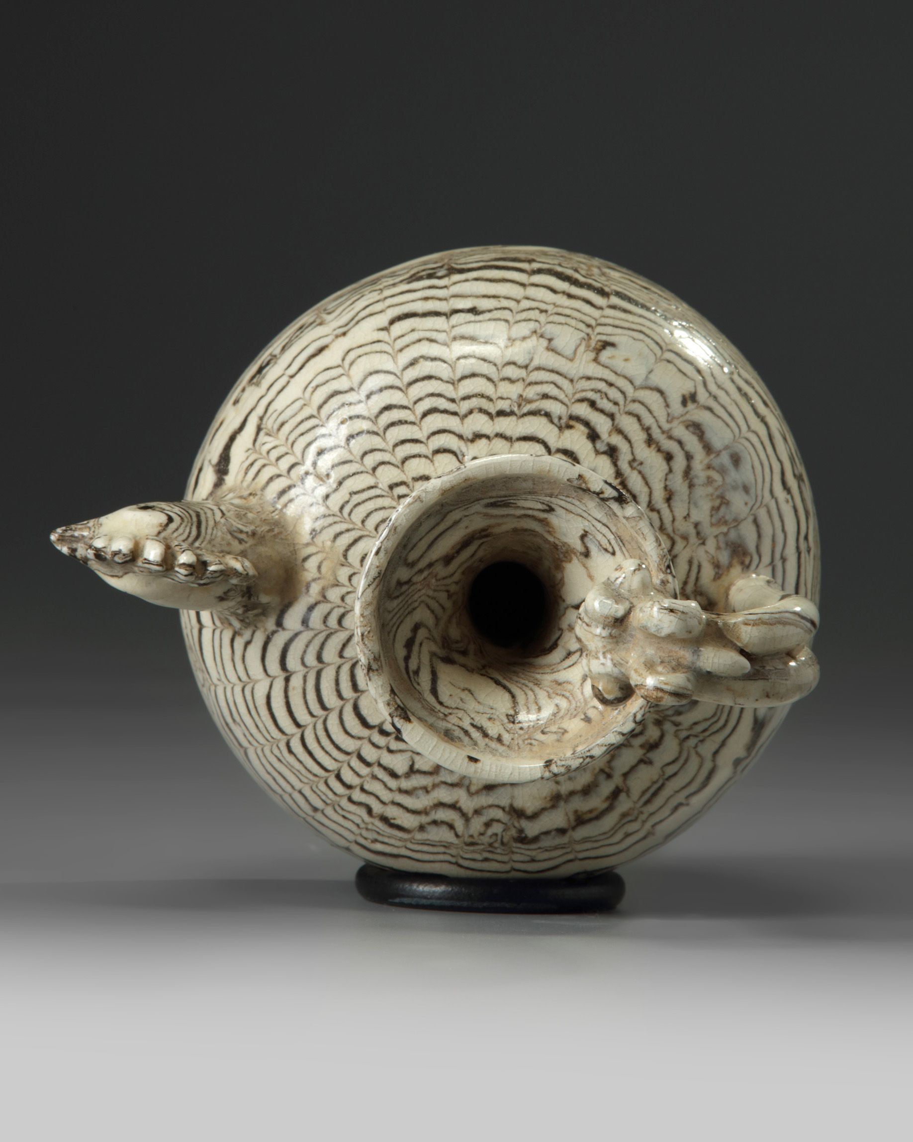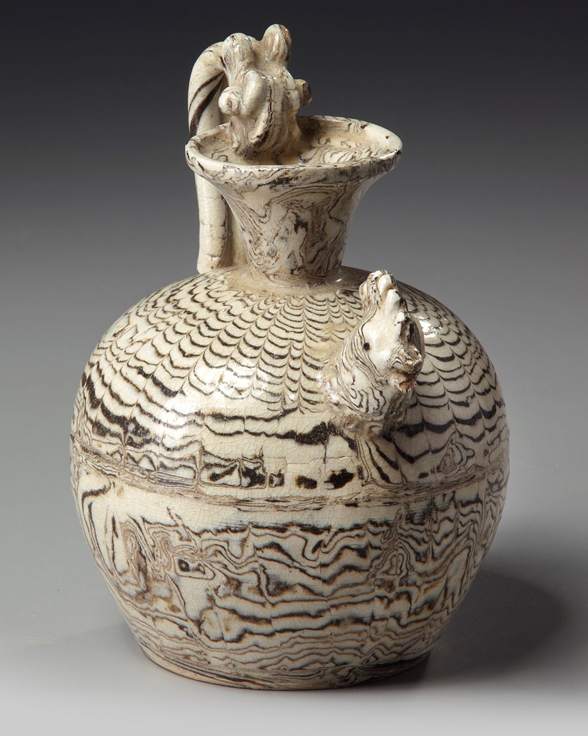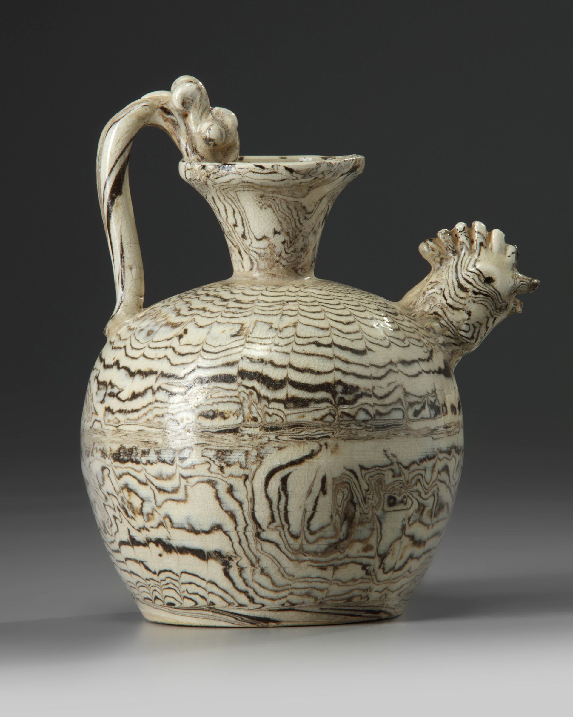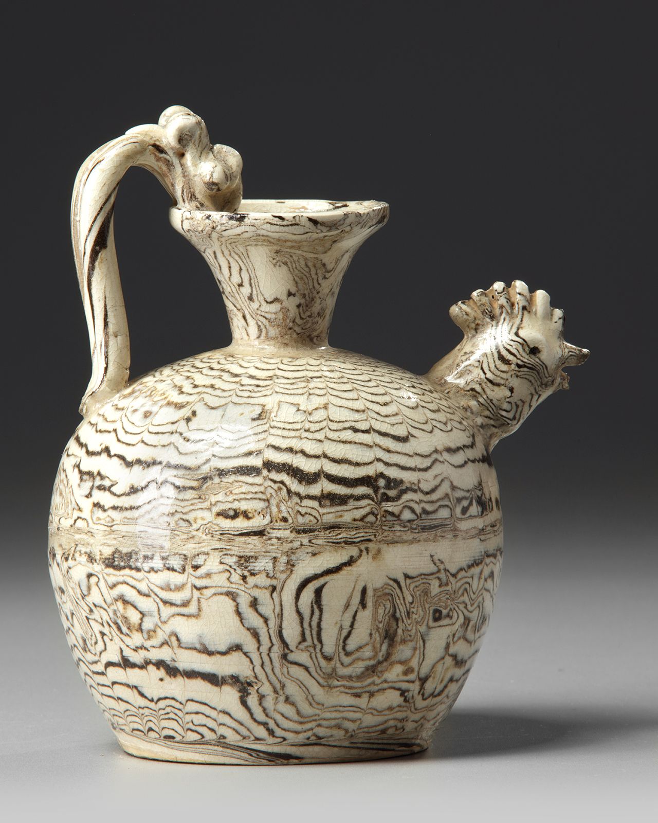 The ewer is crafted with the spout as a cockerel’s head and the strap handle as a further beast head which slaps the flaring rim which is supported by a globular squat body. The ewer is covered overall in a cream glaze marbled with deep brown.