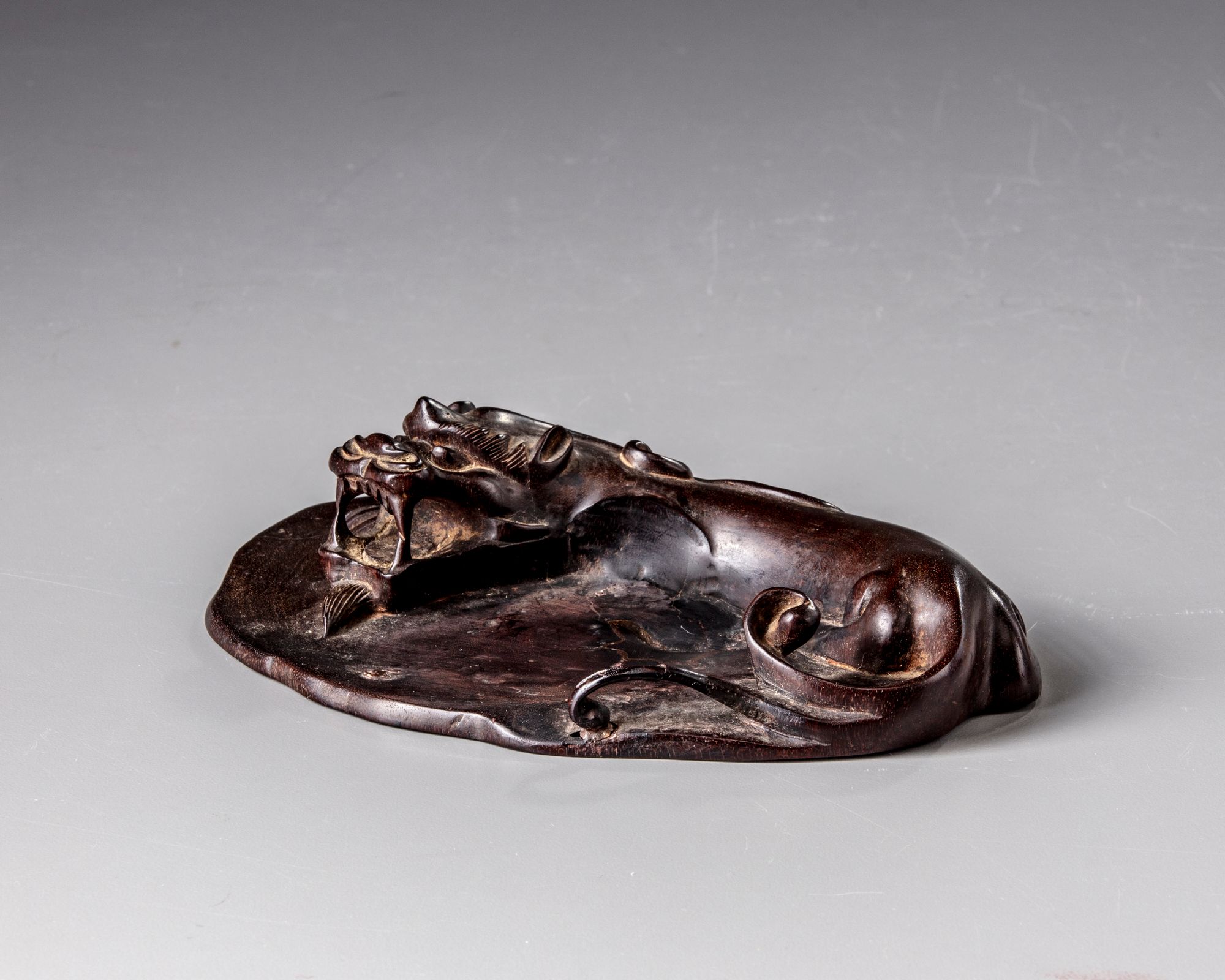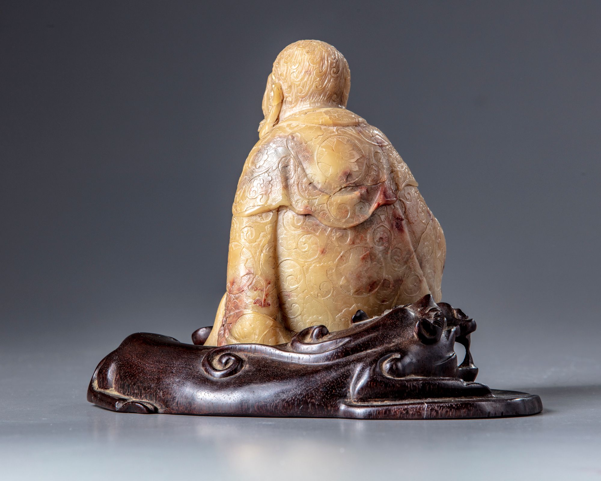 The soapstone figure is carved wearing long, flowing robes with a serene expression, and seated, on one knee, with a Chillong zitan wooden stand.