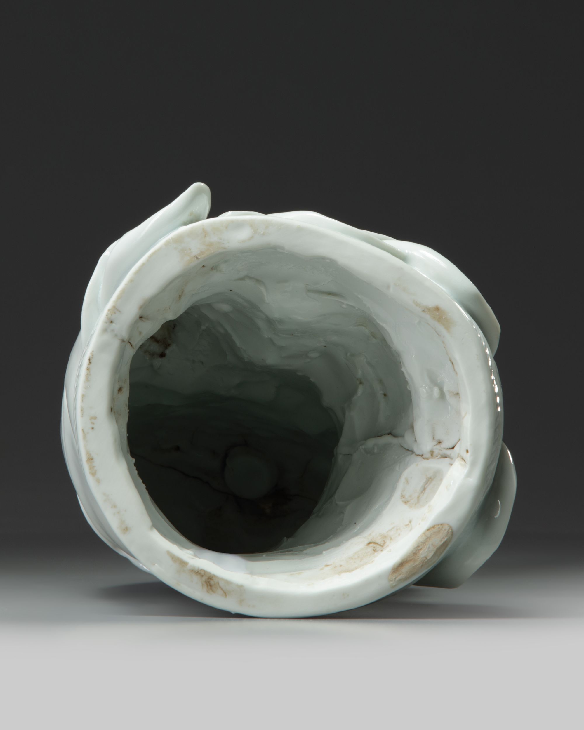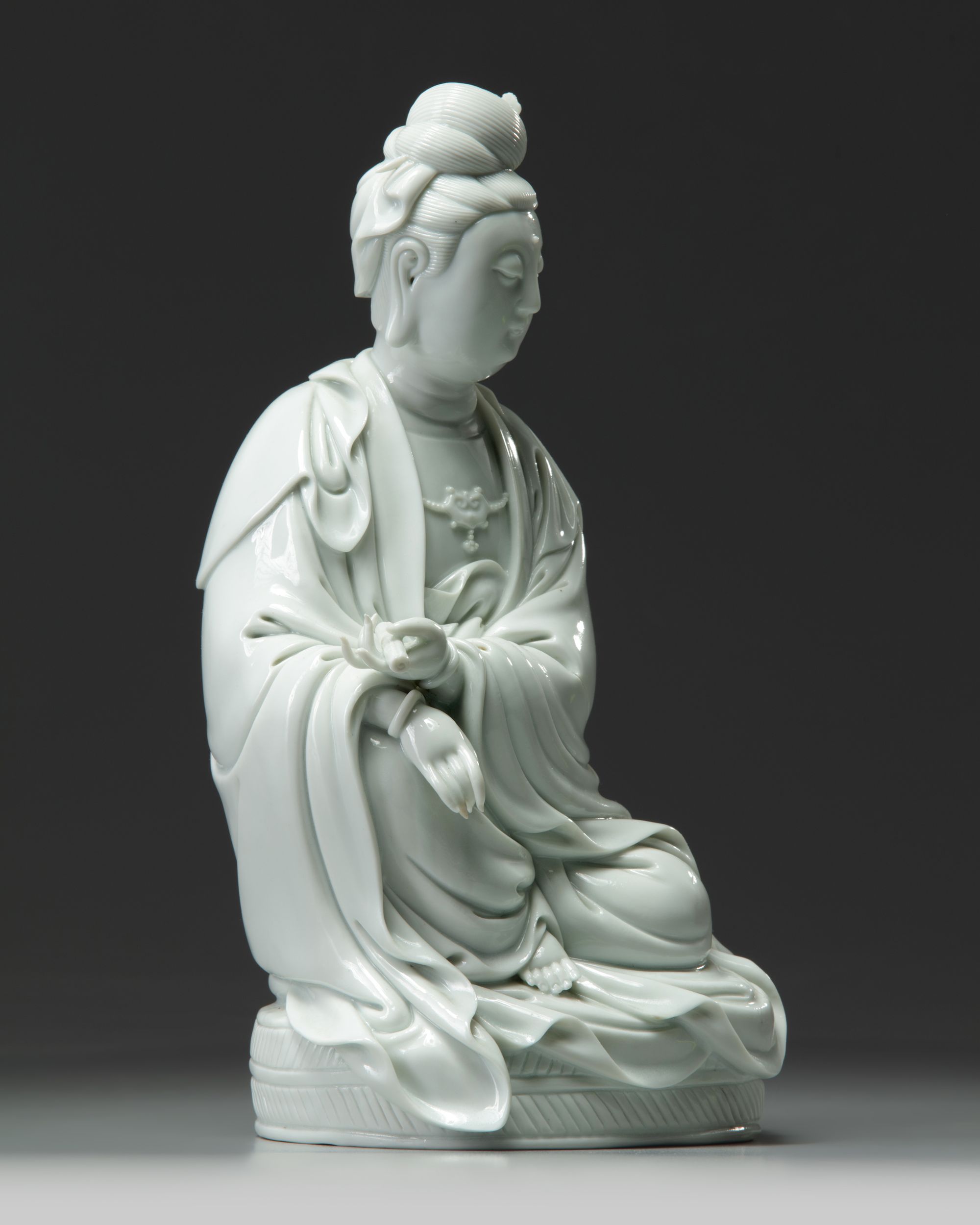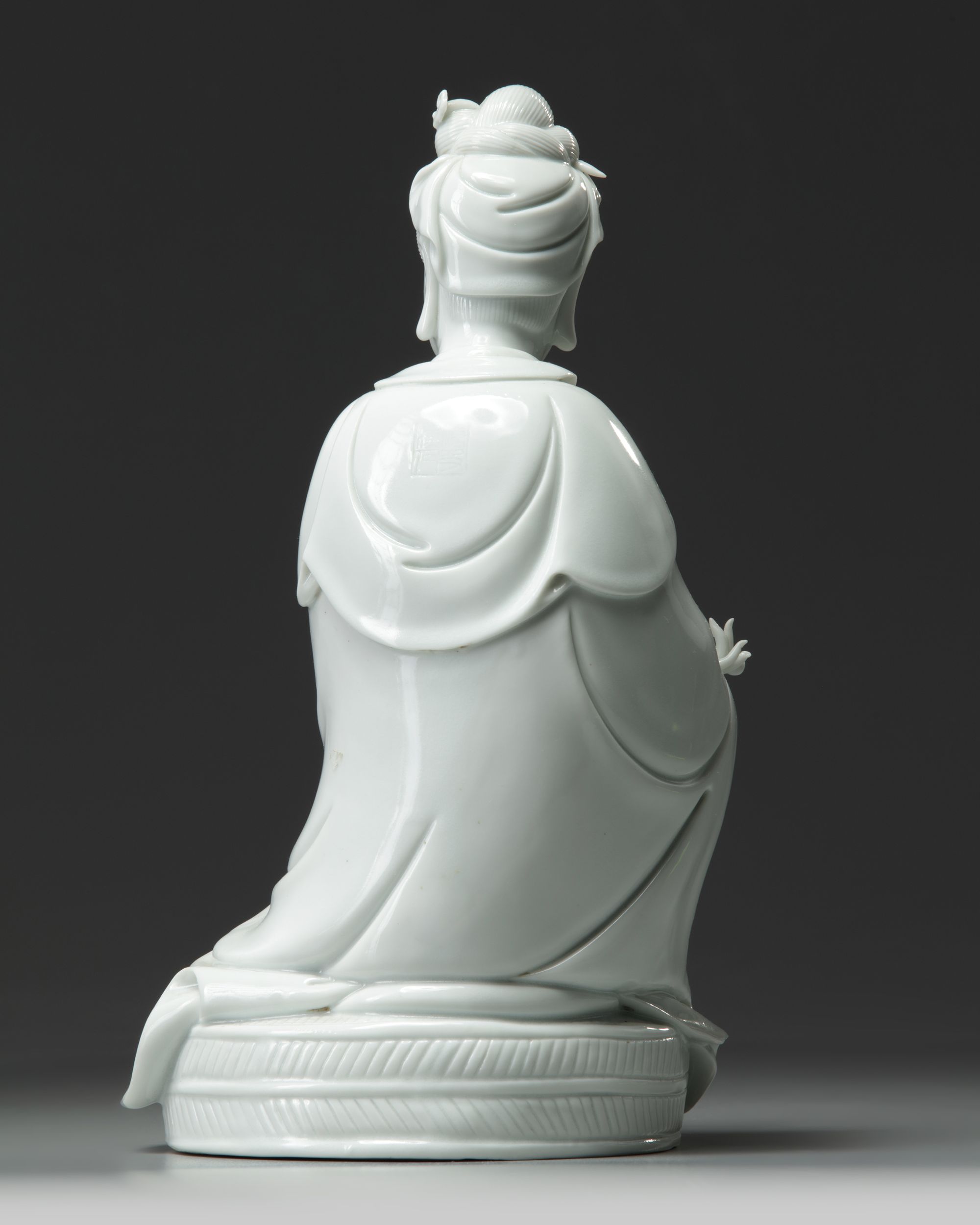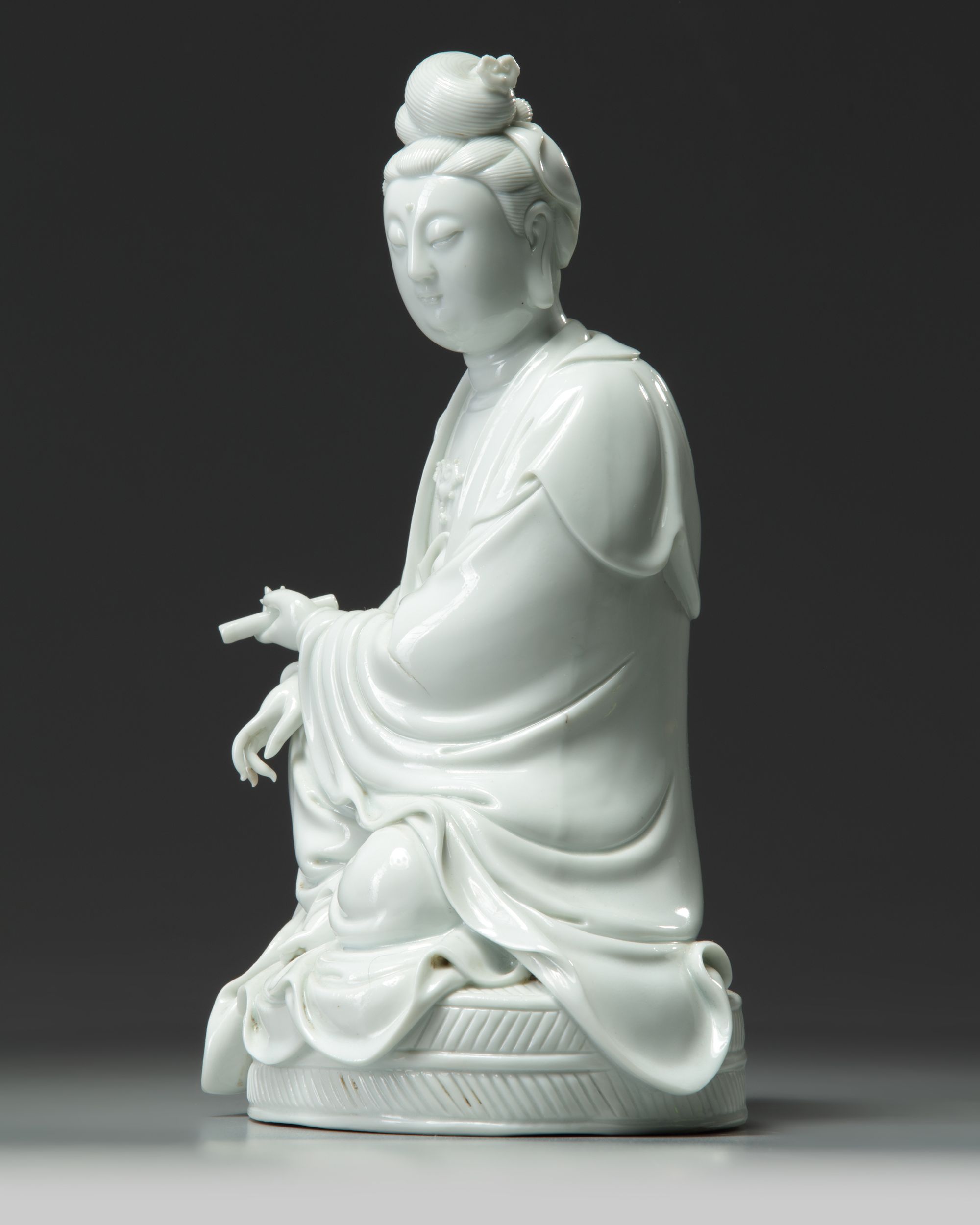The Goddess of Mercy is modelled with a serene expression below her hair in a high chignon held with a ruyi-head pin. She wears long draping robes and one of her hands holds a scroll while seated in Royal Ease on a rounded base. The reverse is stamped with a ‘boji yuren’ mark.