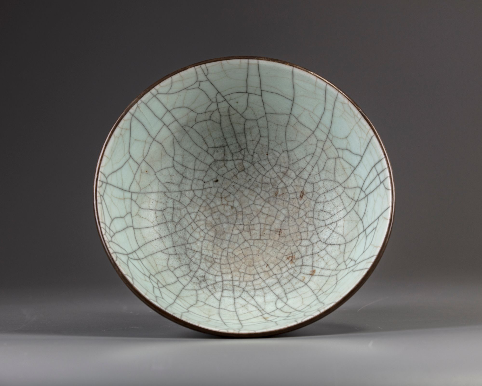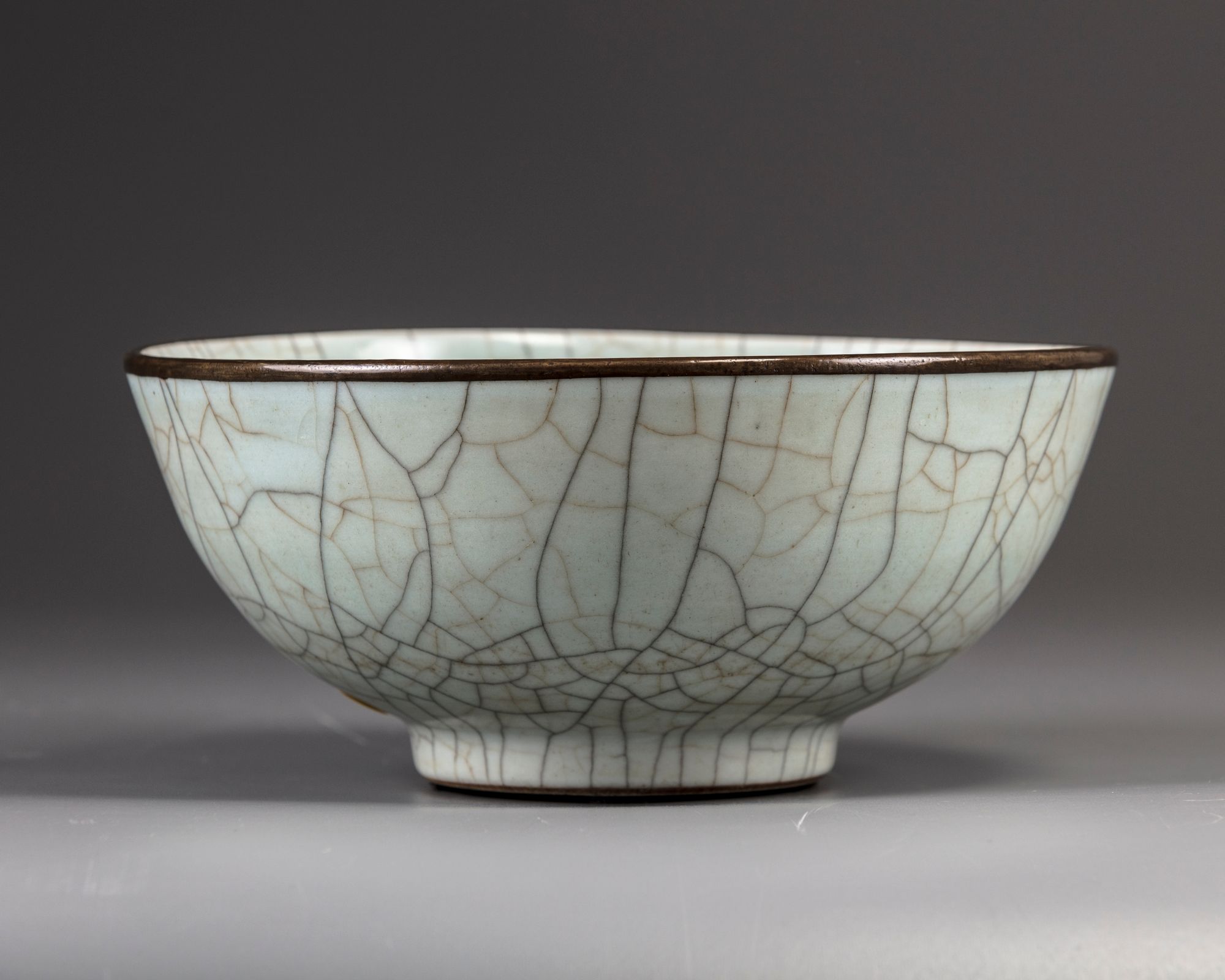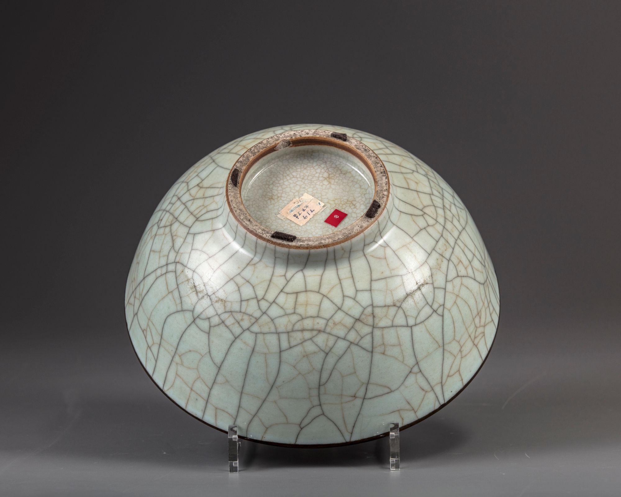The bowl is of deep rounded form rising from a short straight foot.The glaze is of a pale celadon tone with dark and light crackles