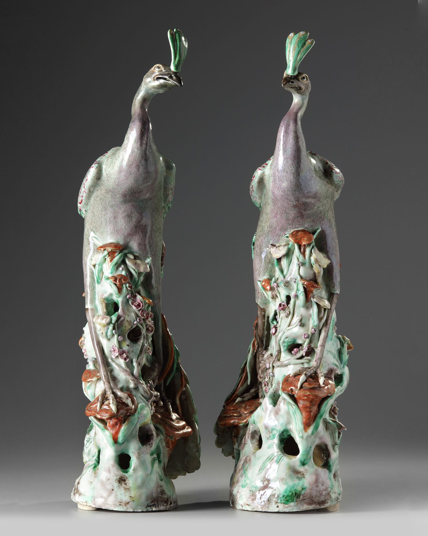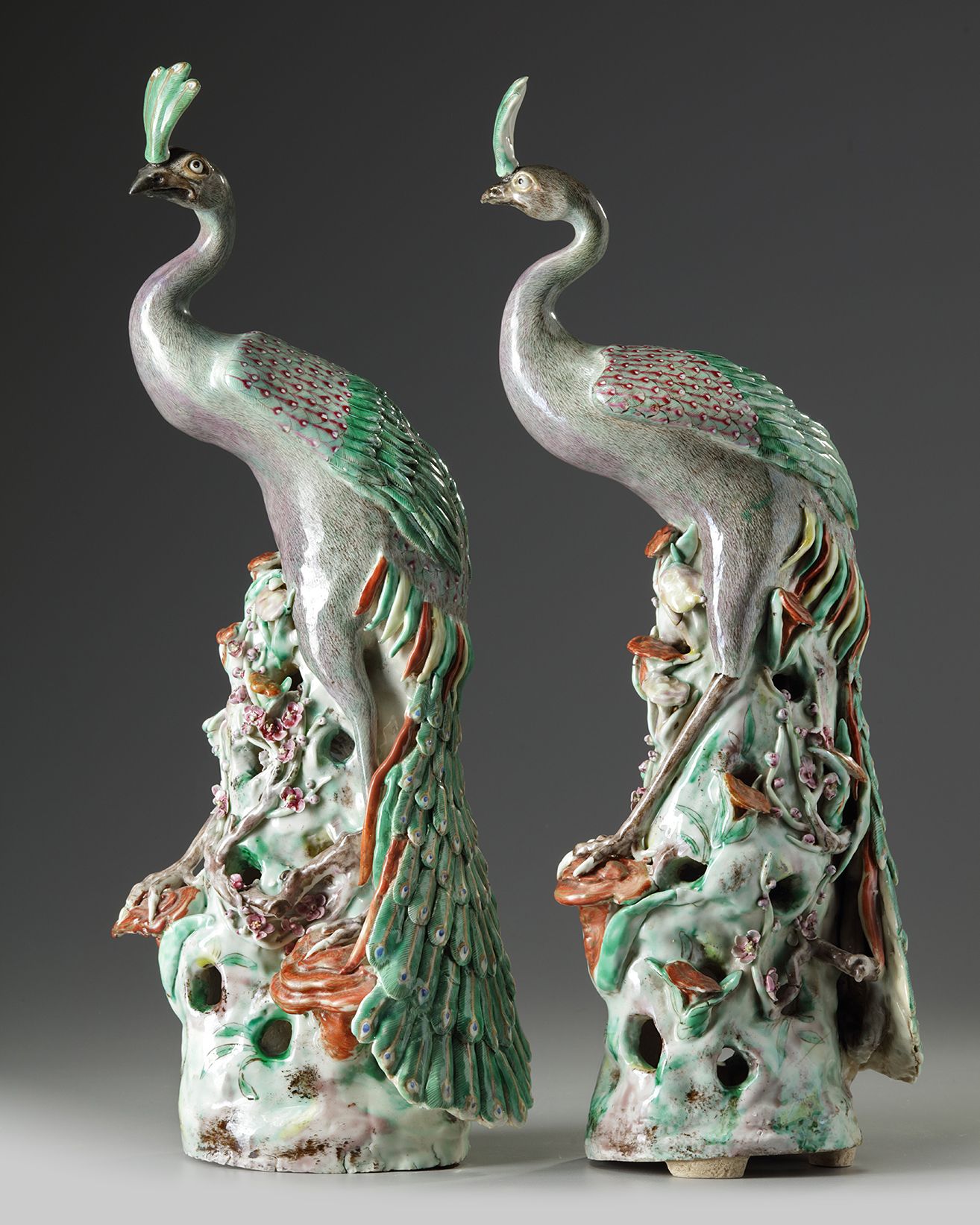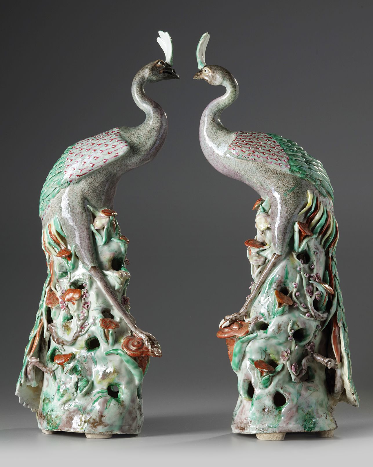 The peacocks are each elegantly modelled with their heads raised and their wings folded on their backs and their long tails trailing over the rocky base. The details of the feathers are finely executed in enamel. The base is delicately modelled and pierced with linghzi, bamboo, and prunus.