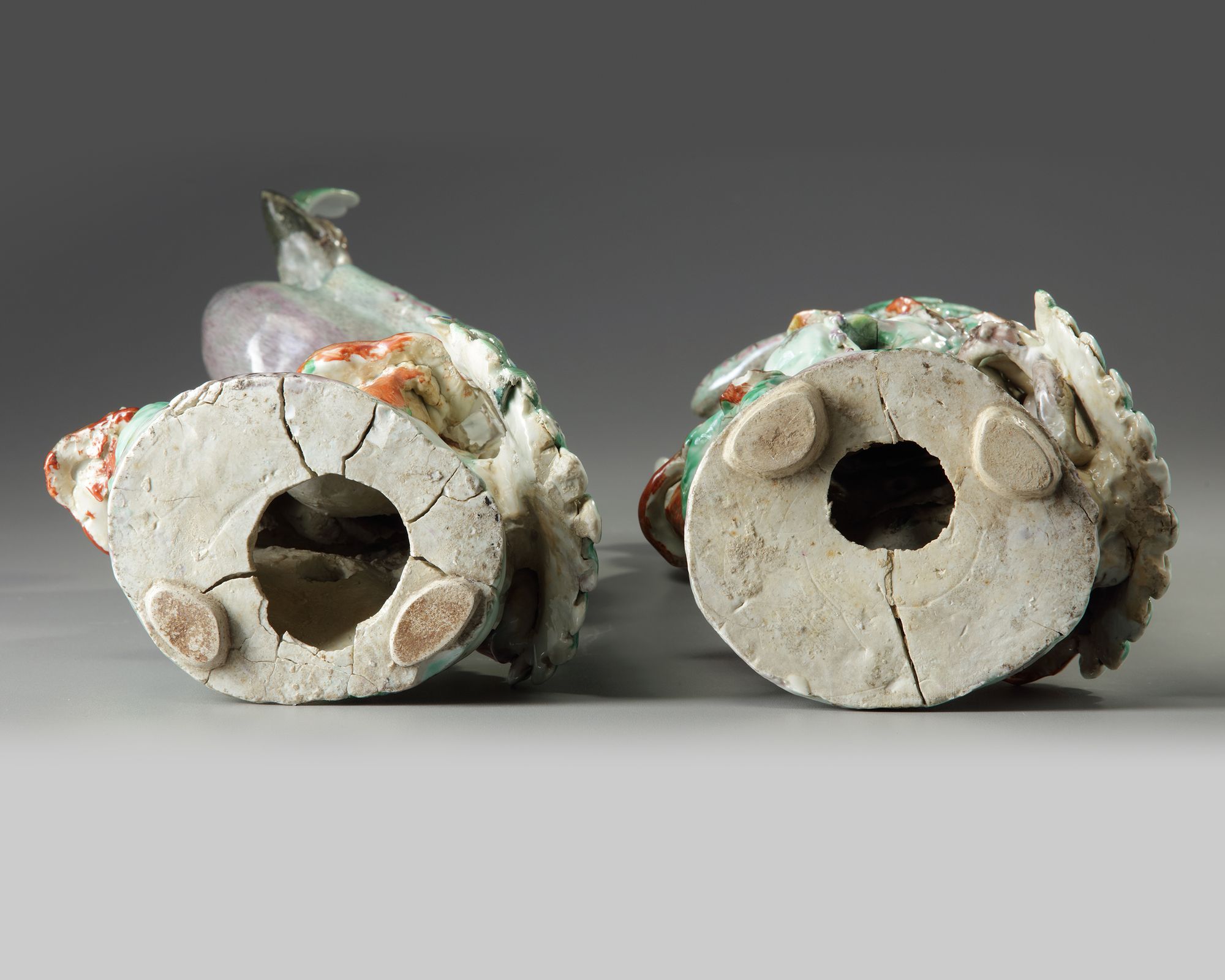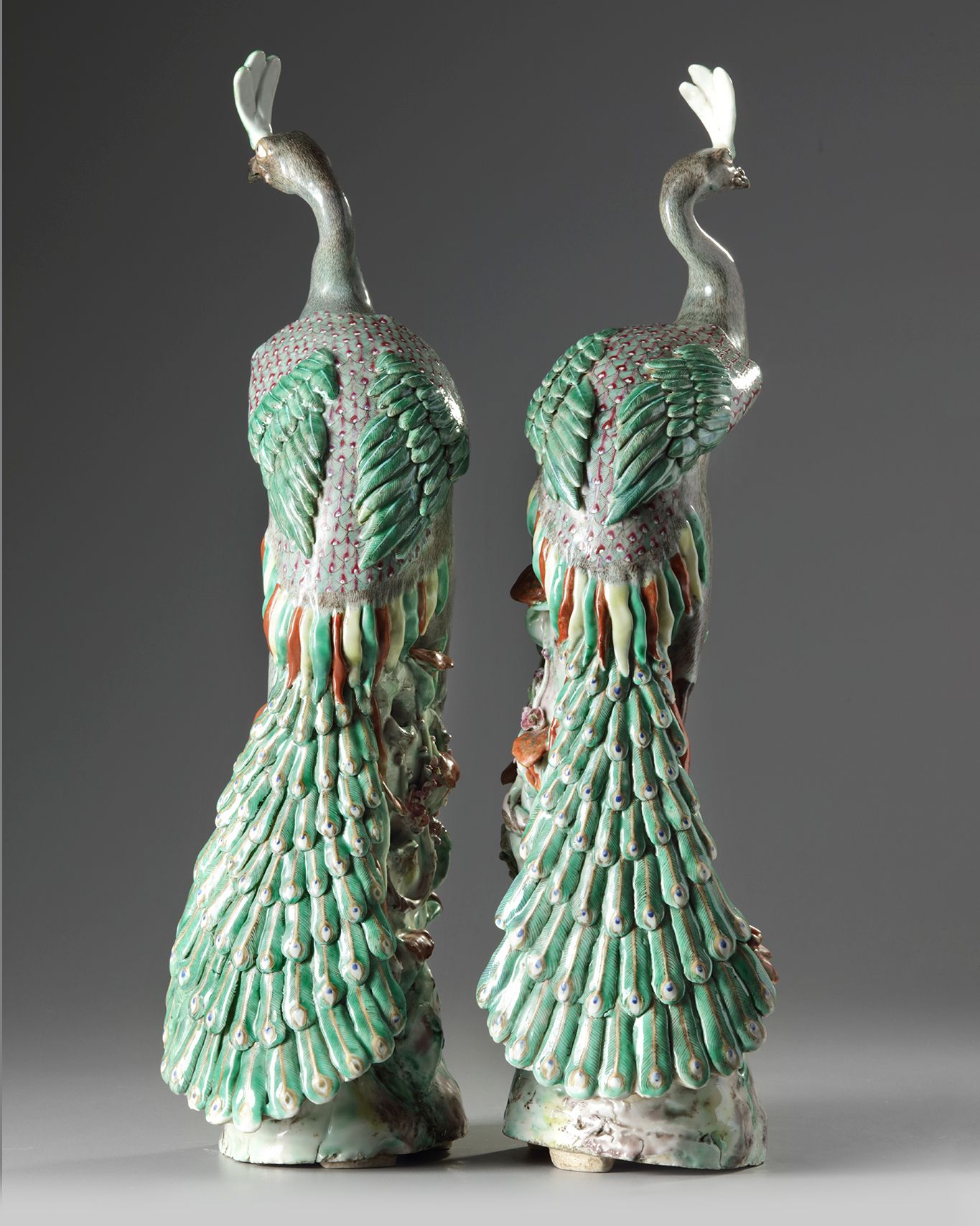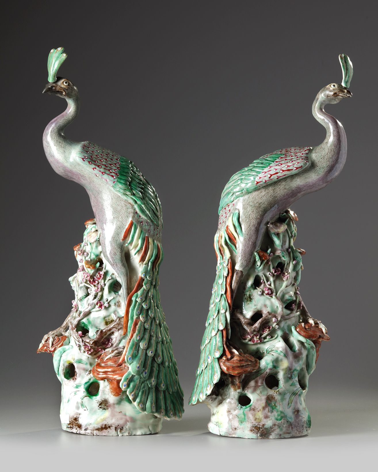 The peacocks are each elegantly modelled with their heads raised and their wings folded on their backs and their long tails trailing over the rocky base. The details of the feathers are finely executed in enamel. The base is delicately modelled and pierced with linghzi, bamboo, and prunus.