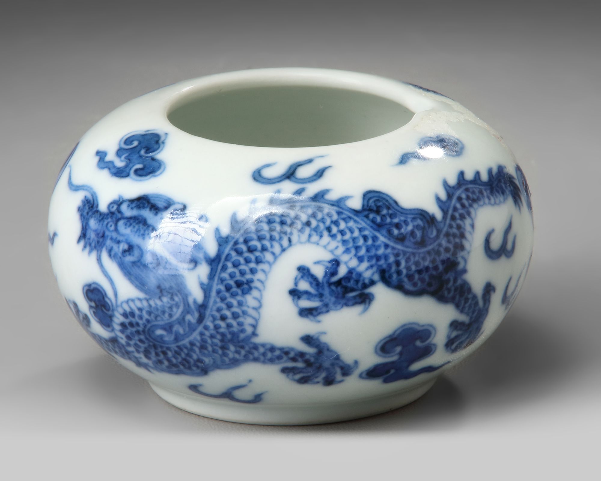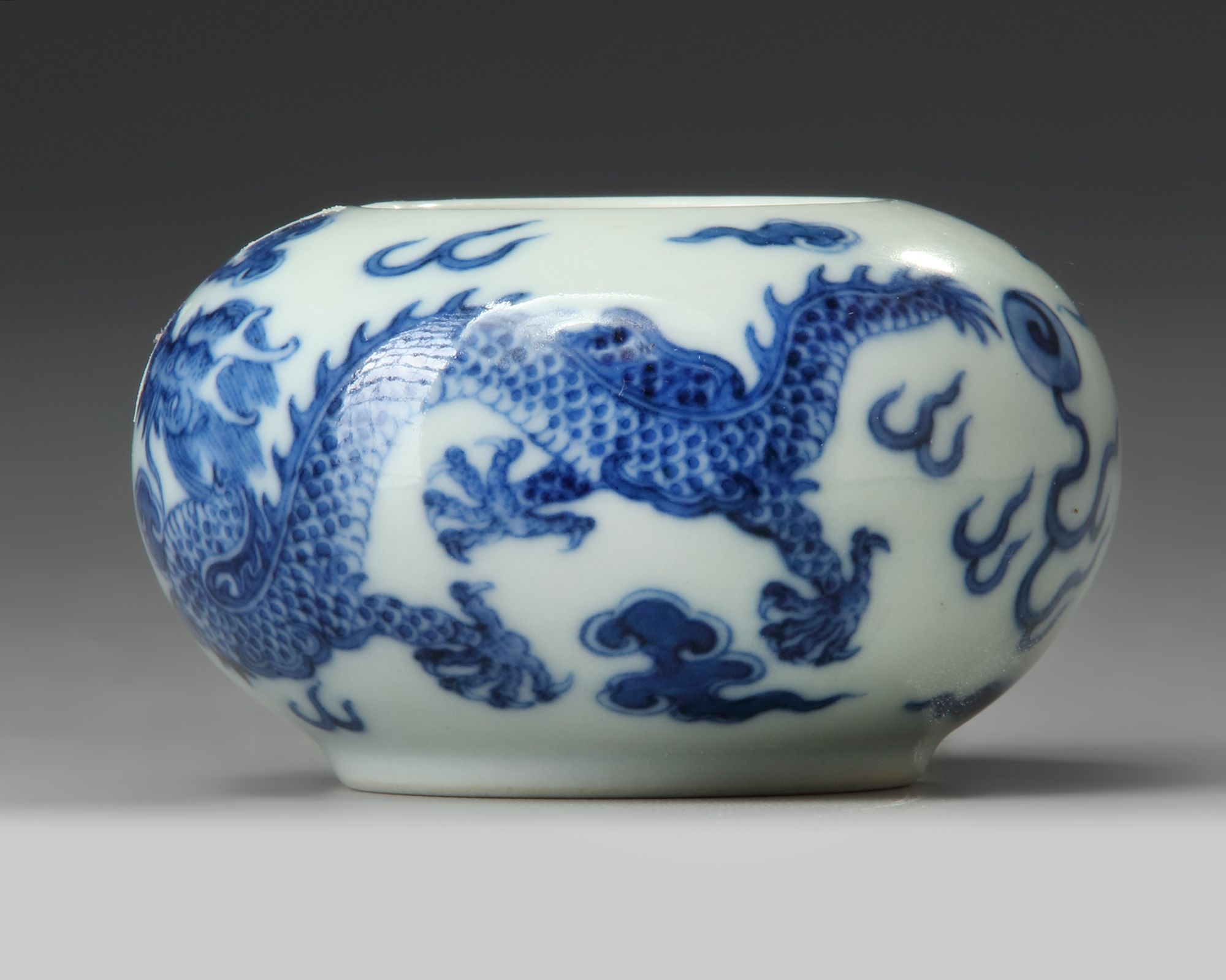 A small Chinese blue and white pot, decorated with two dragon chasing a flaming pearl amongst clouds.