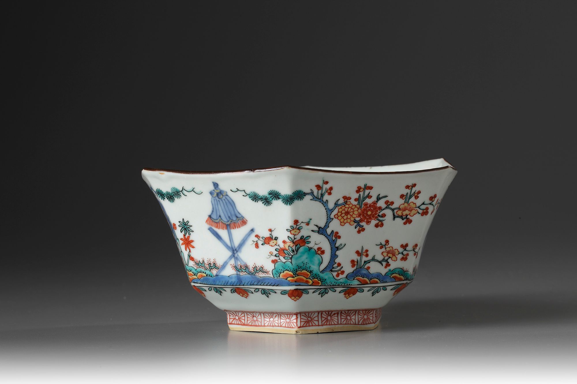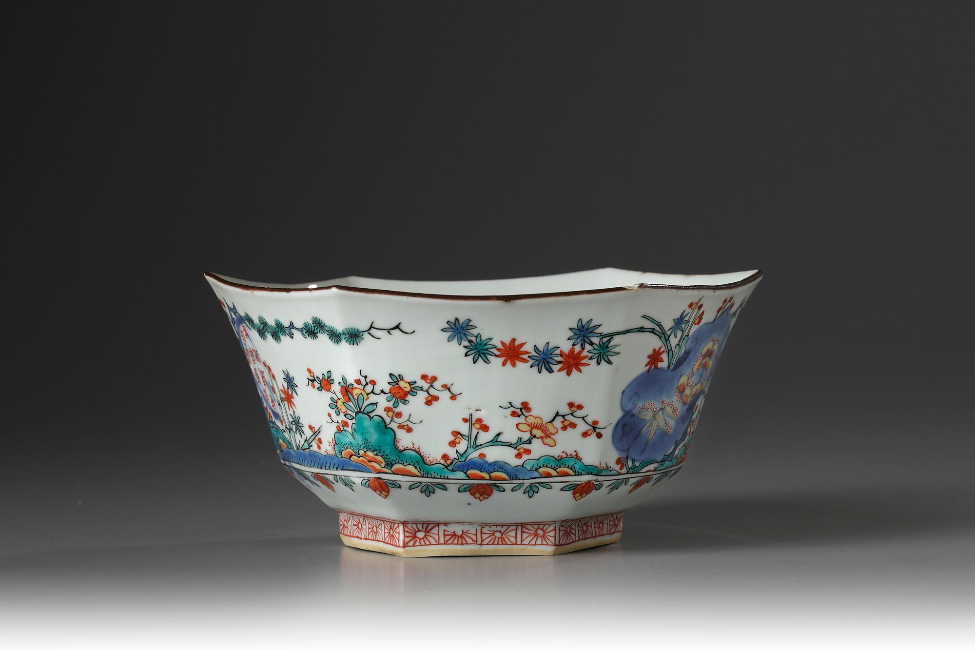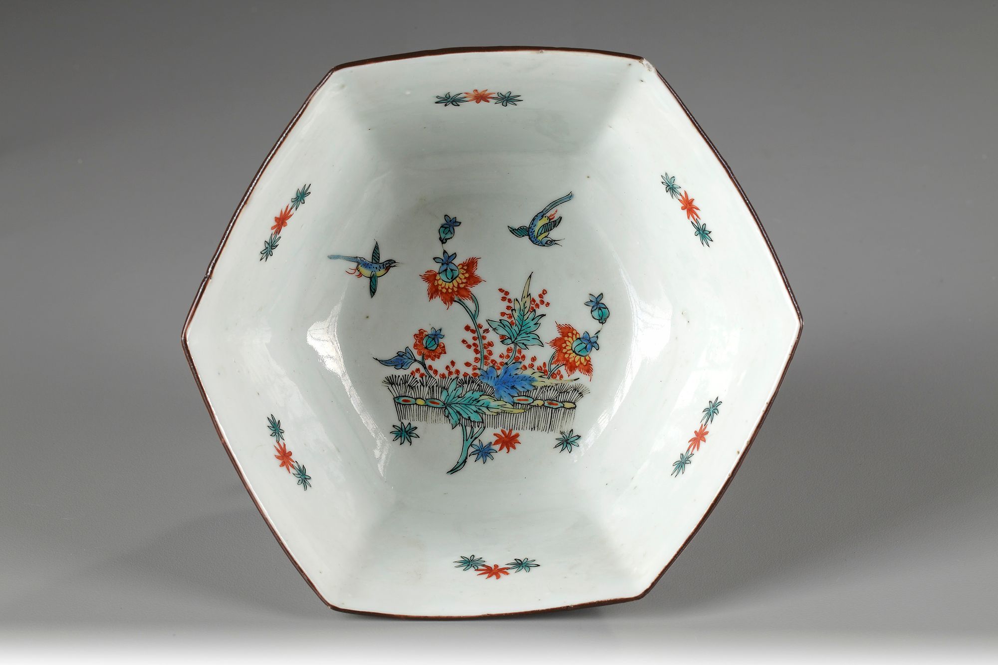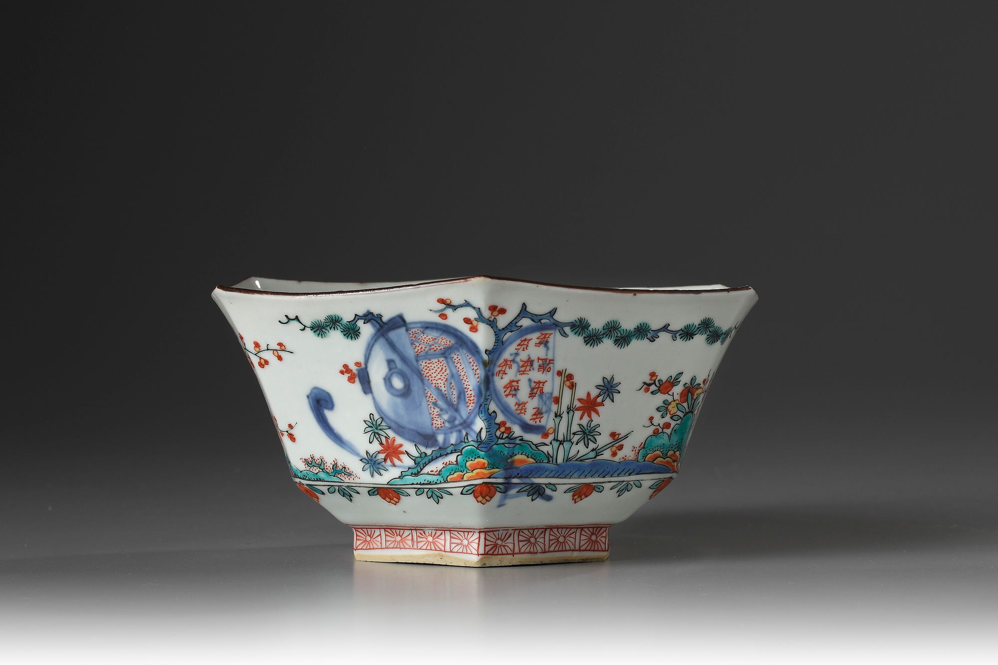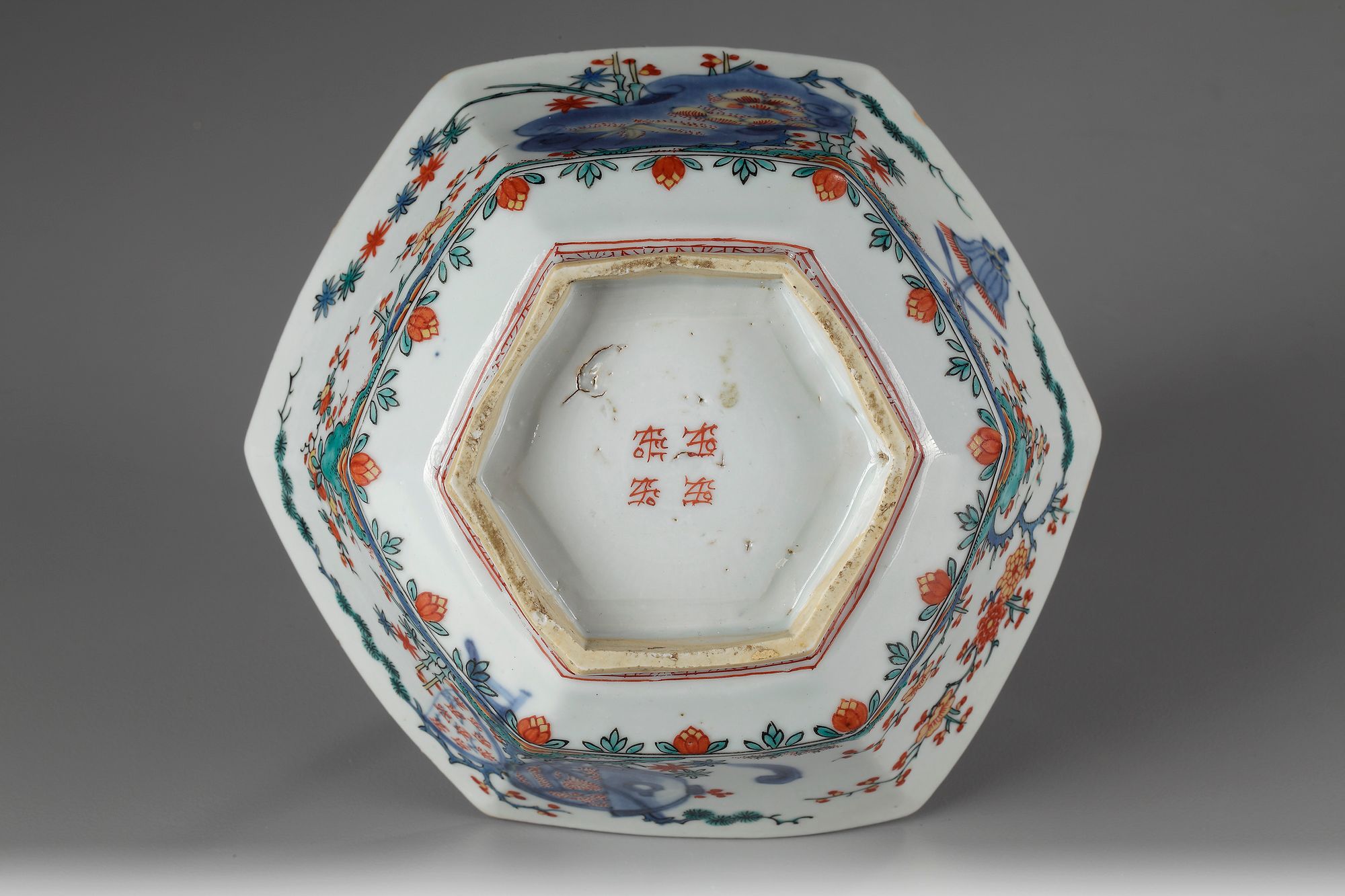 Hexagonal shaped bowl, decorated in underglaze blue with red, green, yellow and black enamel, showing bamboo, pine and flowering branches among rock work.
