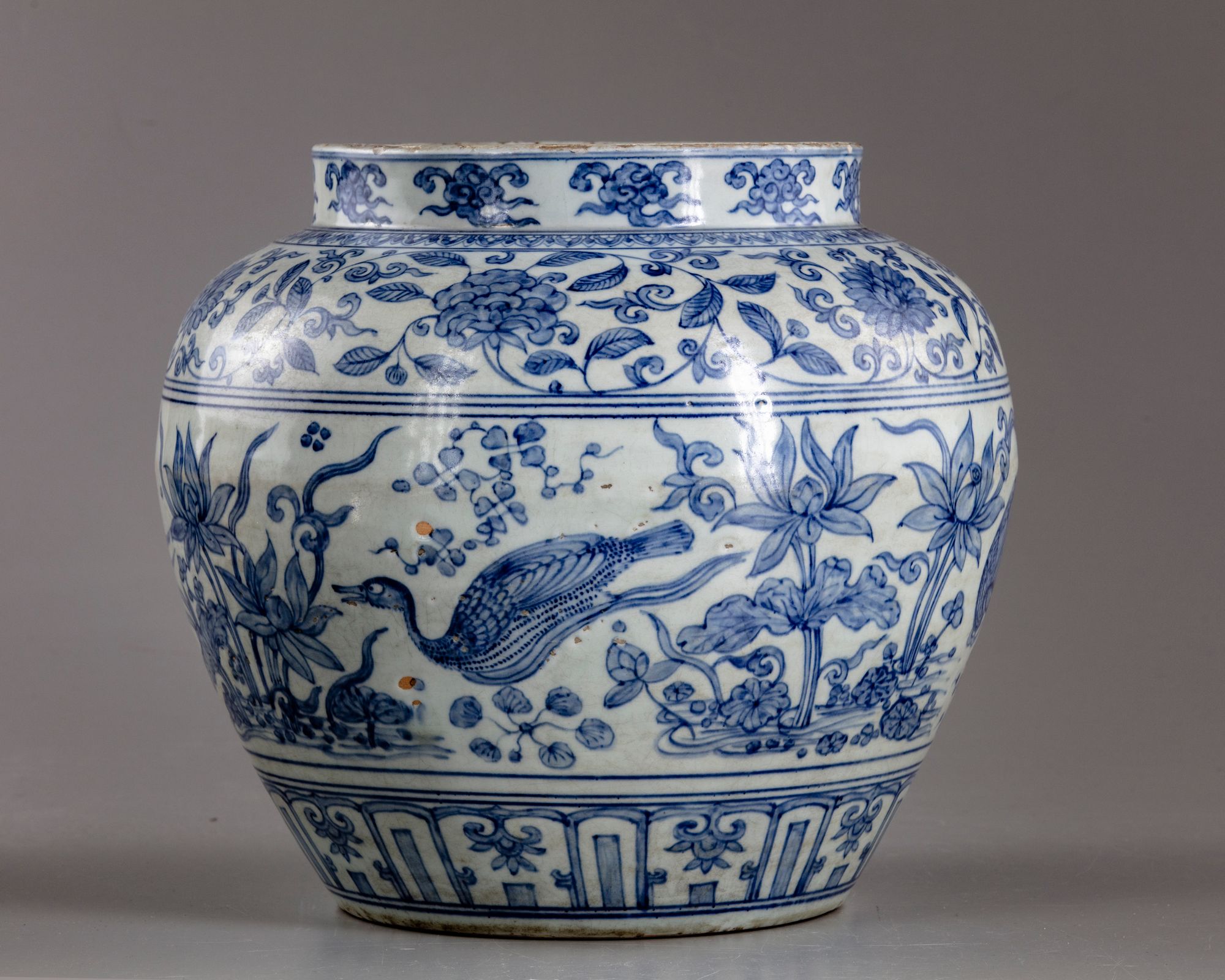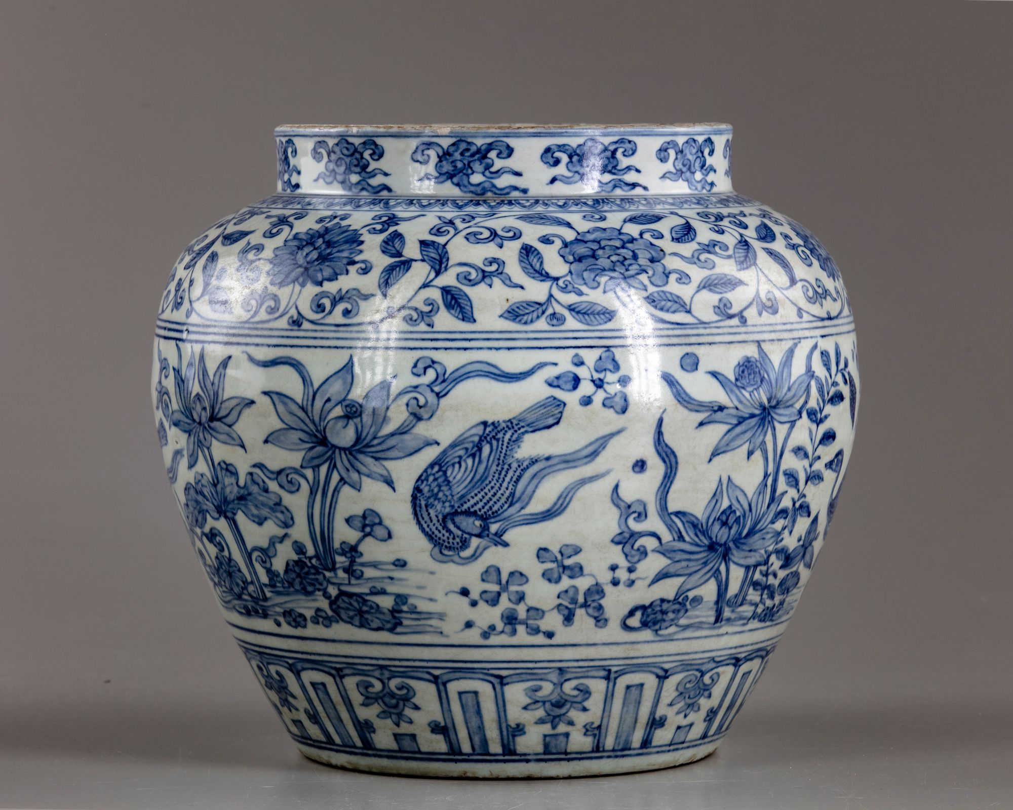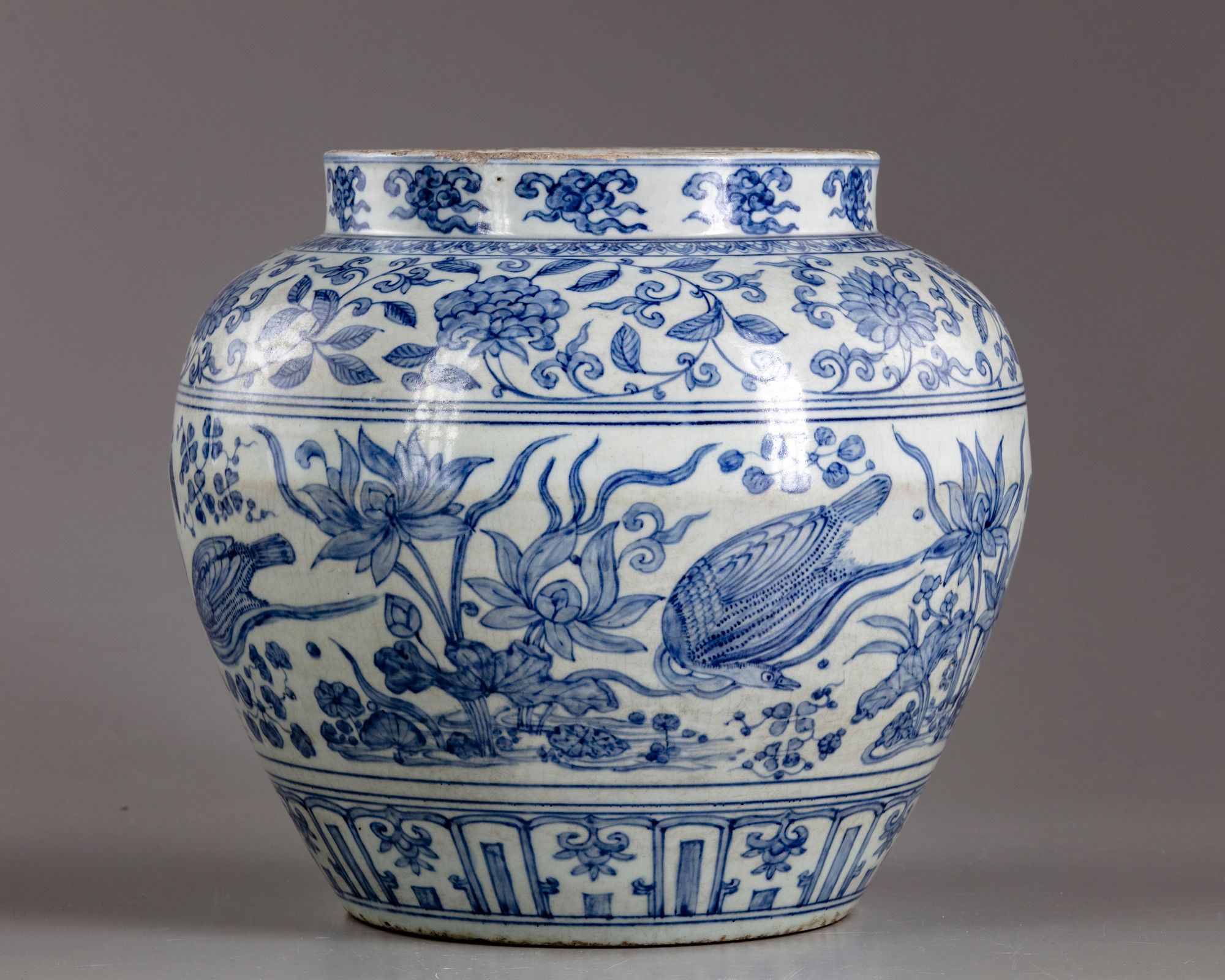 The jar is decorated to the neck with a band of cloud scrolls above a band of flower scrolls to the shoulder. The body is decorated with a wide band of ducks swimming in a lotus pond amongst water weeds, all above a lappet band at the foot.
