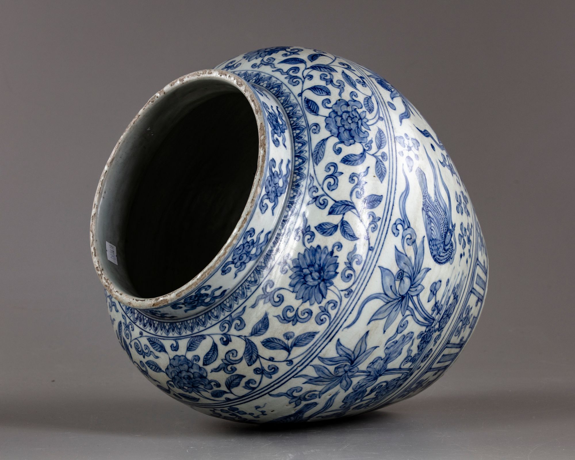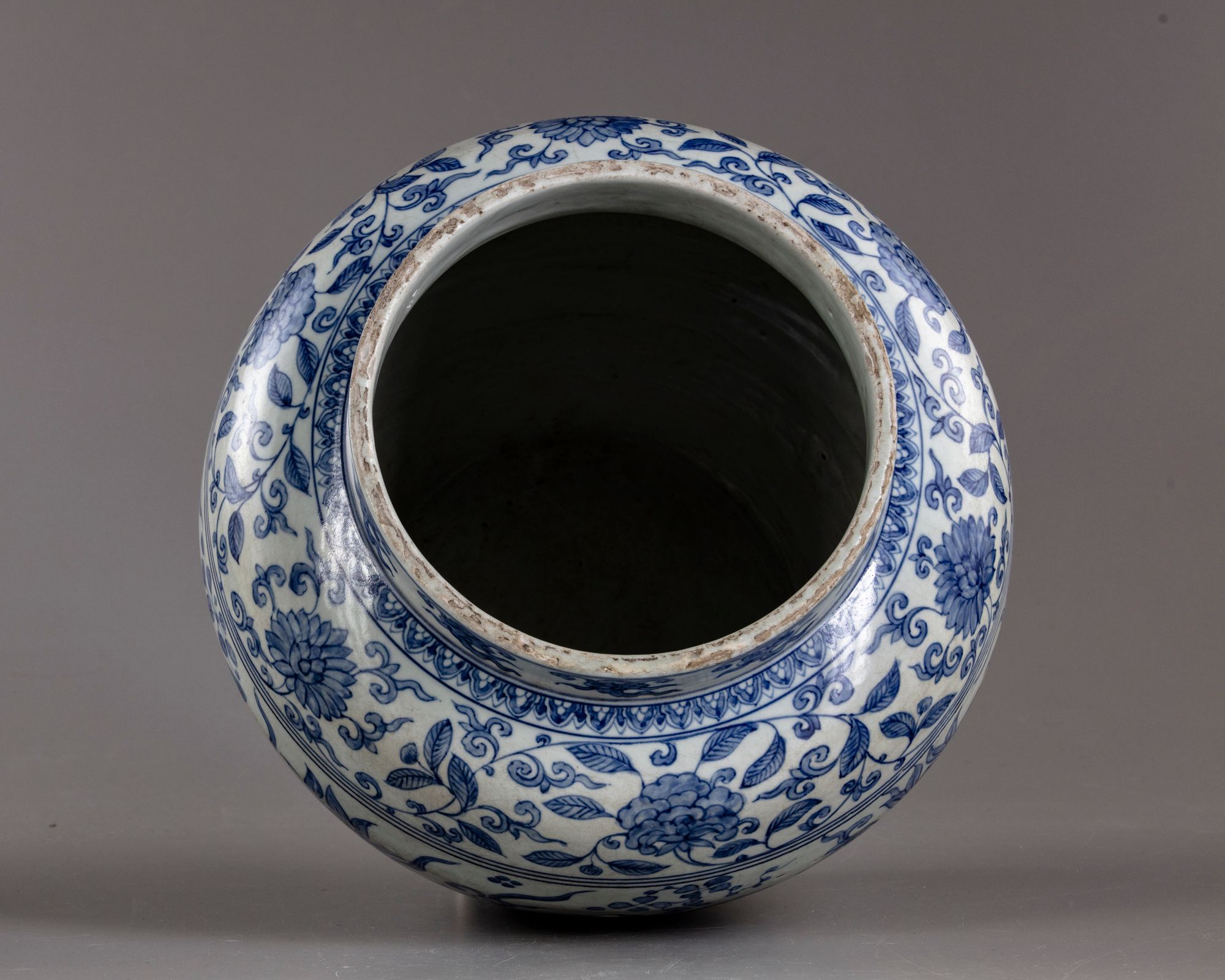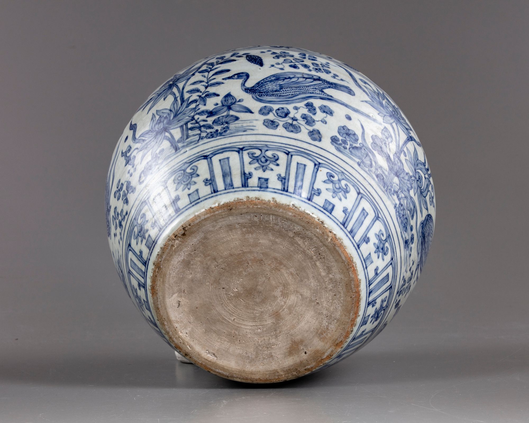 The jar is decorated to the neck with a band of cloud scrolls above a band of flower scrolls to the shoulder. The body is decorated with a wide band of ducks swimming in a lotus pond amongst water weeds, all above a lappet band at the foot.