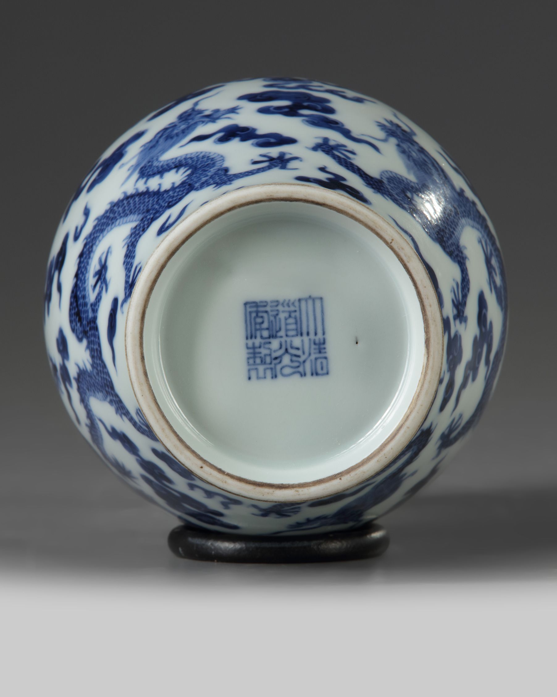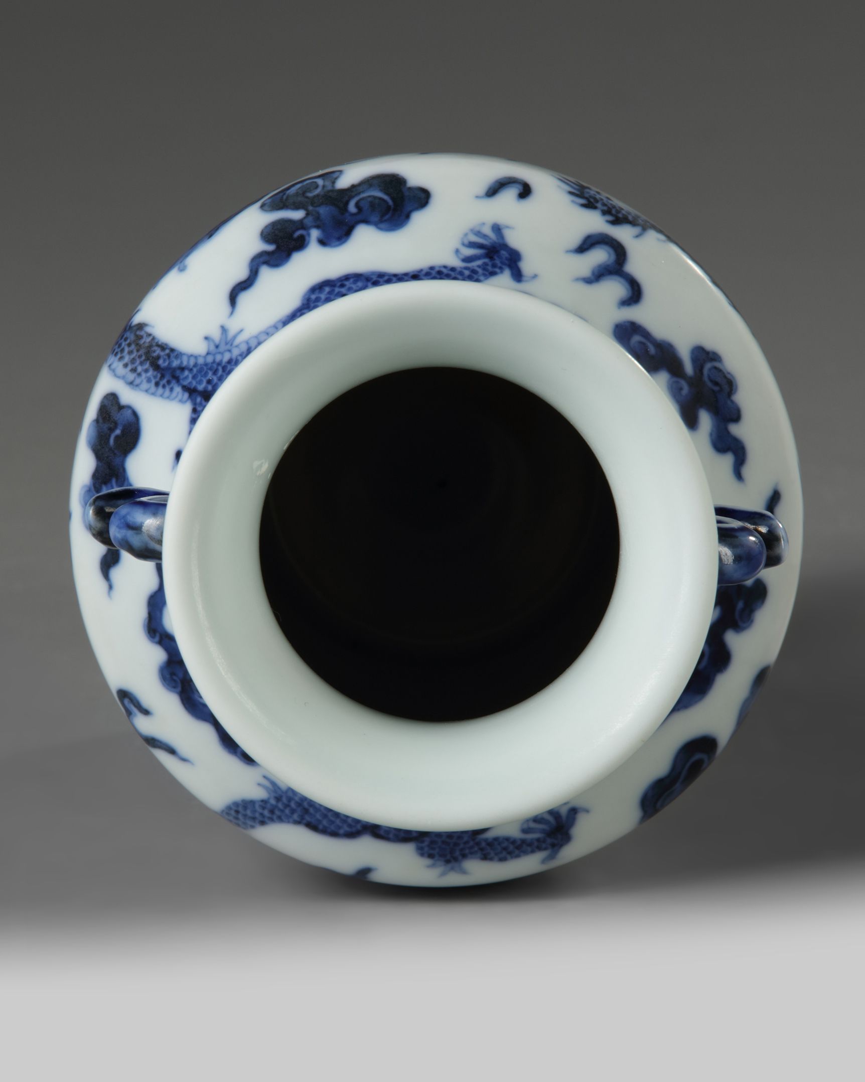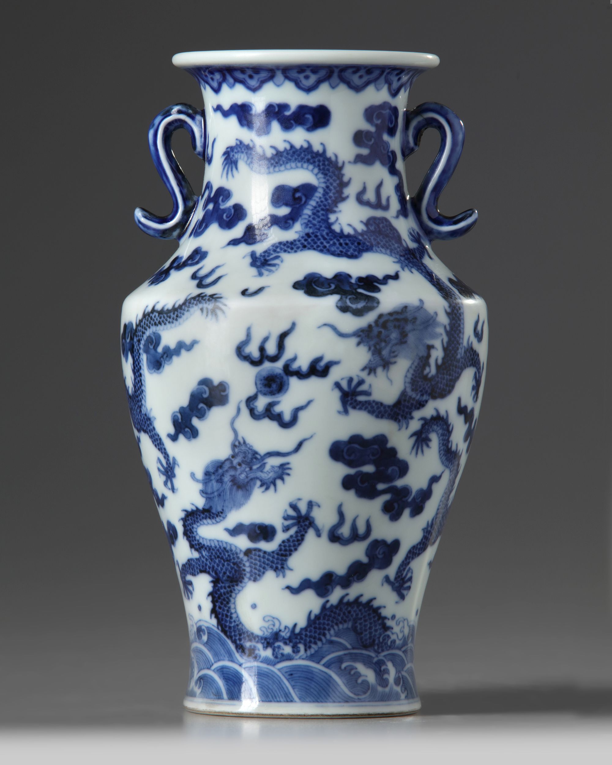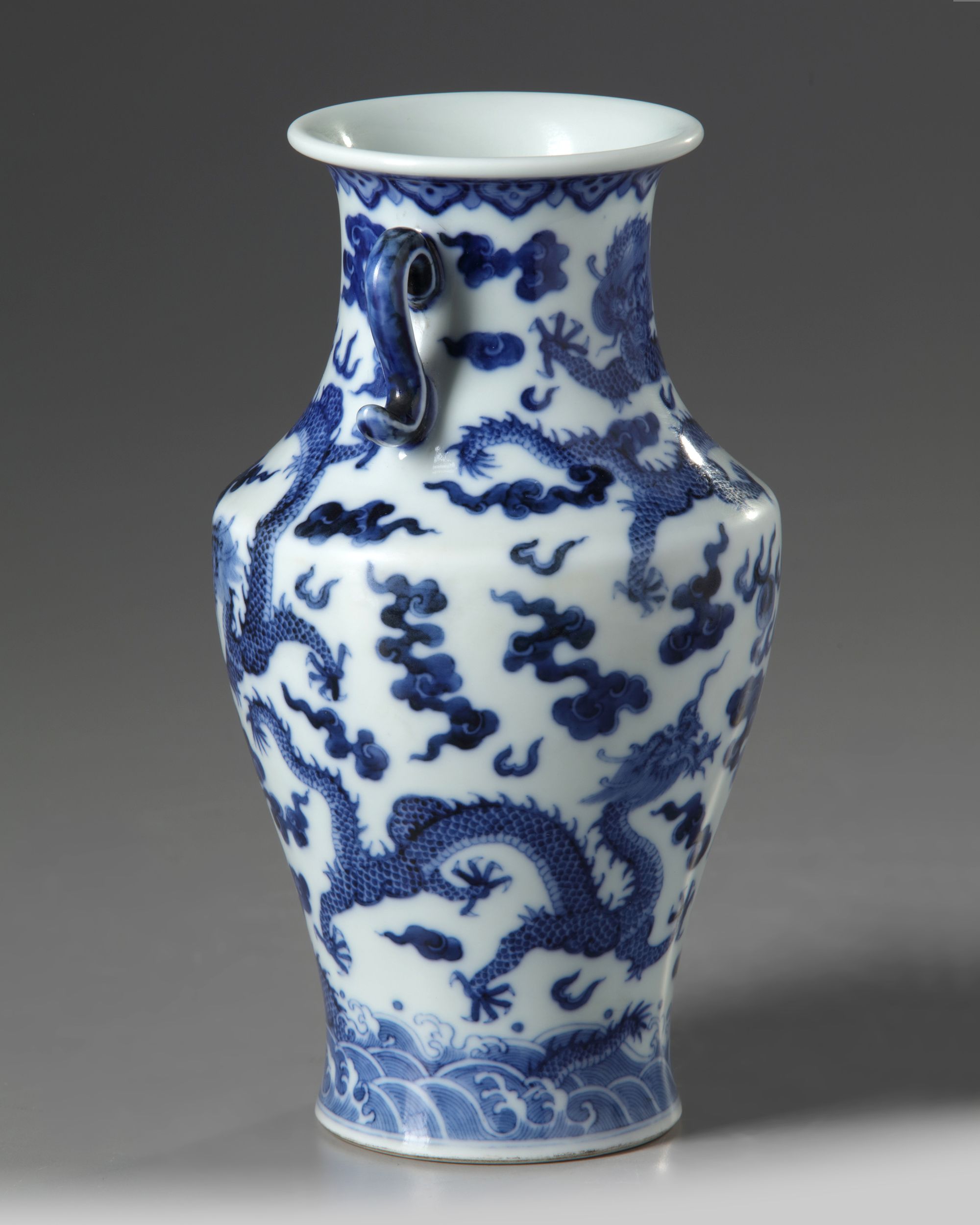The vase is decorated with two shaped handles at the neck, the body with five dragons chasing the flaming pearl amongst cloud scrolls above tumultuous waves. The base with a Daoguang mark in underglaze blue.