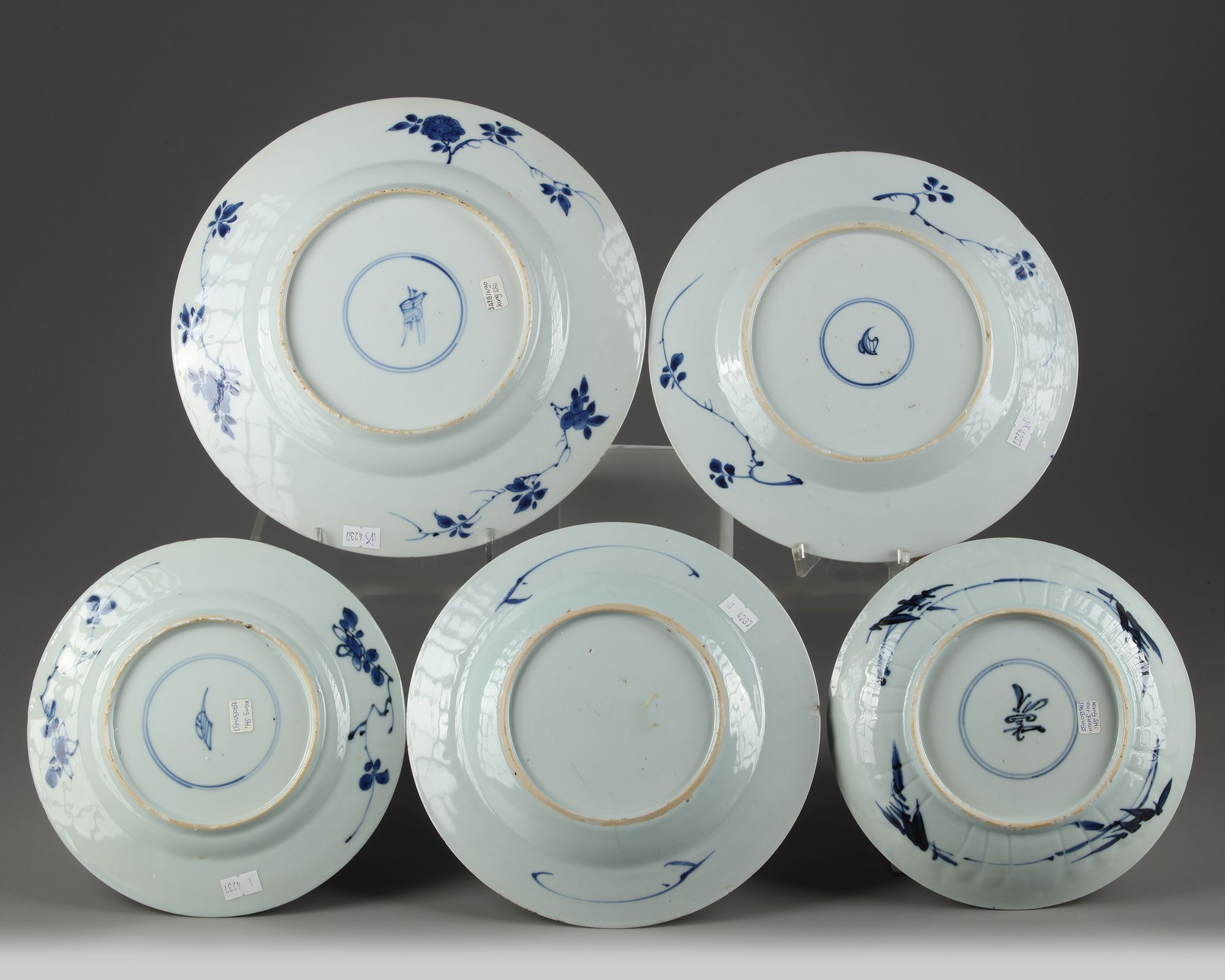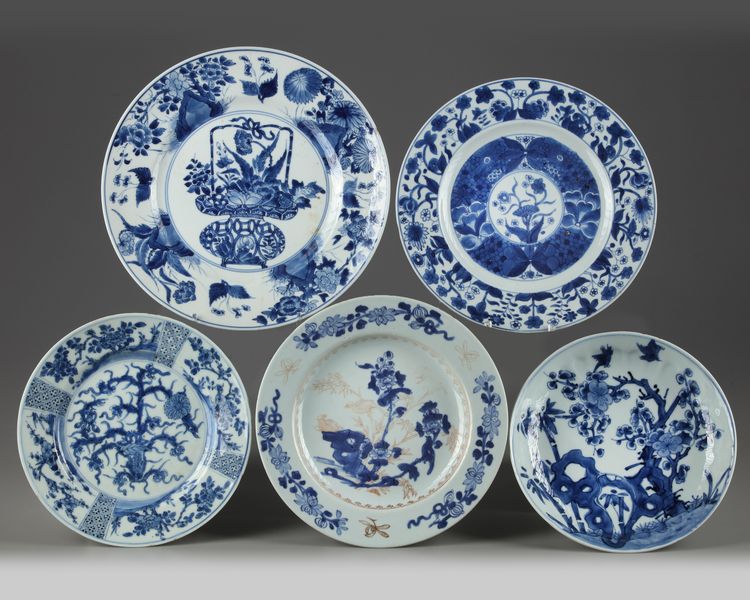 The group comprises: a dish decorated to the centre with a ‘shou’ character surrounded by cartouches enclosing peaches on a fish scale ground, the border decorated with floral cartouches on a diaper ground, the reverse with further ‘shou’ characters and an apocryphal Chenghua mark; a dish decorated to the centre with a cartouche enclosing a lily blossom on a trellis ground, the rim decorated with eight flower sprays; an Islamic-market dish decorated with flower sprays and flower panels on a scroll ground; a ‘Joosje te paard’ hunting dish mounted with a silver swing handle stamped with a Lion Passant and a further mark, the base with an apocryphal Chenghua mark in a double circle; and an iron-red decorated blue and white ‘lotus petal’ dish, the base with a ‘Tai ji die ban’ mark, 19th-20th century.