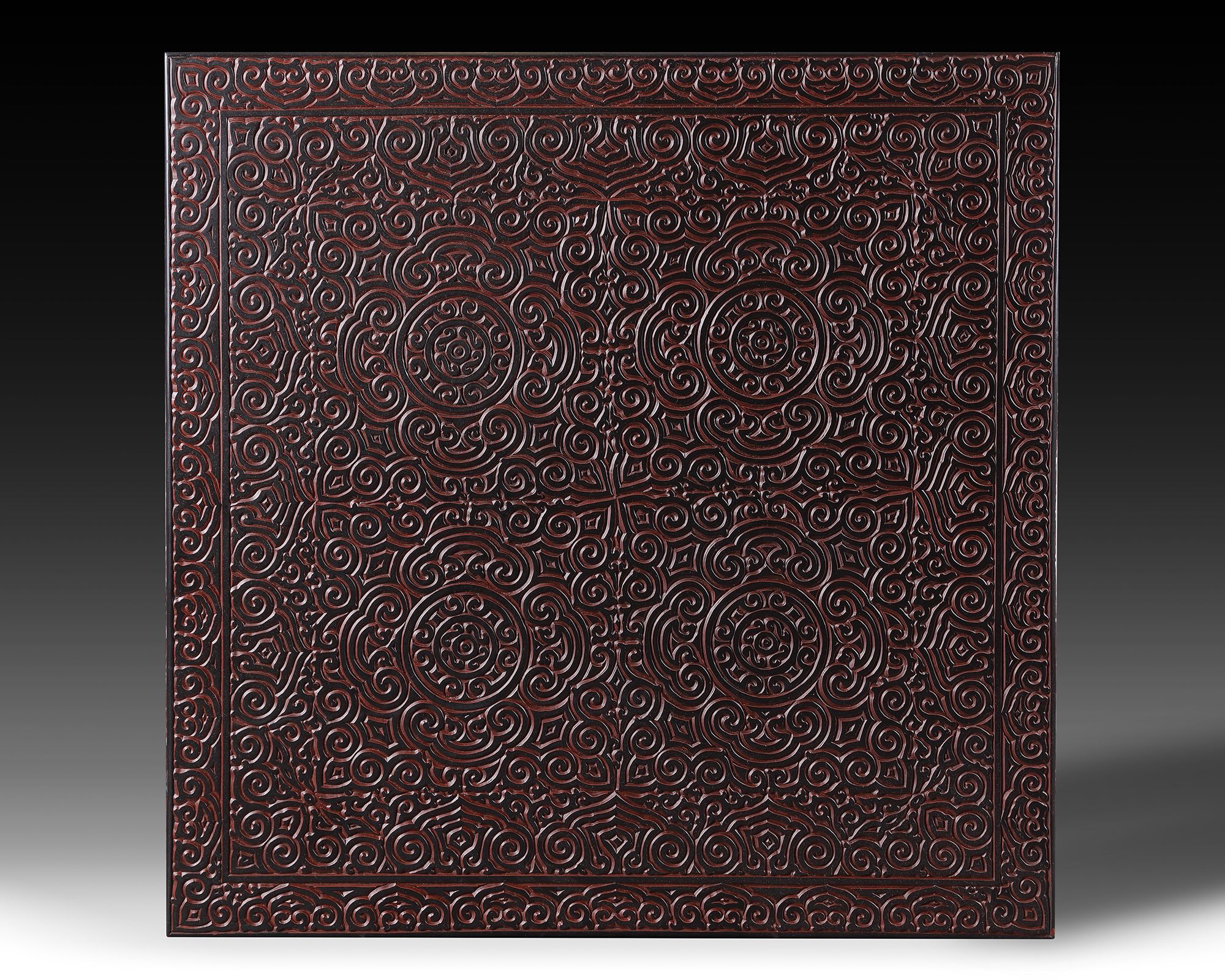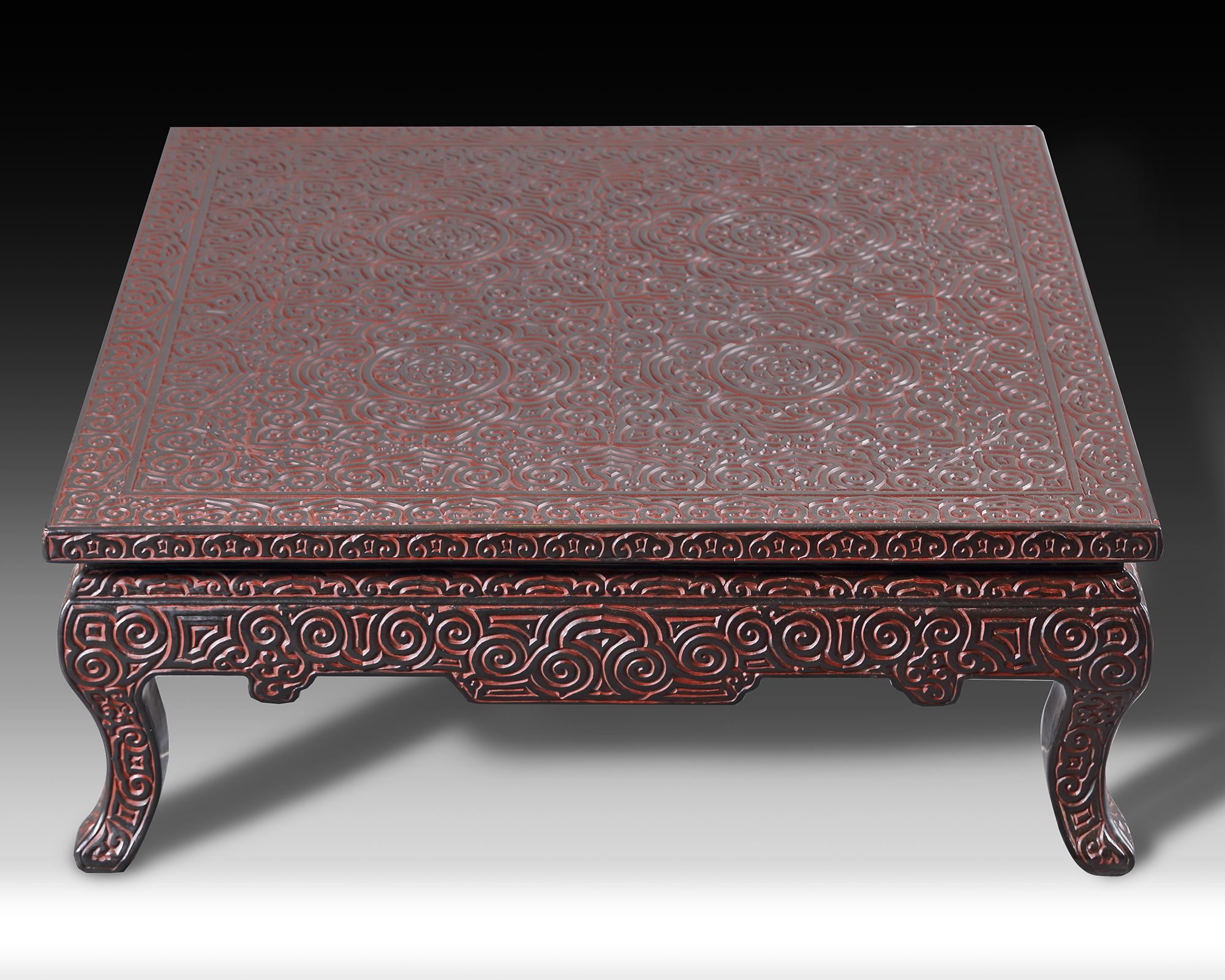 Low square Chinese tsuishitsu (carved lacquer) lacquerware table decorated with a guri-pattern ('in the