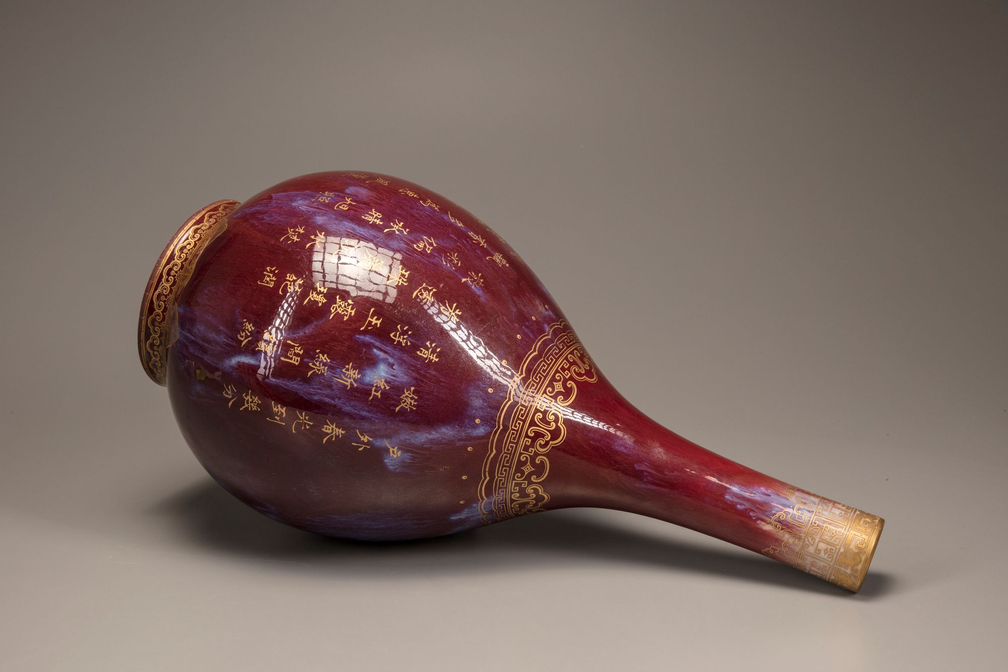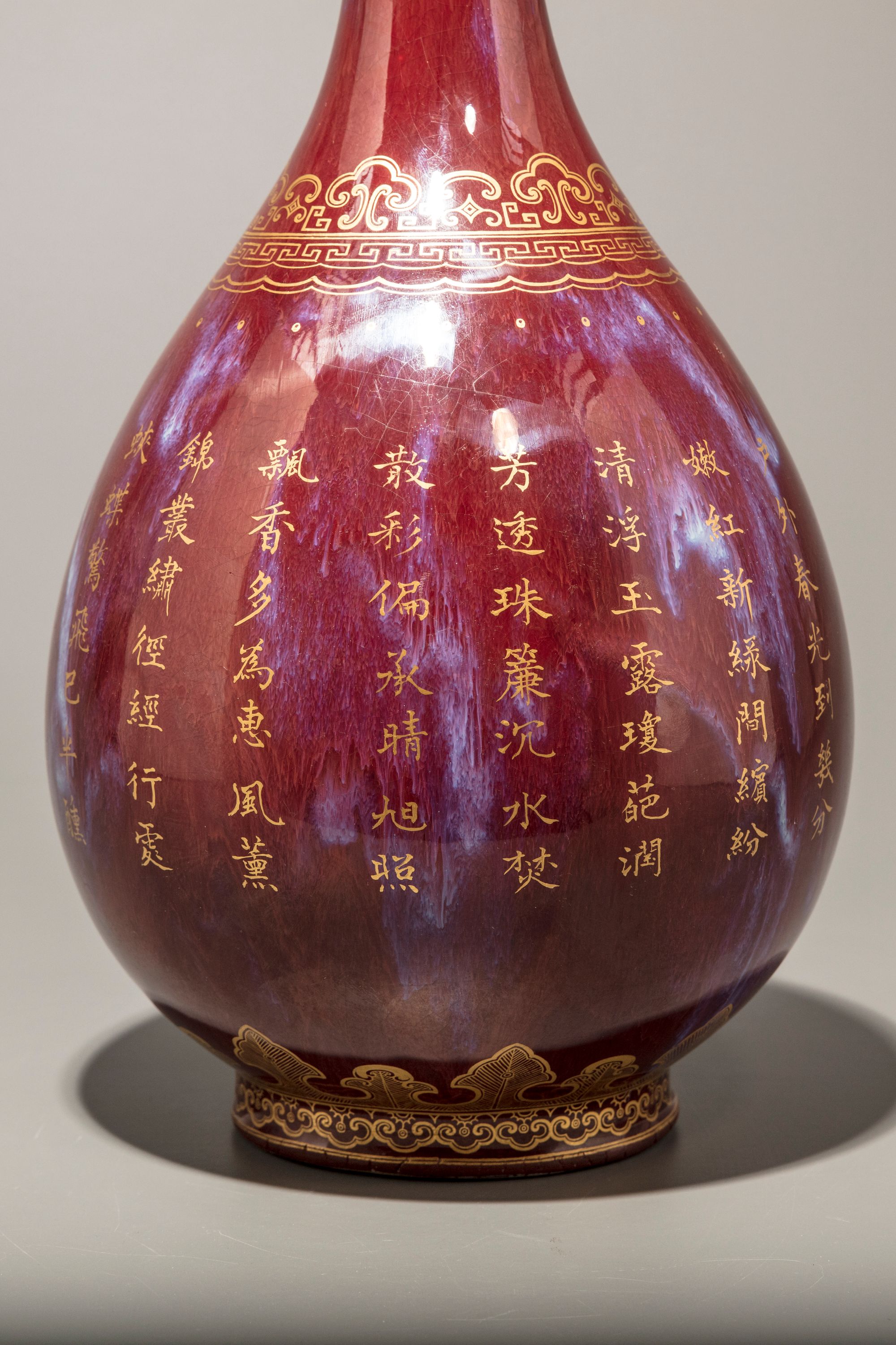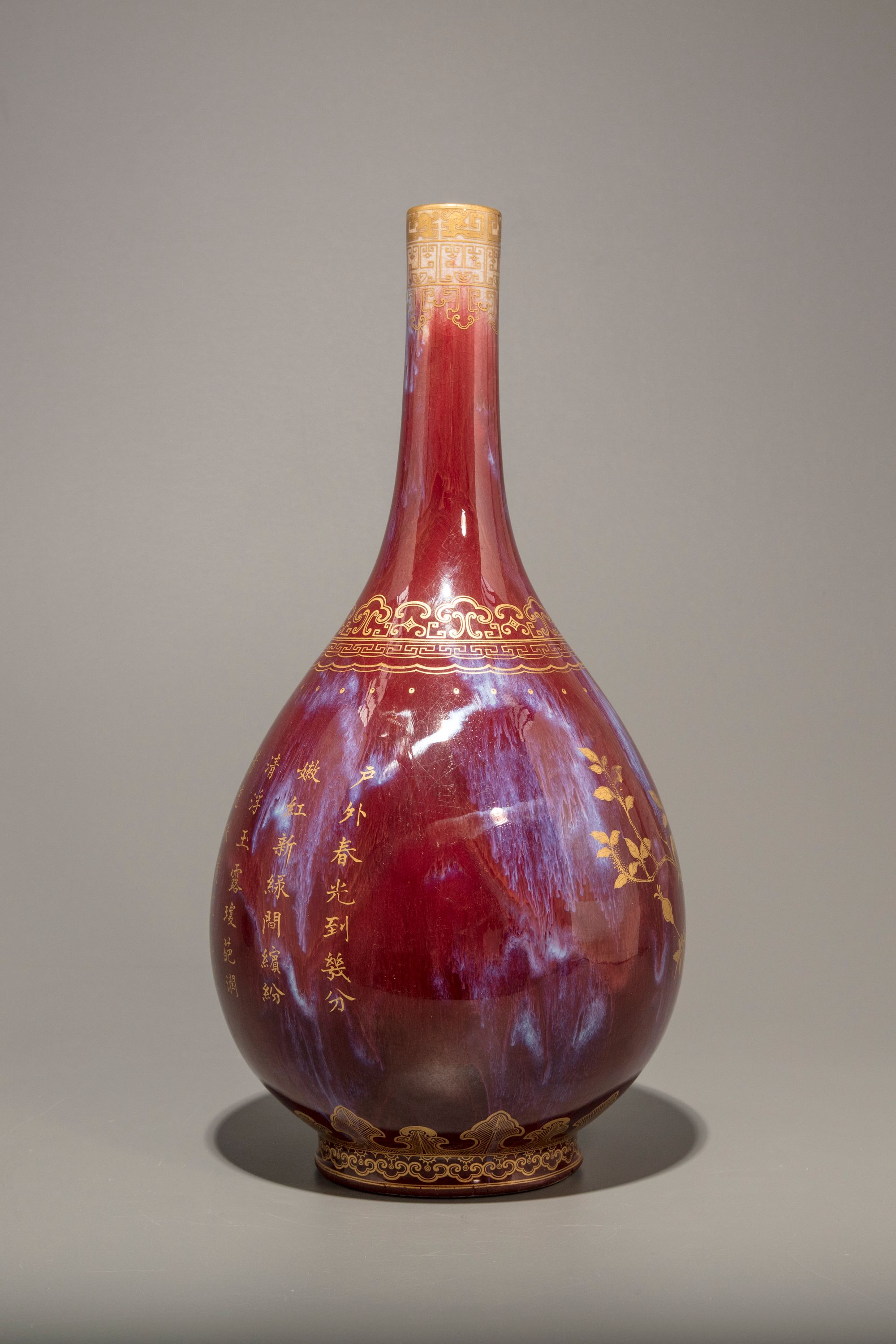 The vase is decorated later gilt to one side with peonies, roses, and millet, and to the other side with a Qianlong poem, all above a lappet band to the foot and a stylised ruyi-head band to the shoulder. The neck is decorated with archaistic kui dragons and a geometric band. The vase is covered overall with a strawberry-red glaze with purple streaks, the base is covered in a cafe-au-lait glaze.