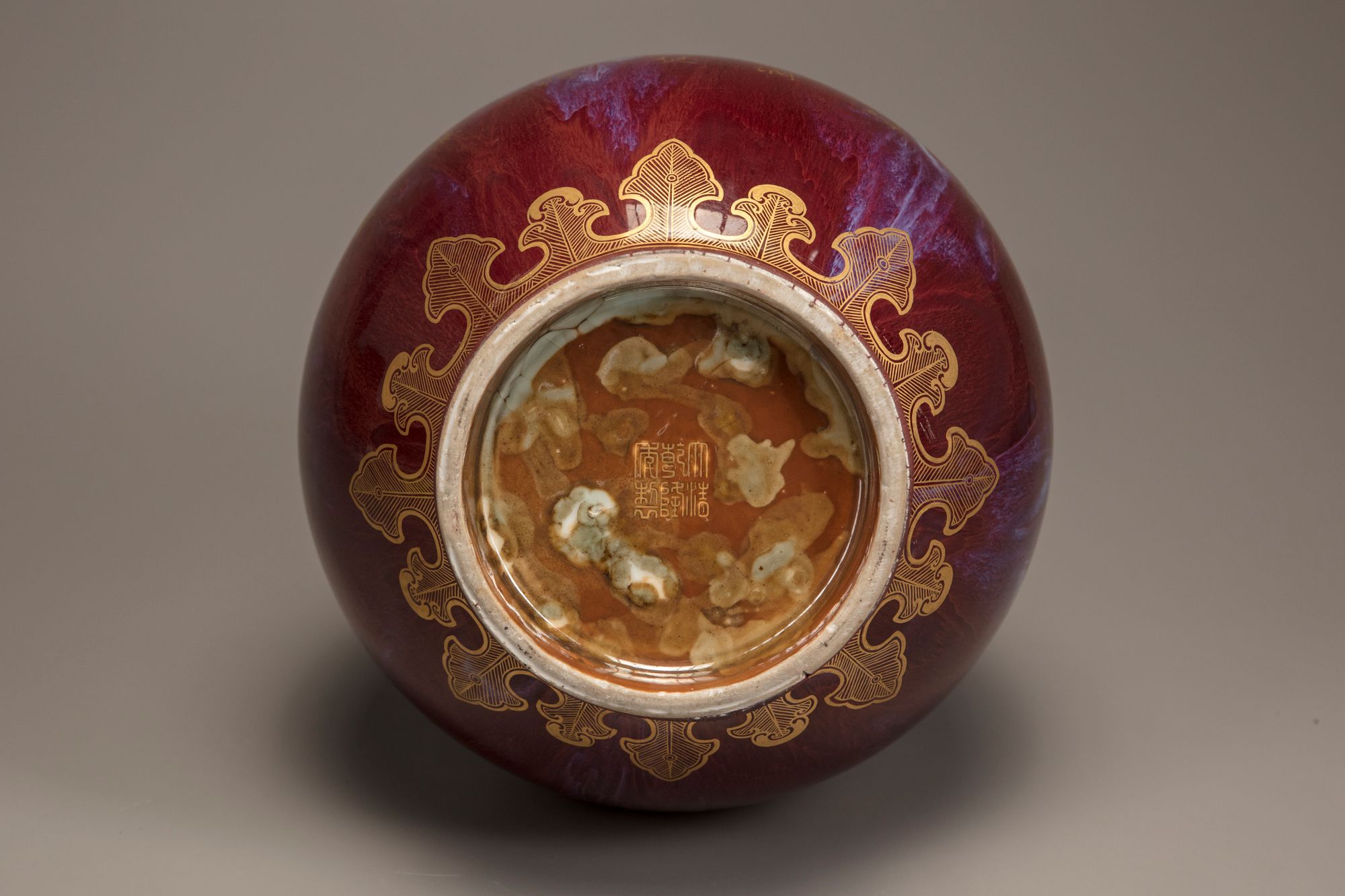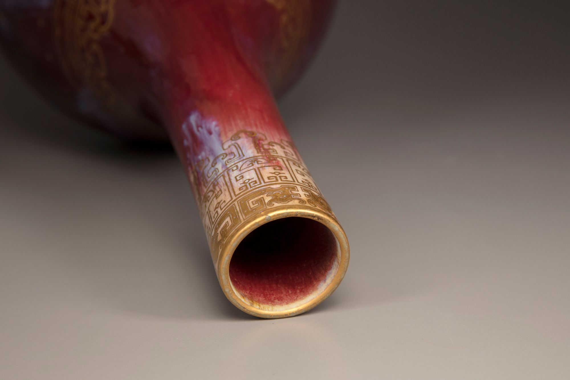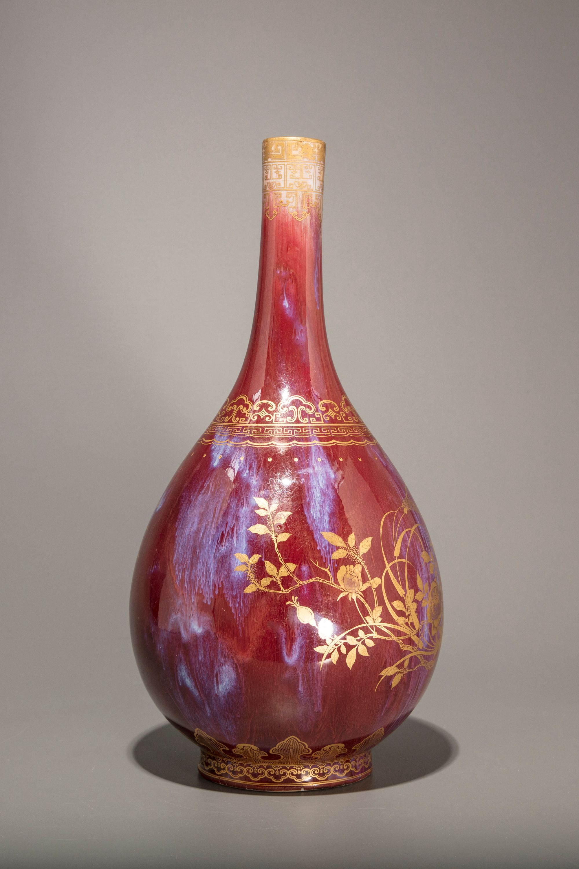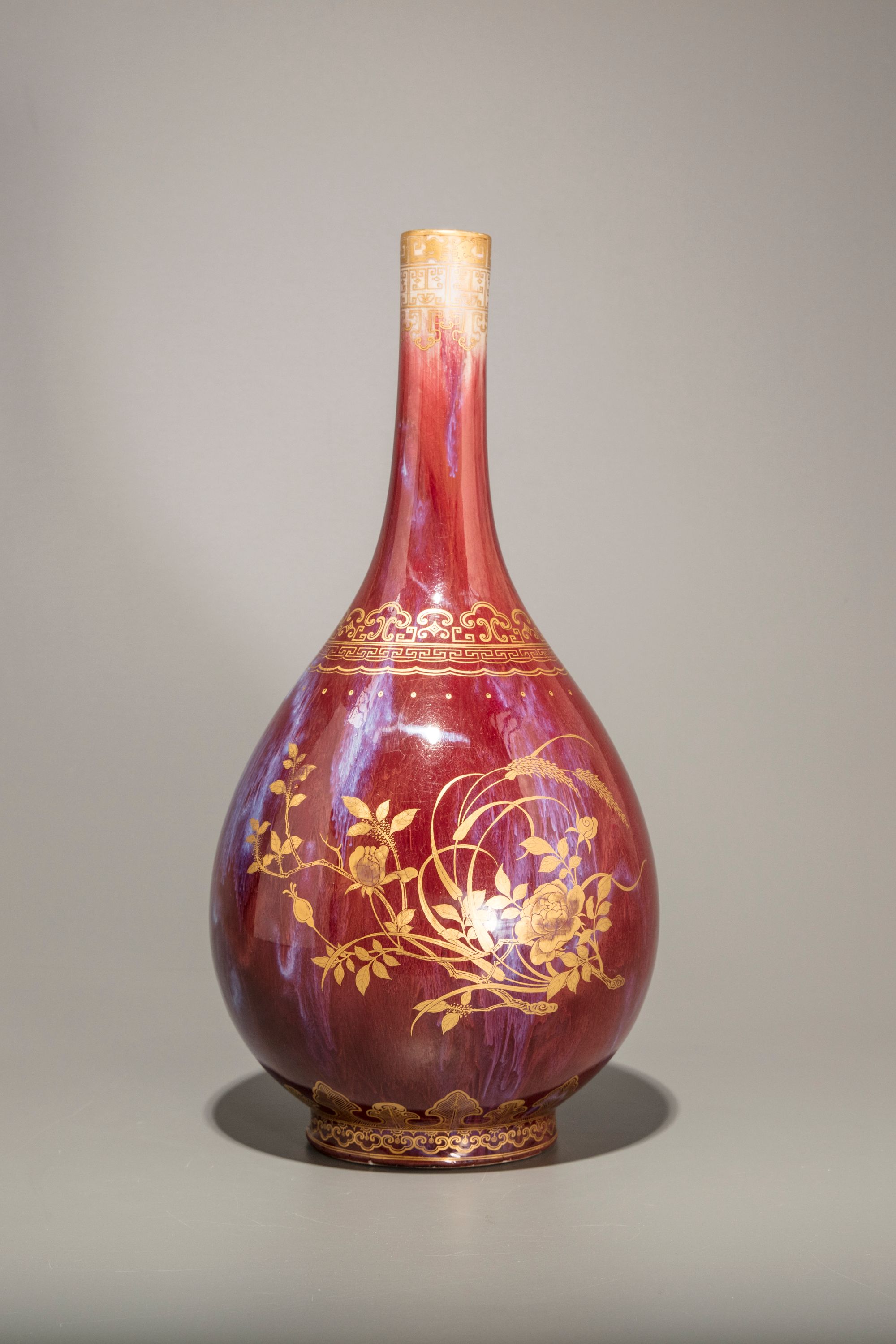 The vase is decorated later gilt to one side with peonies, roses, and millet, and to the other side with a Qianlong poem, all above a lappet band to the foot and a stylised ruyi-head band to the shoulder. The neck is decorated with archaistic kui dragons and a geometric band. The vase is covered overall with a strawberry-red glaze with purple streaks, the base is covered in a cafe-au-lait glaze.