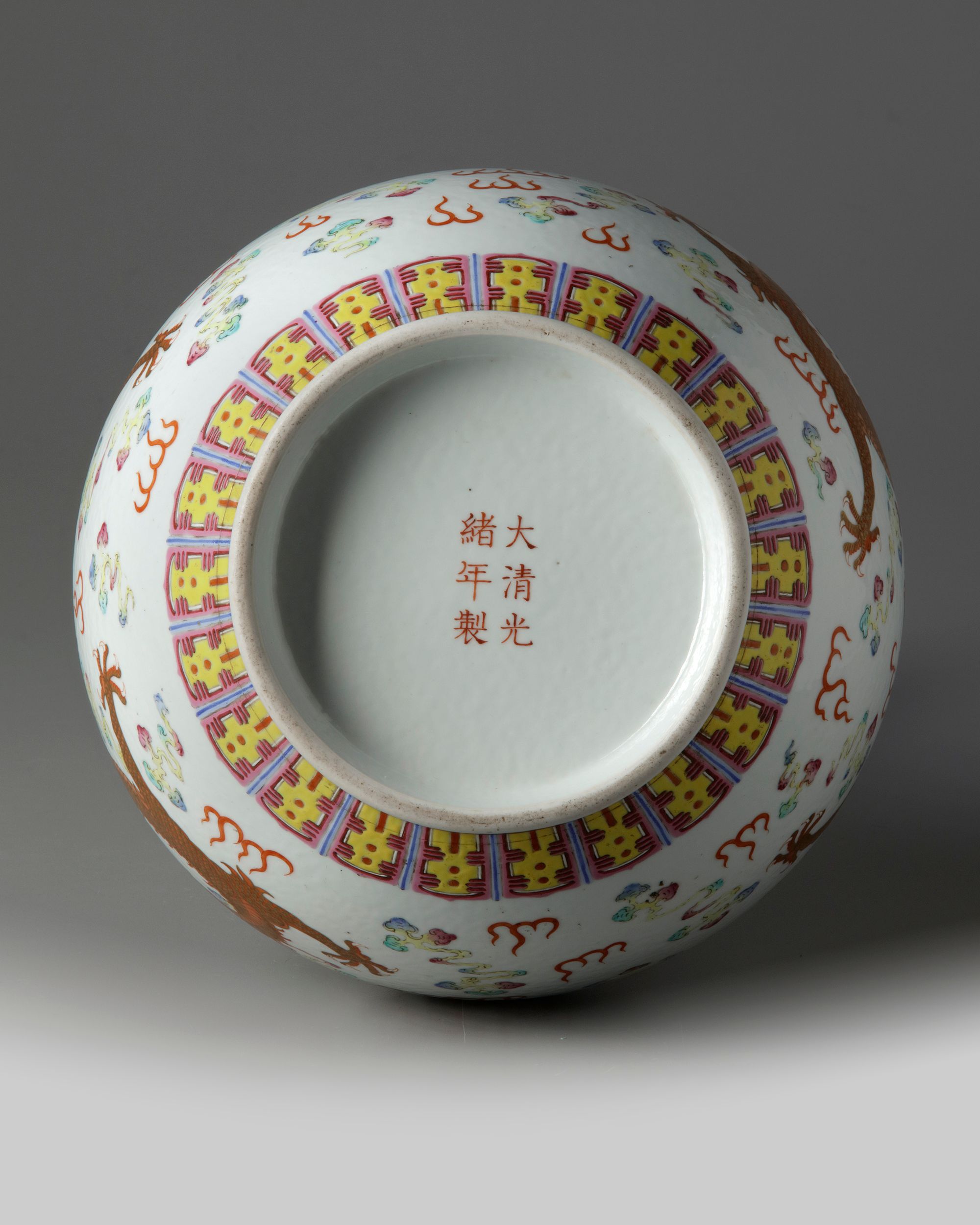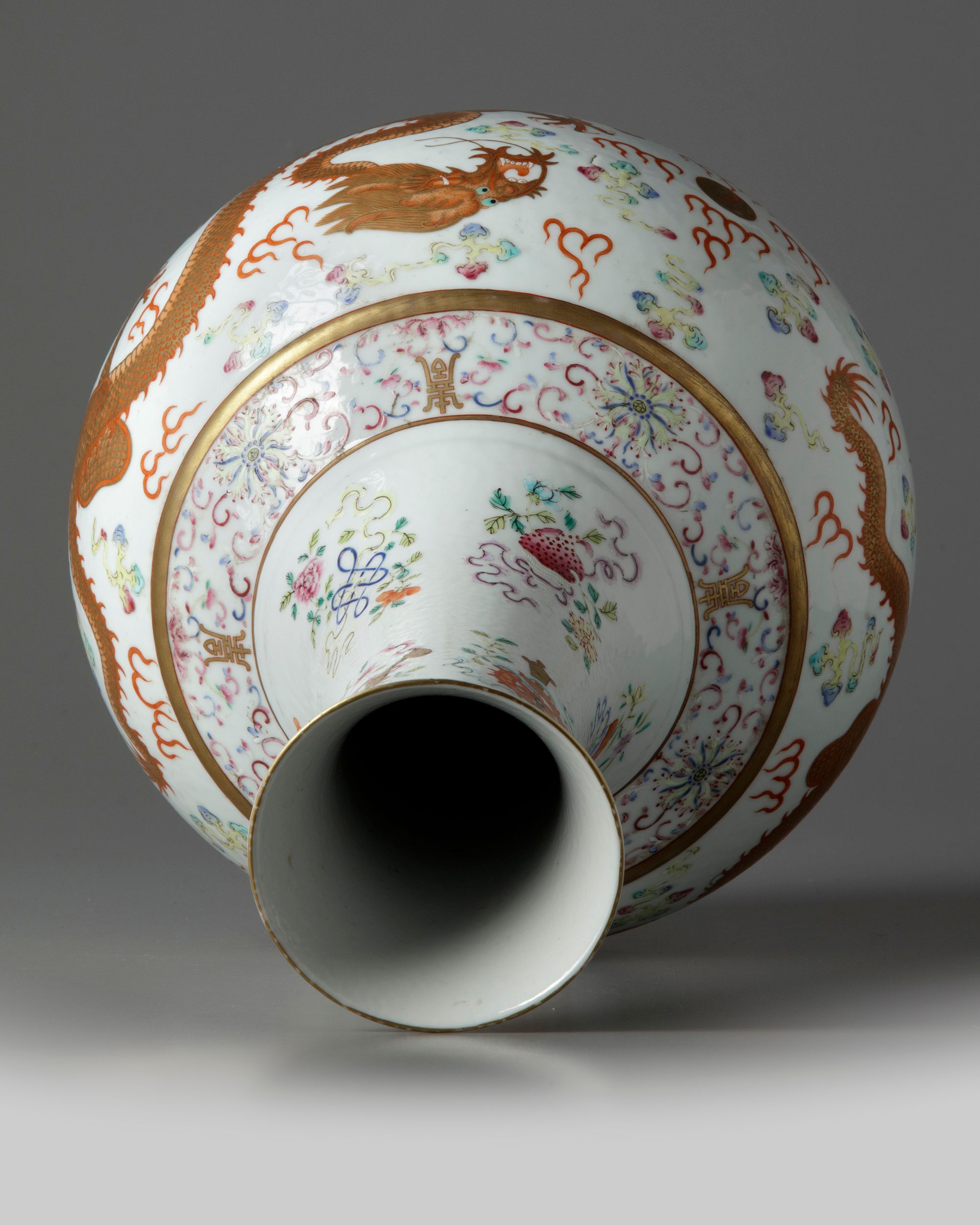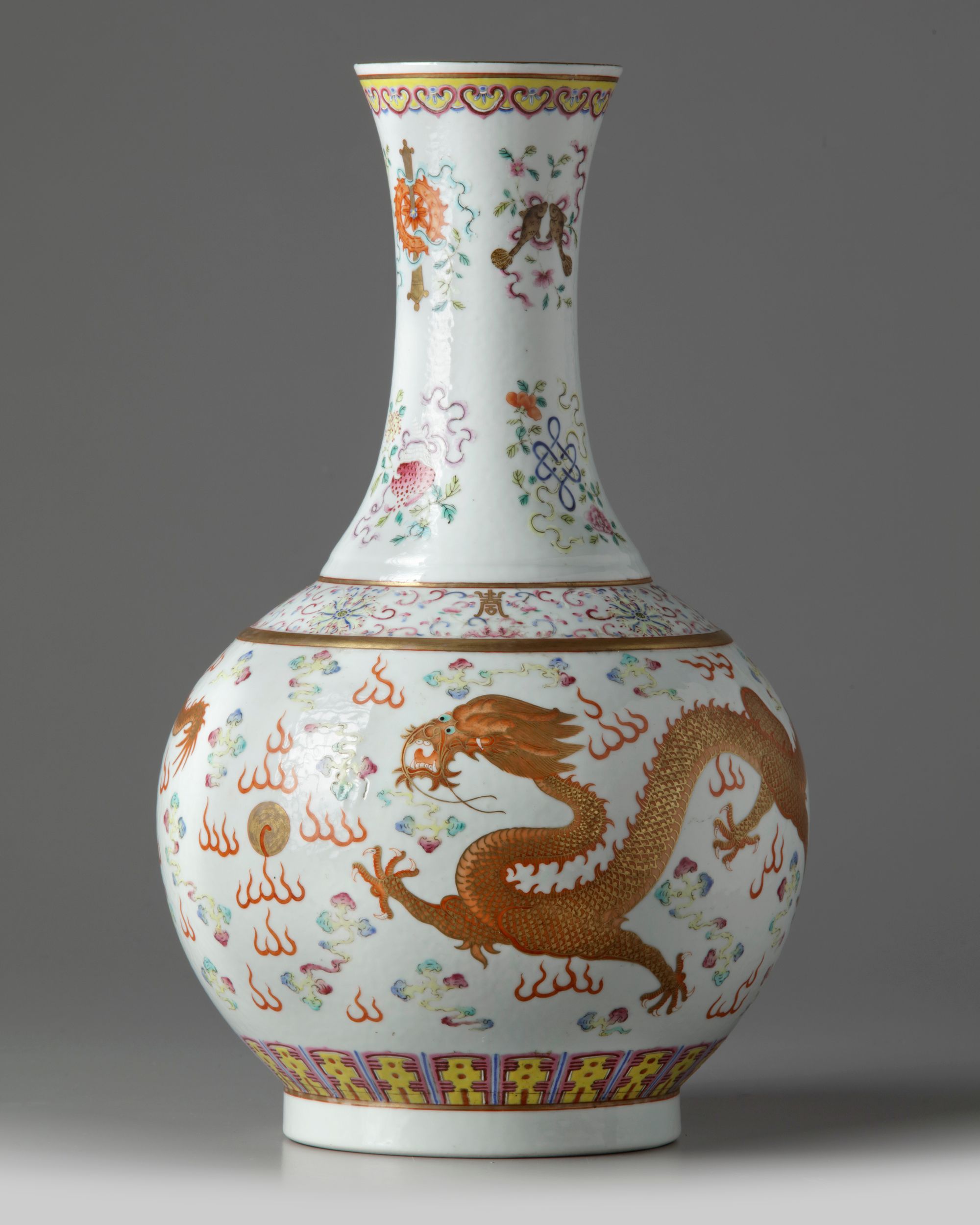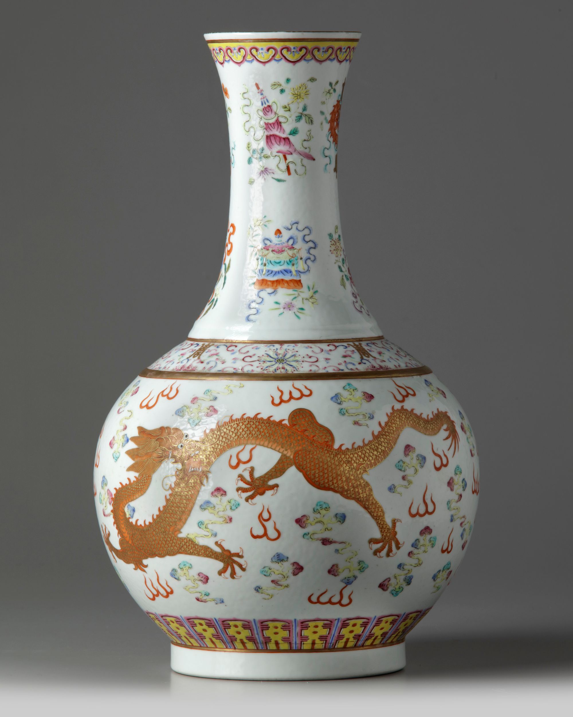 The vase is decorated to the body with two striding dragons chasing the flaming pearl amongst flame and cloud scrolls, all below a band of gilt shou characters and flower scrolls to the shoulder. The neck is decorated with the Eight Buddhist Emblems, all below a band of ruyi heads to the rim. The base with an apocryphal Guangxu mark.