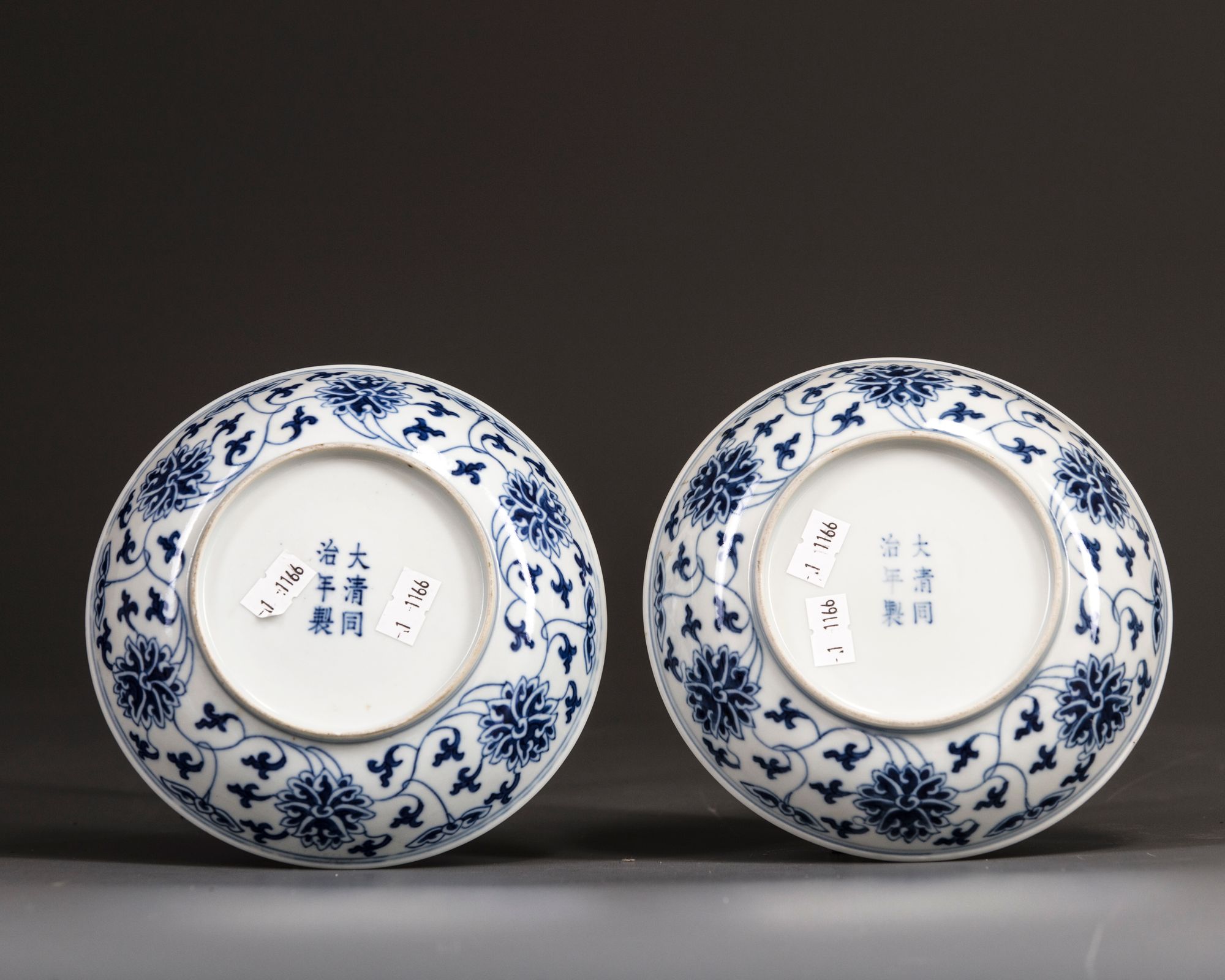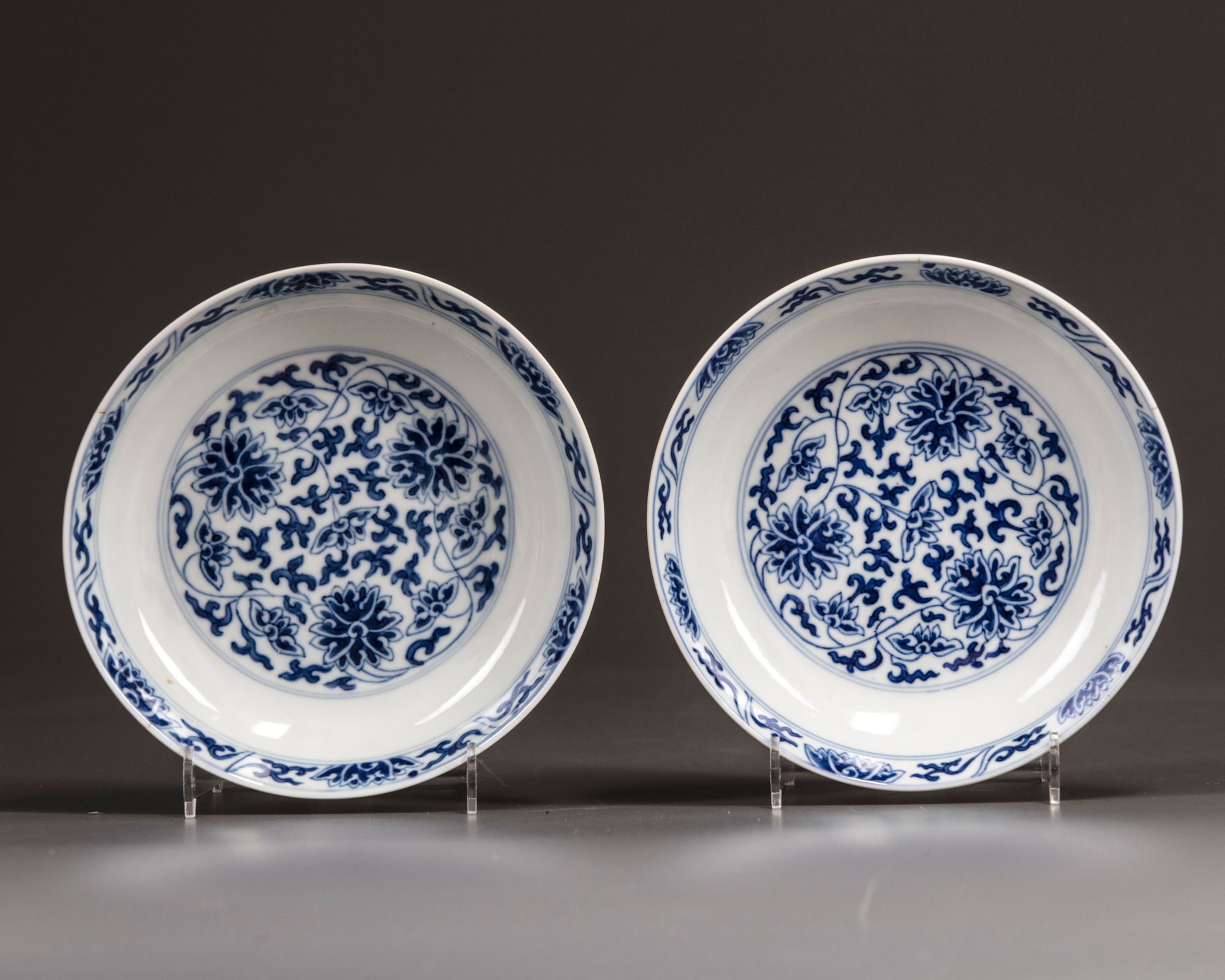 Each dish is decorated to the centre with a roundel enclosing densely scrolling lotus. Each rim is decorated with lotus heads and scrolling vines. Each reverse is decorated with further scrolling lotus heads.