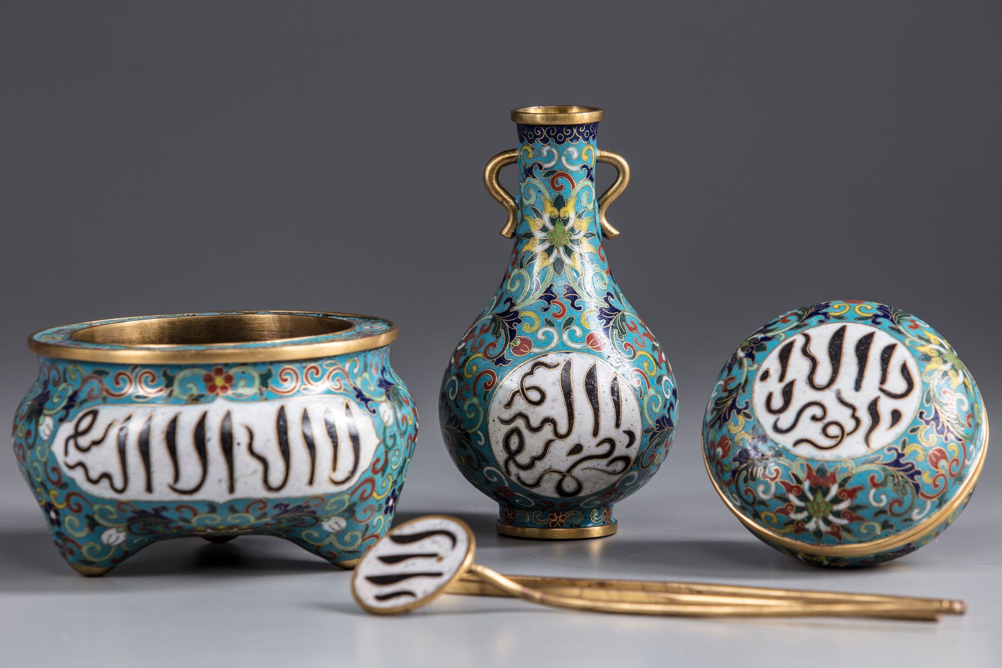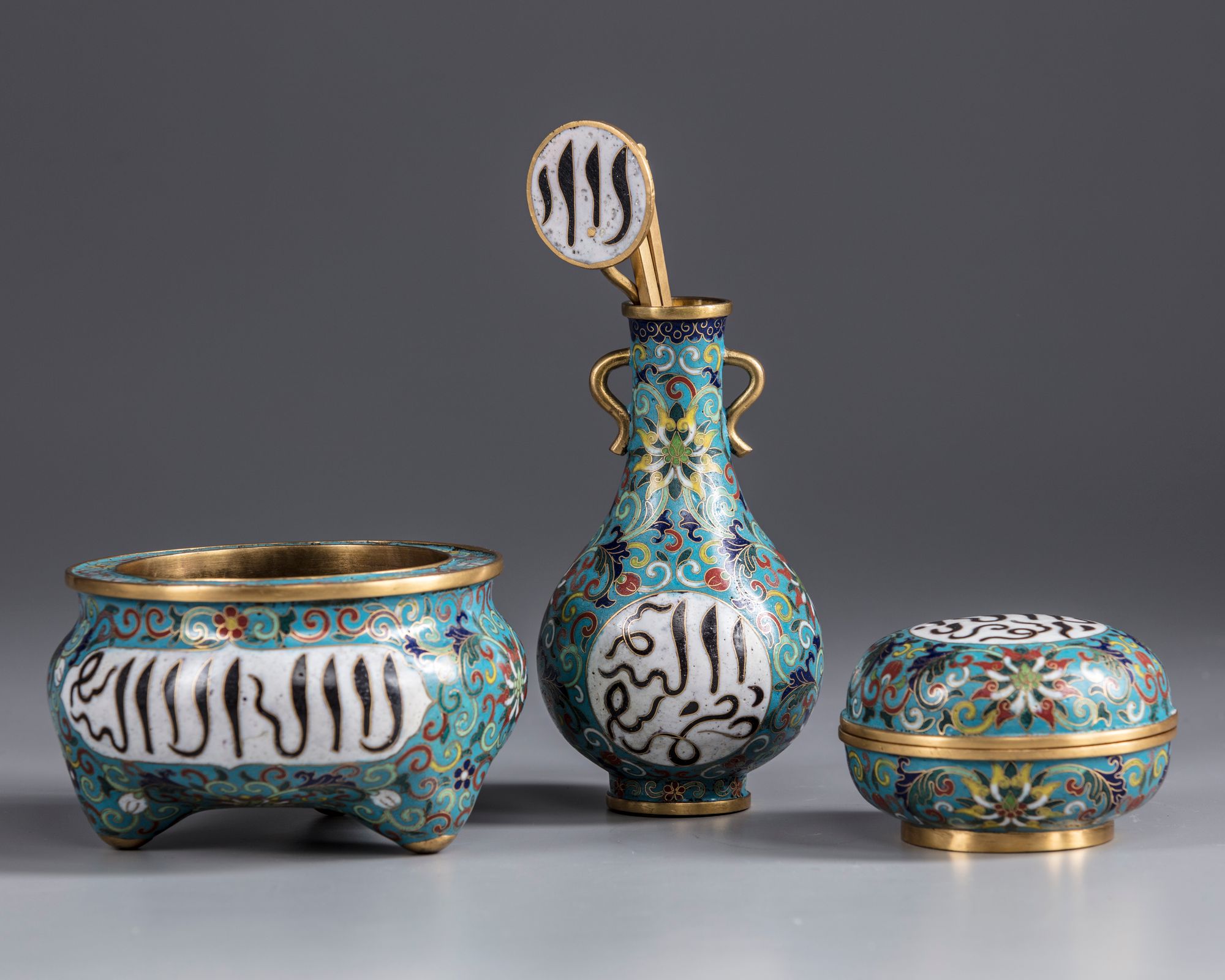 The set comprises a tripod censer, a twin-handled tool vase with three tools, and a round box and cover. Each piece is similarly decorated with a panel enclosing an wish in Arabic, surrounded by densely scrolling leafy lotus, all reserved on a turquoise ground.
