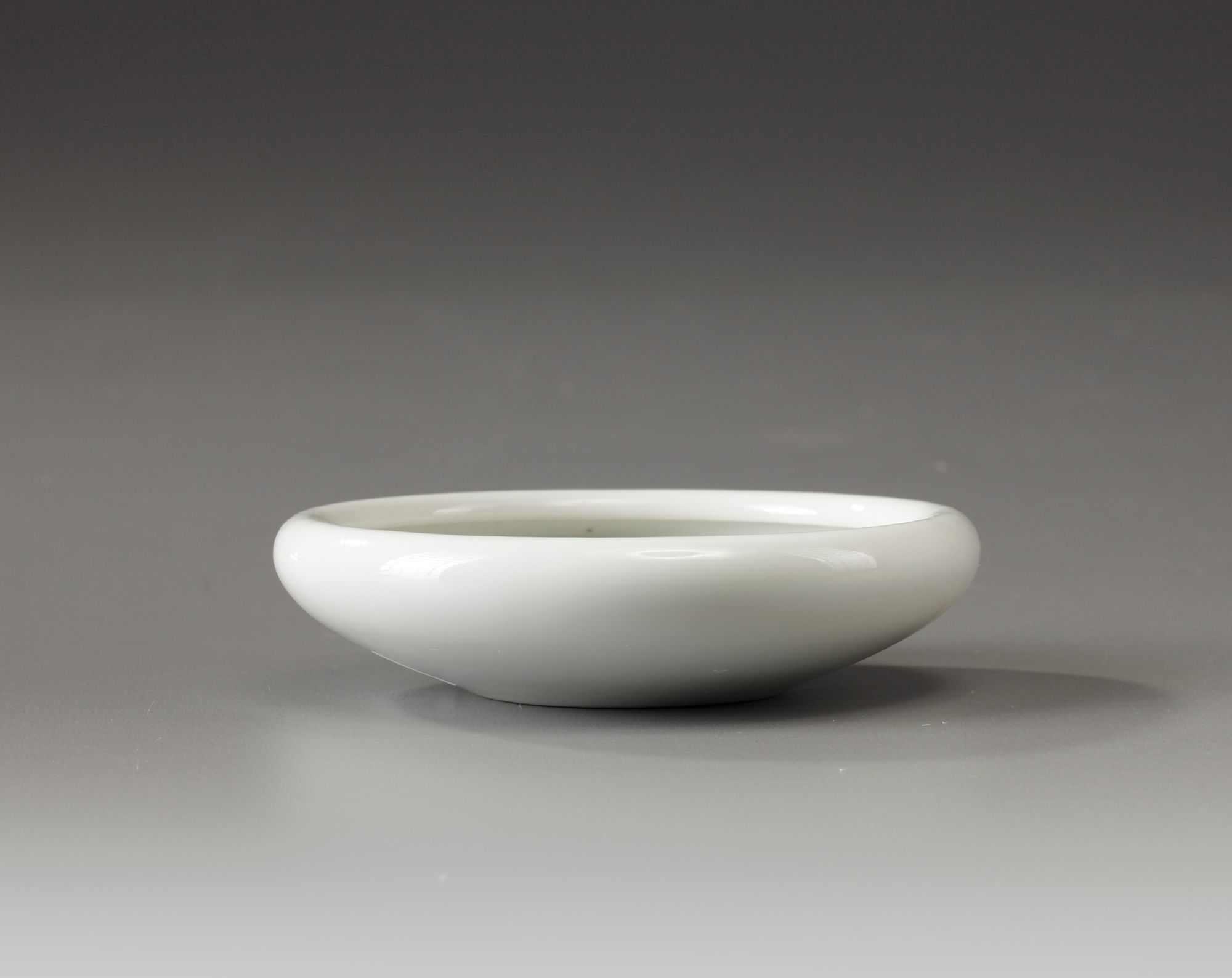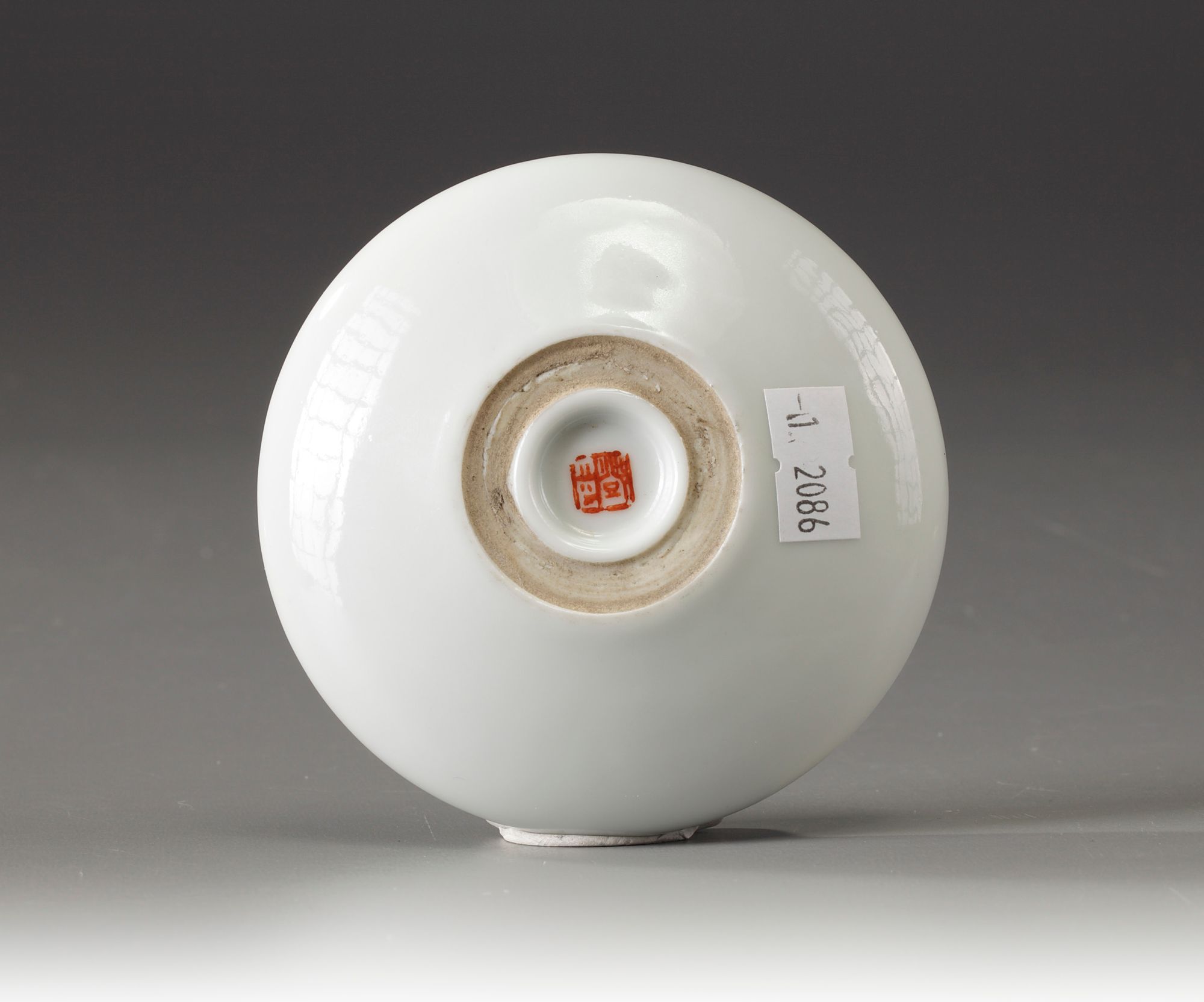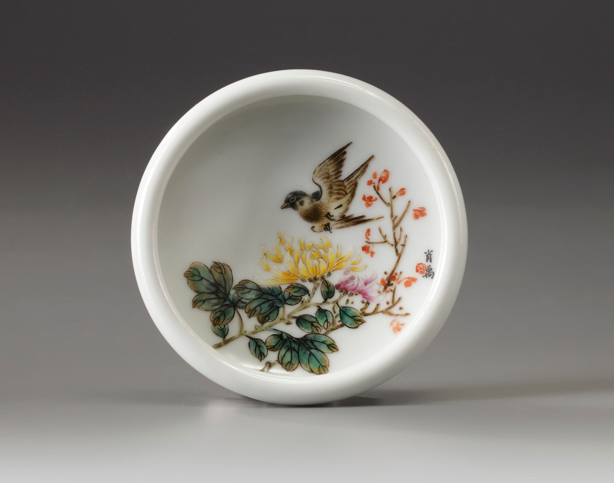 The brush washer is decorated with a bird in flight above a flowering chrysanthemum branch. The interior is signed with one iron red seal, the base with a further iron red seal reading 'tang yin' (hall seal).