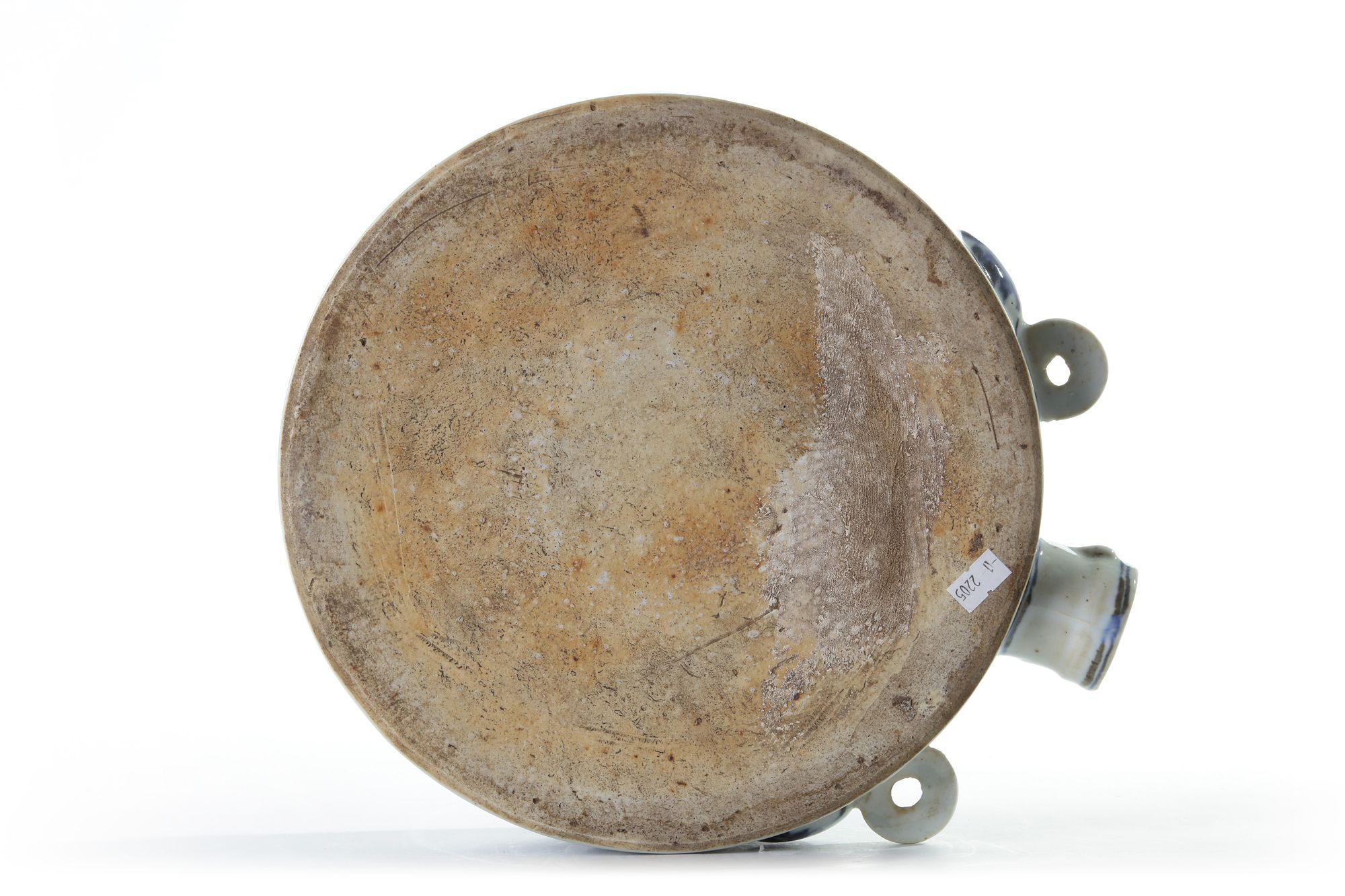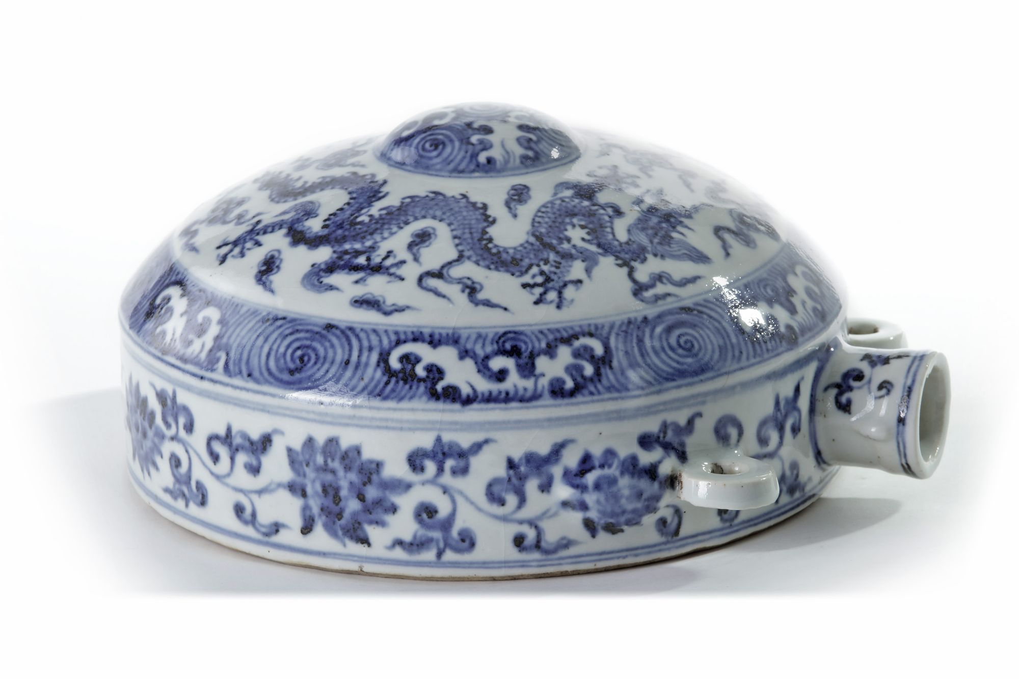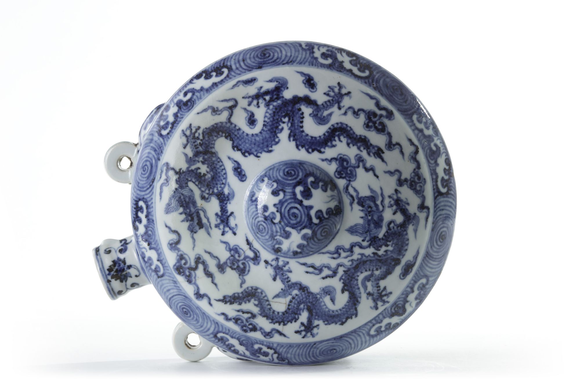 The circular vase is decorated with two circular handles to the shoulder and the body is moulded with a raised circular panel decorated with foaming waves, flanked by two dragons in flight. The edge is bordered with a further foaming wave band. The narrow sides and the neck are decorated with lotus scrolls. With a flat unglazed reverse.