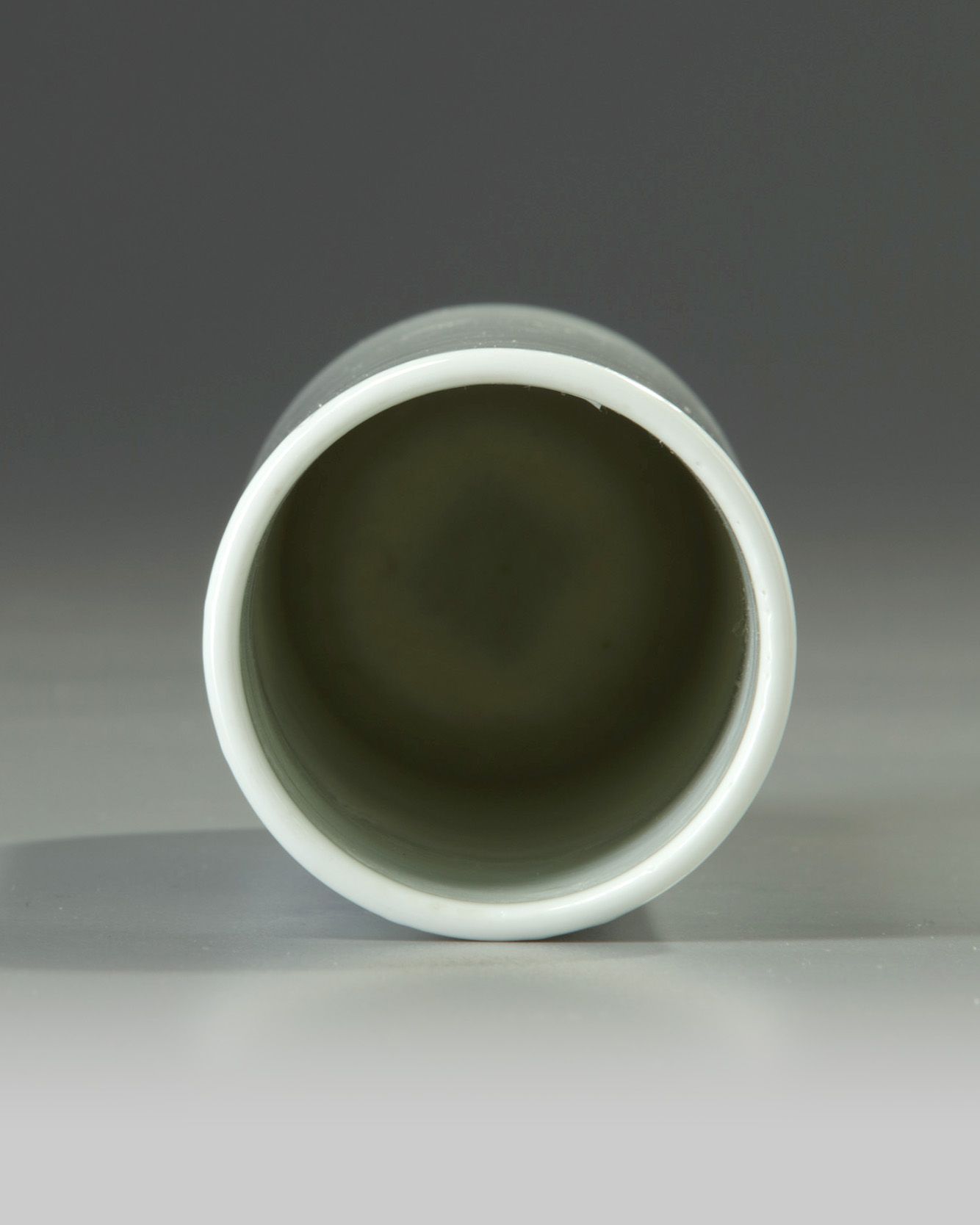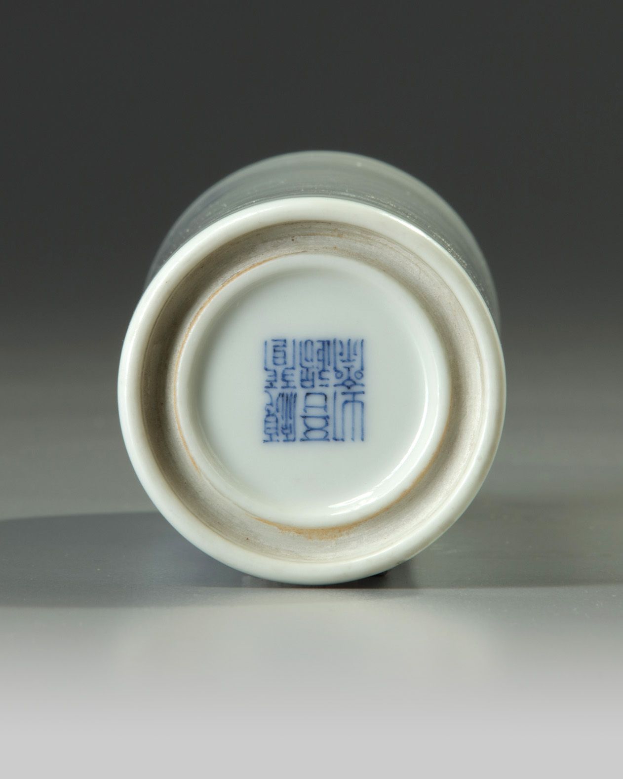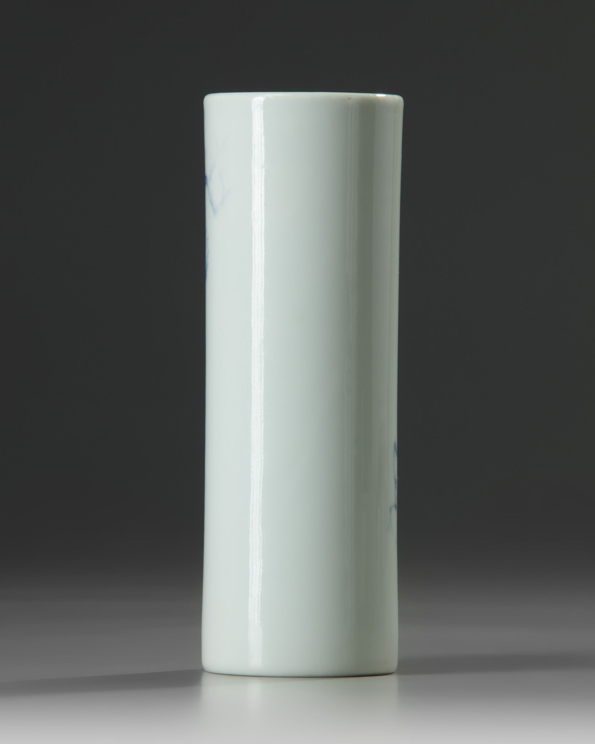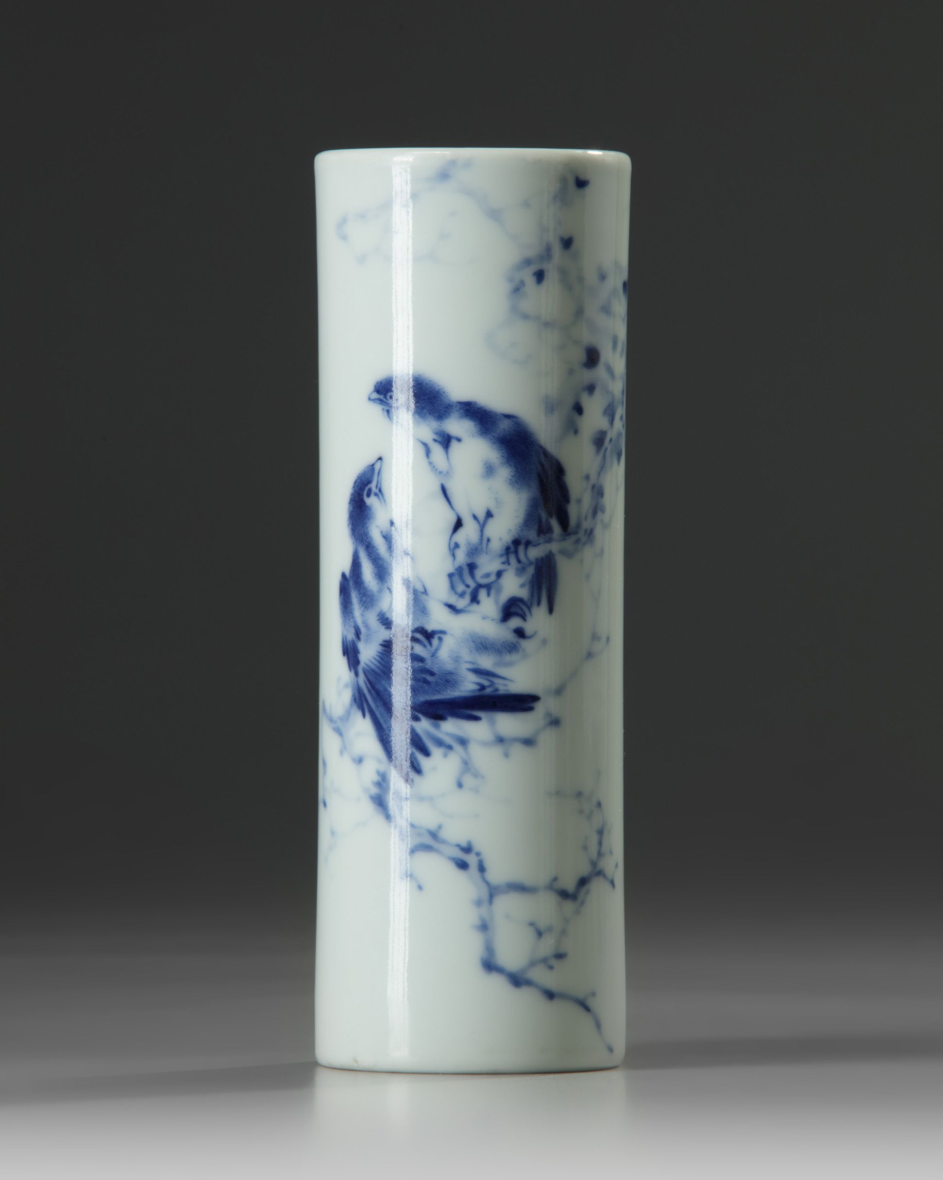 The cylindrical brush pot is delicately decorated in underglaze blue with two chicks perched on a gnarled branch executed in washed blue tones. The feathers of the birds are finely detailed. The base with the seal mark 'yuan wen wu guo zhi zhai' in underglaze blue, which is attributed to Wang Bu.