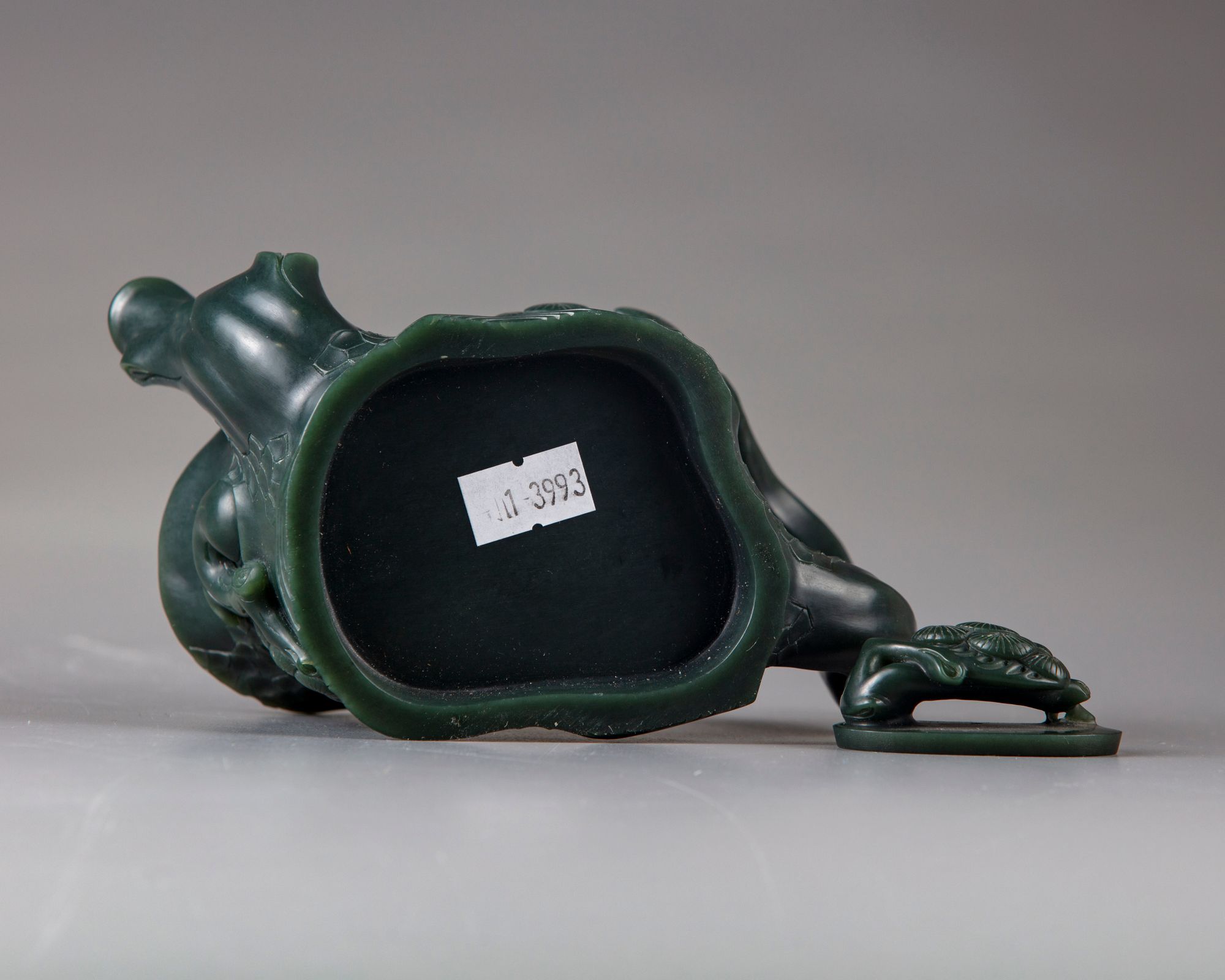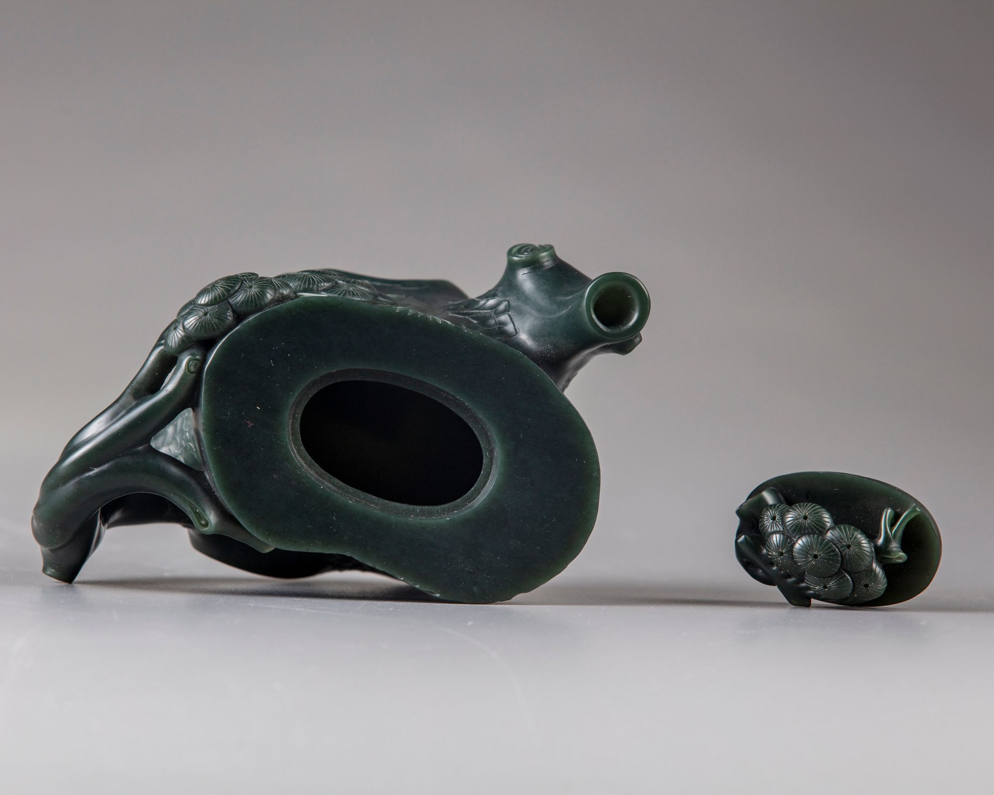 The spinach jade teapot is modelled as a pine trunk , with short straight spout and a pine tree shaped handle, with blossoming branches in high relief around the teapot.
