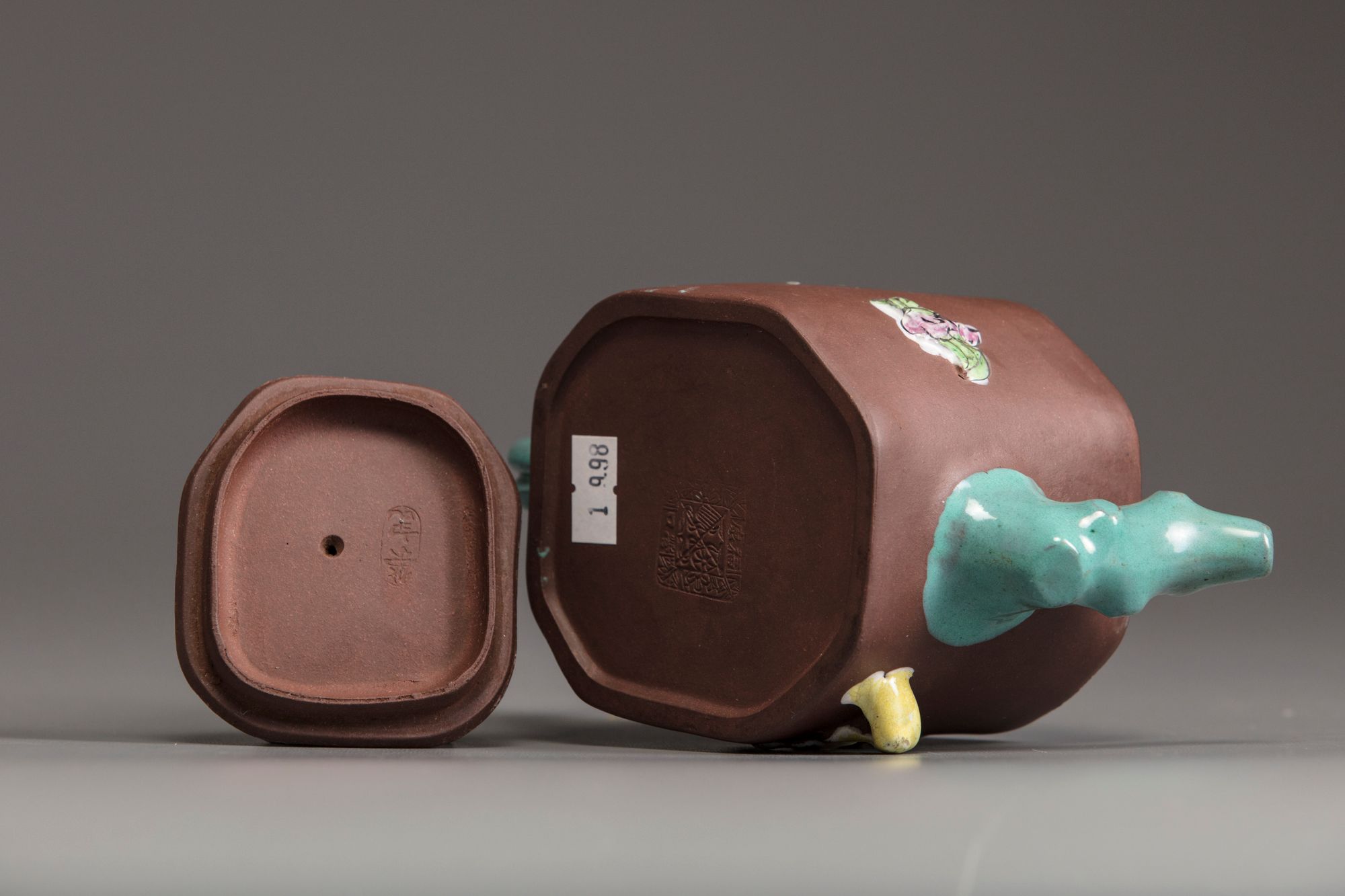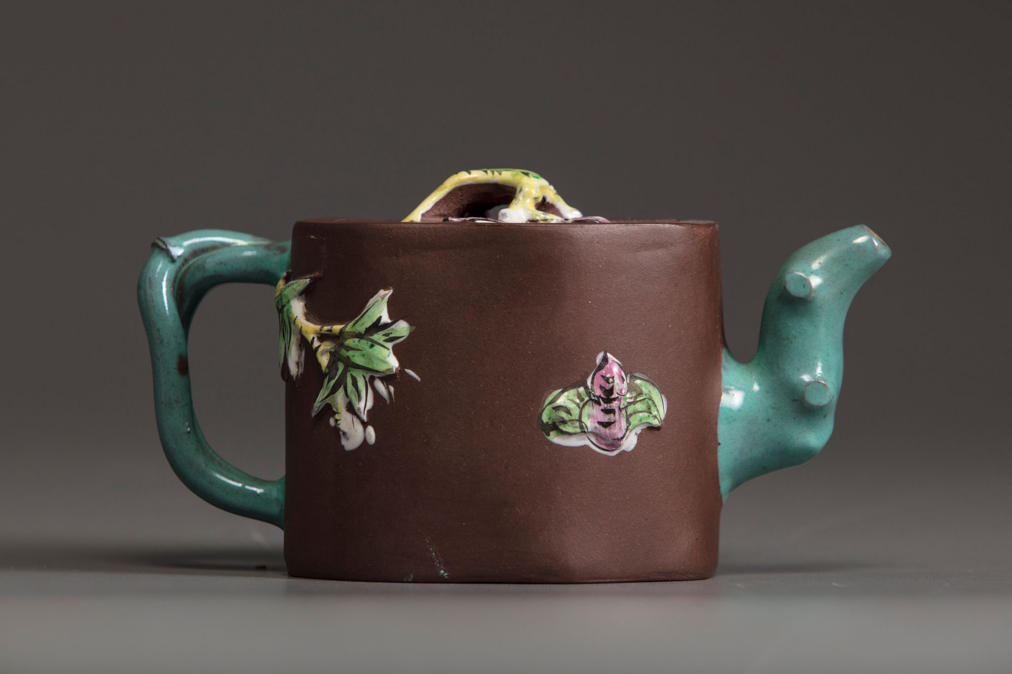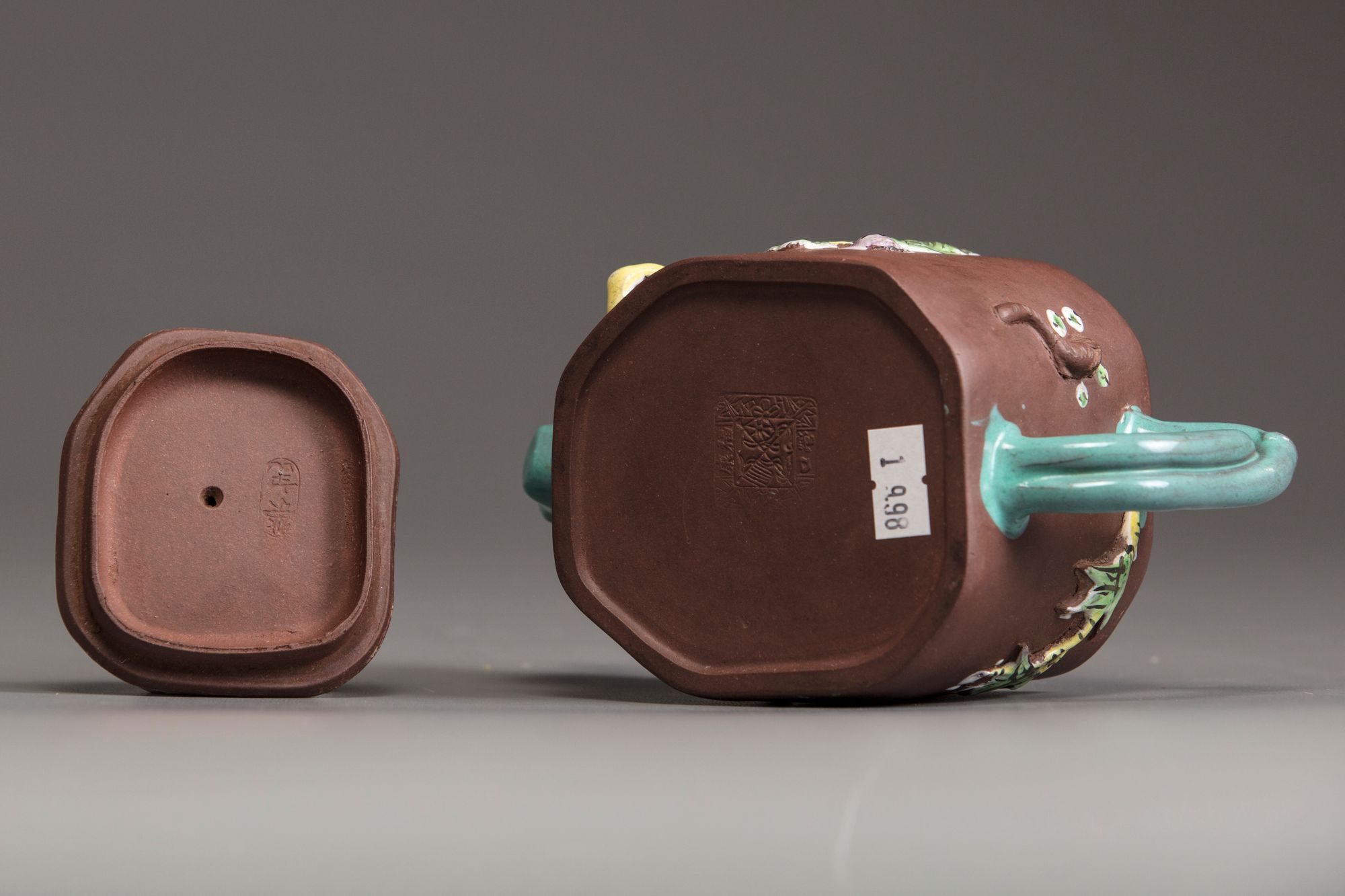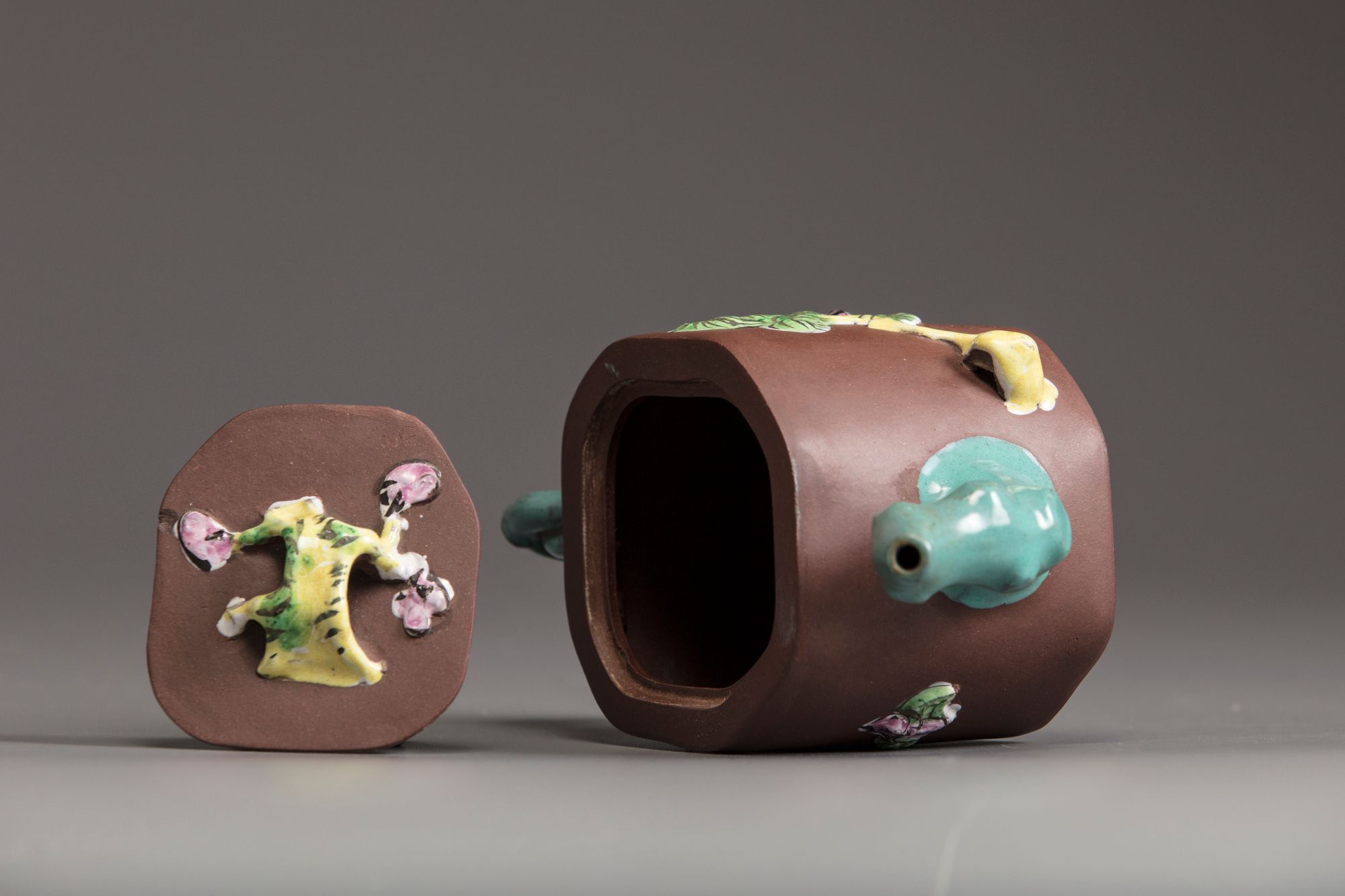 The teapot is decorated with enamelled moulded Three Friends of Winter (pine, bamboo, prunus), the green-enamelled handle is modelled as a double twist and the spout is enamelled green. The base is stamped with a ‘Fukang Yingkou' mark and the underside of the cover is marked 'Rong Ji'.